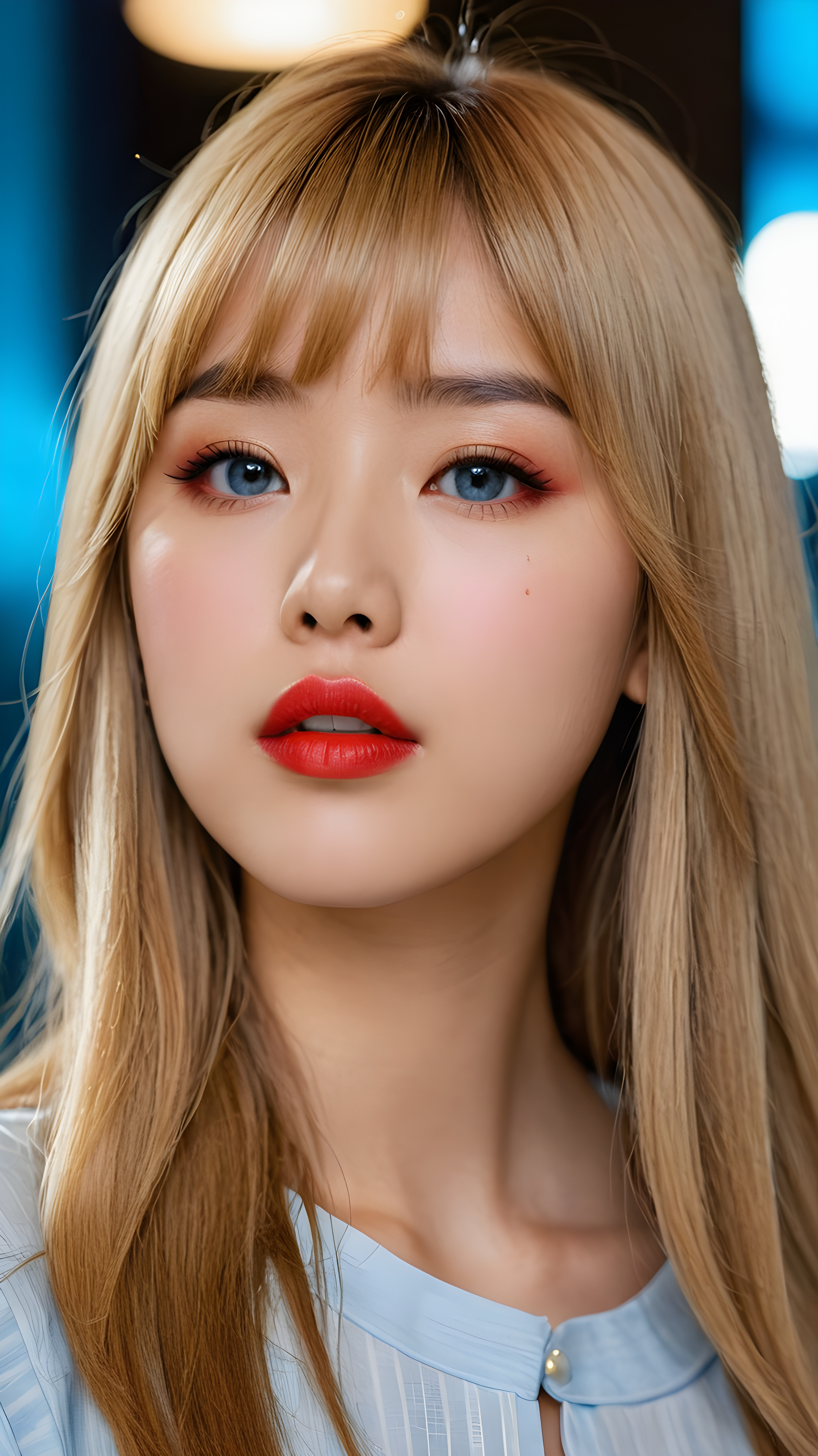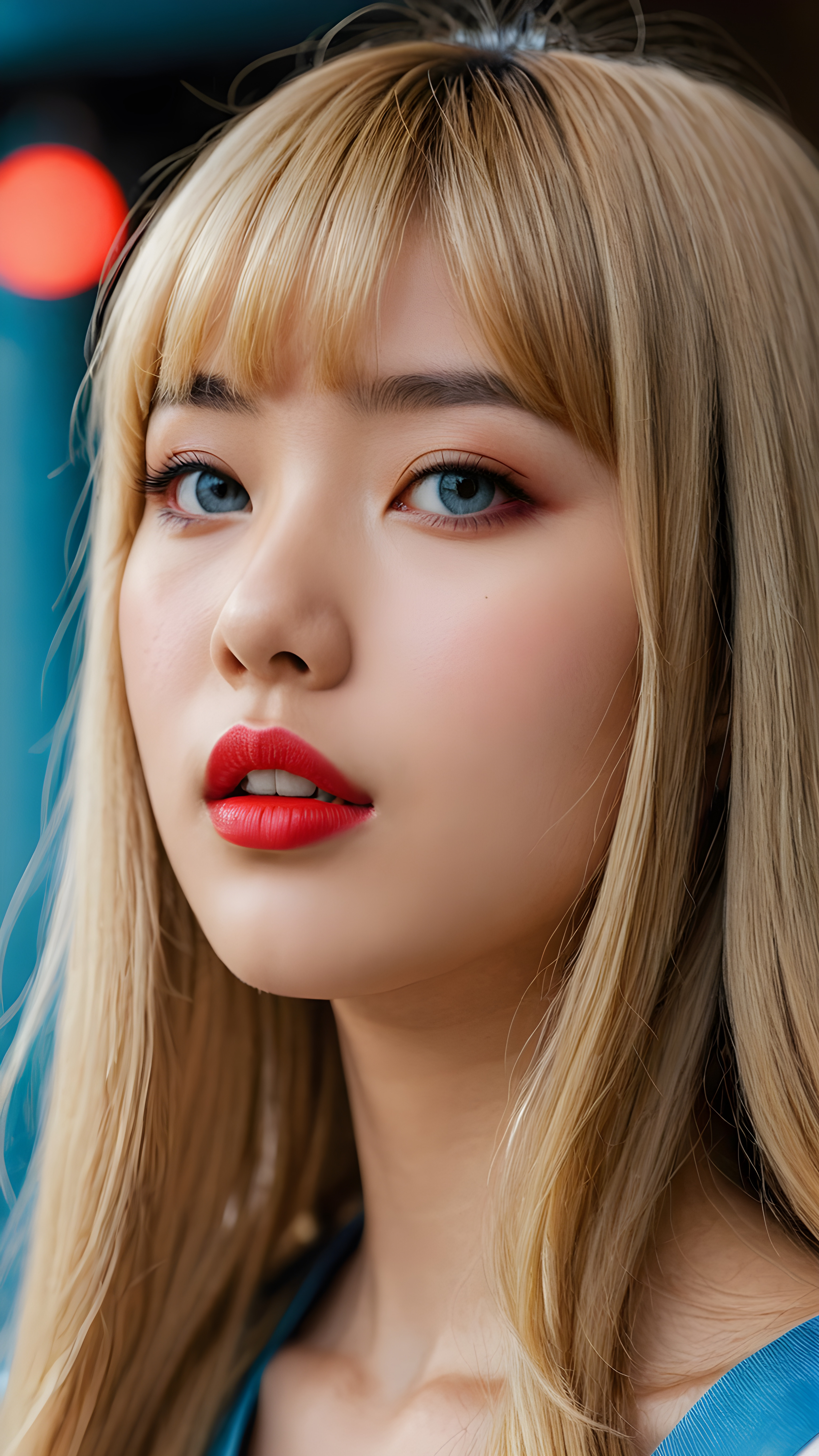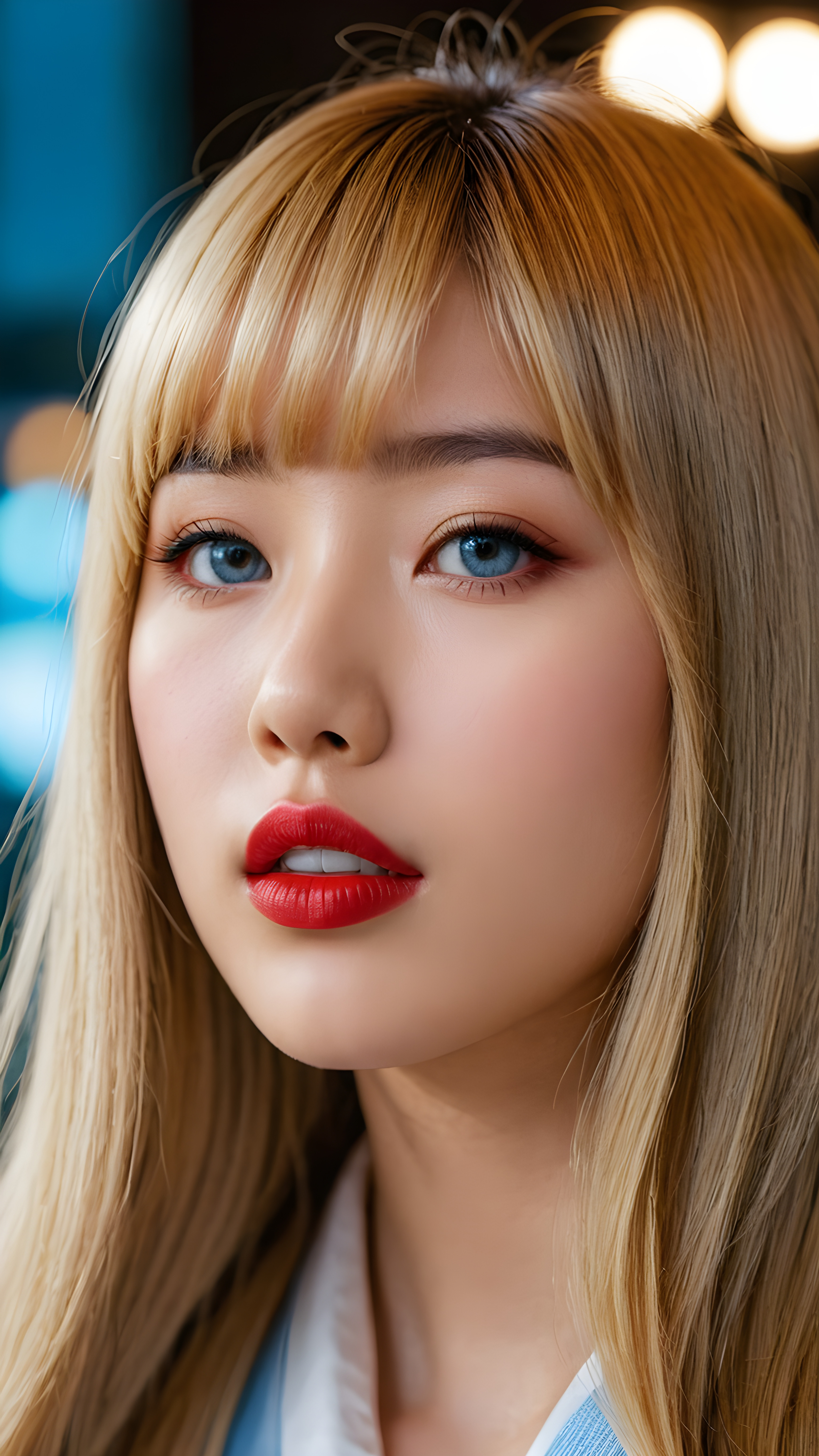 create a detailed and masterpice of (side view) portrait: a Japanese teen girl, long blond soft straight hair, bangs, she looks astonished and her mouth is slightly open, ((her eyes are light blue)) ((full red lips)) ((round face)) perfect shadows and light