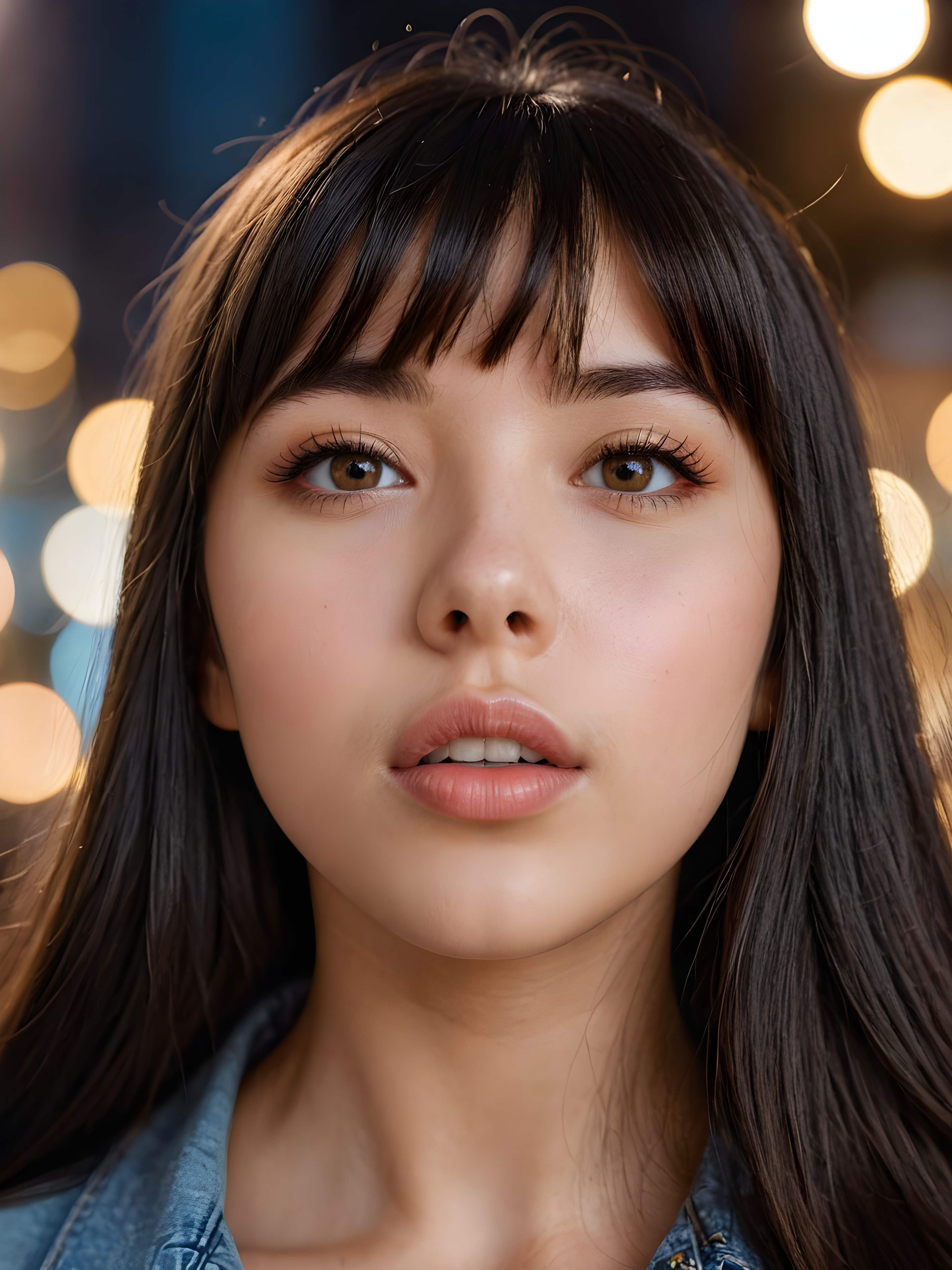 create a detailed and masterpice of close-up portrait: a teen girl, long, black soft straight hair, bangs, she looks astonished and her mouth is slightly open, ((her eyes are light brown)) ((full lips)) perfect shadows and light