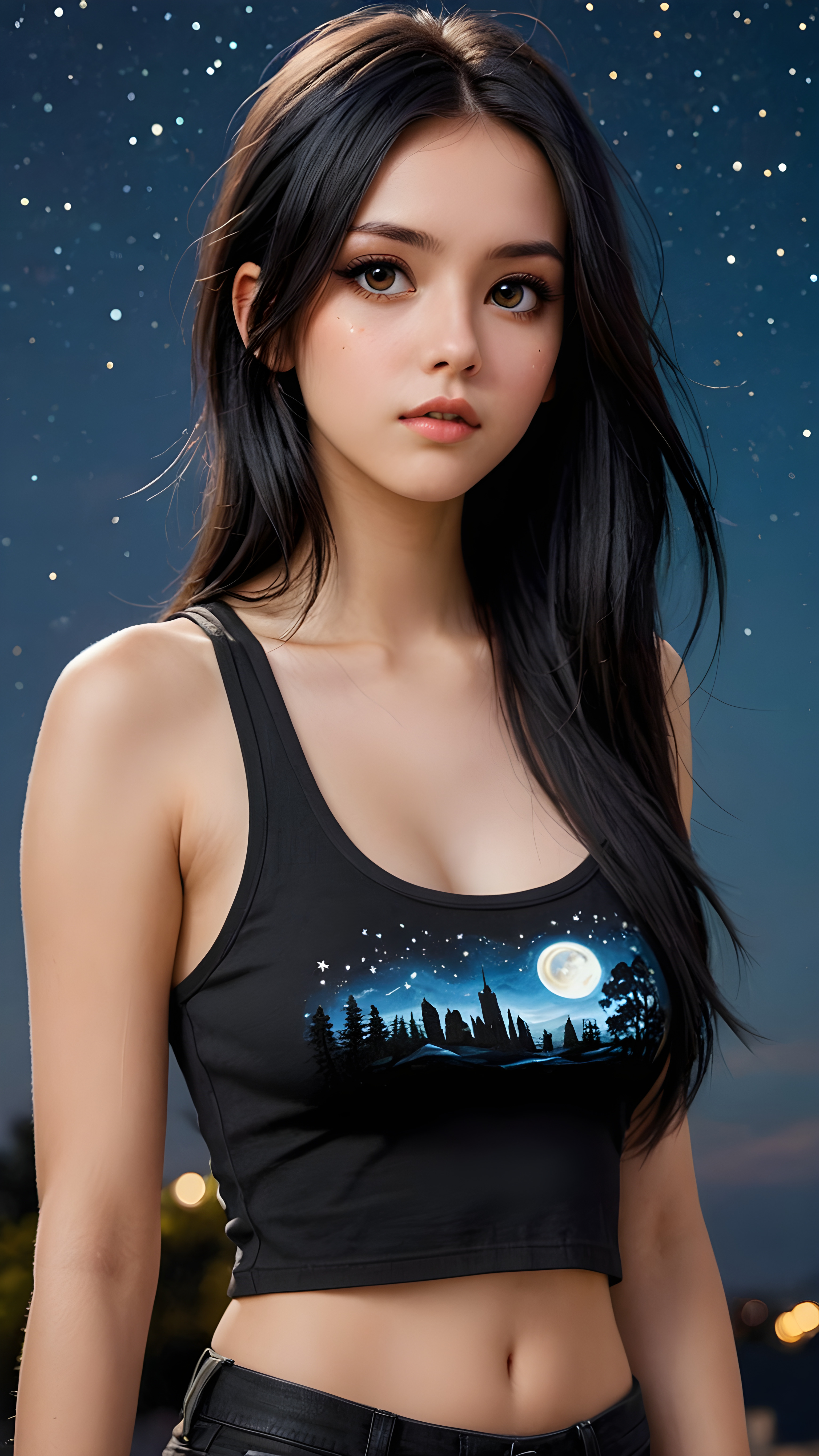 generate a photorealistic image of a (((realistically drawn passionate emo girl with long soft black straight hair, wears a short form-fitting cropped tank top, caught in a moment of surprise))) featuring intricate details and realistic textures that mimic the look of (((amber eyes))), paired with a (((starry night sky))) backdrop. The scene should embody the (((passionately emotive style))) associated with the name, bringing together the (softly twinkling starlight) and (deeply felt emotional depth) that define this captivating aesthetic
