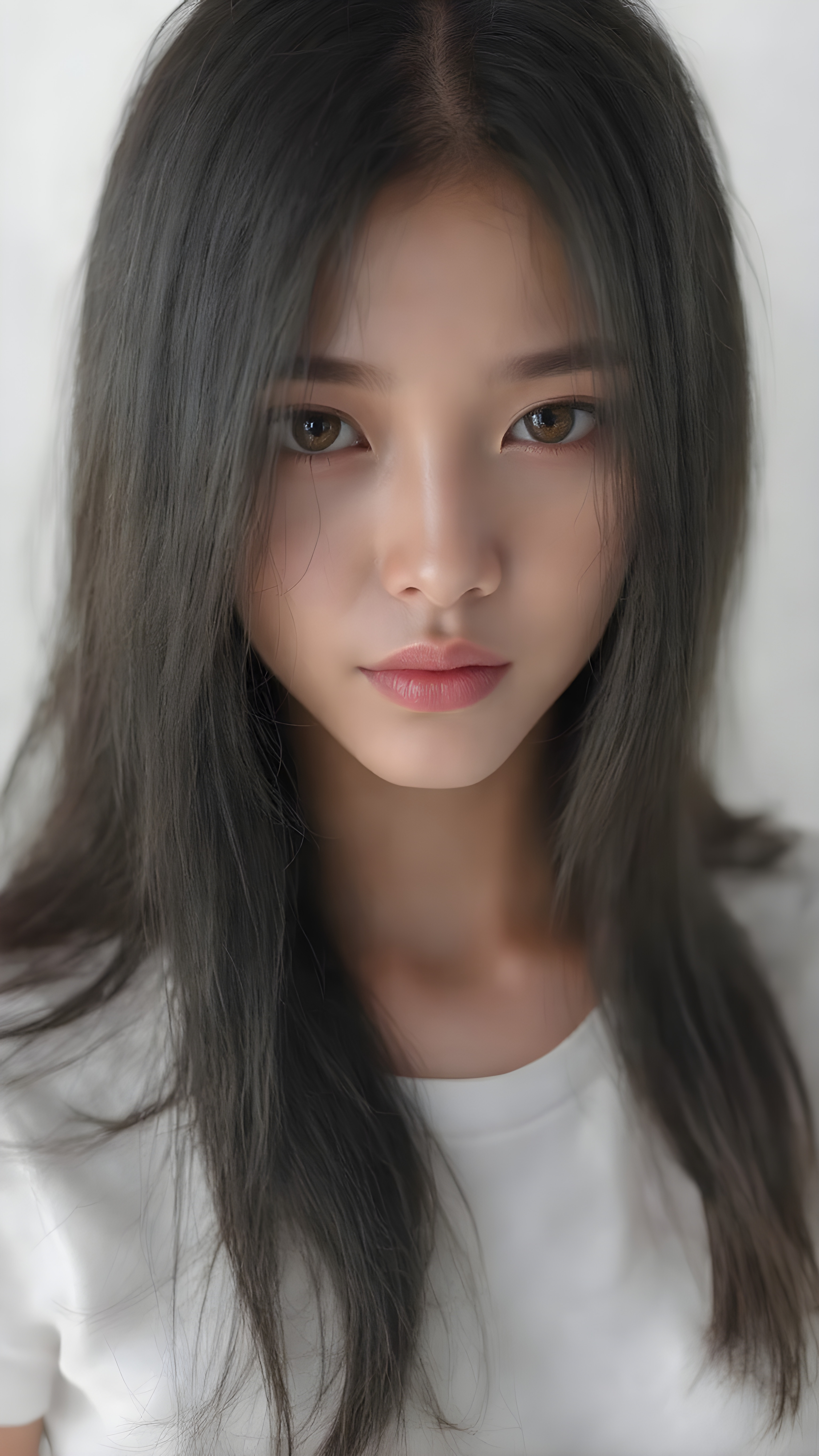 a beautiful, young Asian and Oriental teen girl, ((soft raven black jet straight hair)) ((detailed and realistic hair)), big round amber eyes, ((detailed, realistic photo)) ((perfect curved body)) ((gorgeous)) ((stunning)) ((cute)), she wears a white short t-shirt