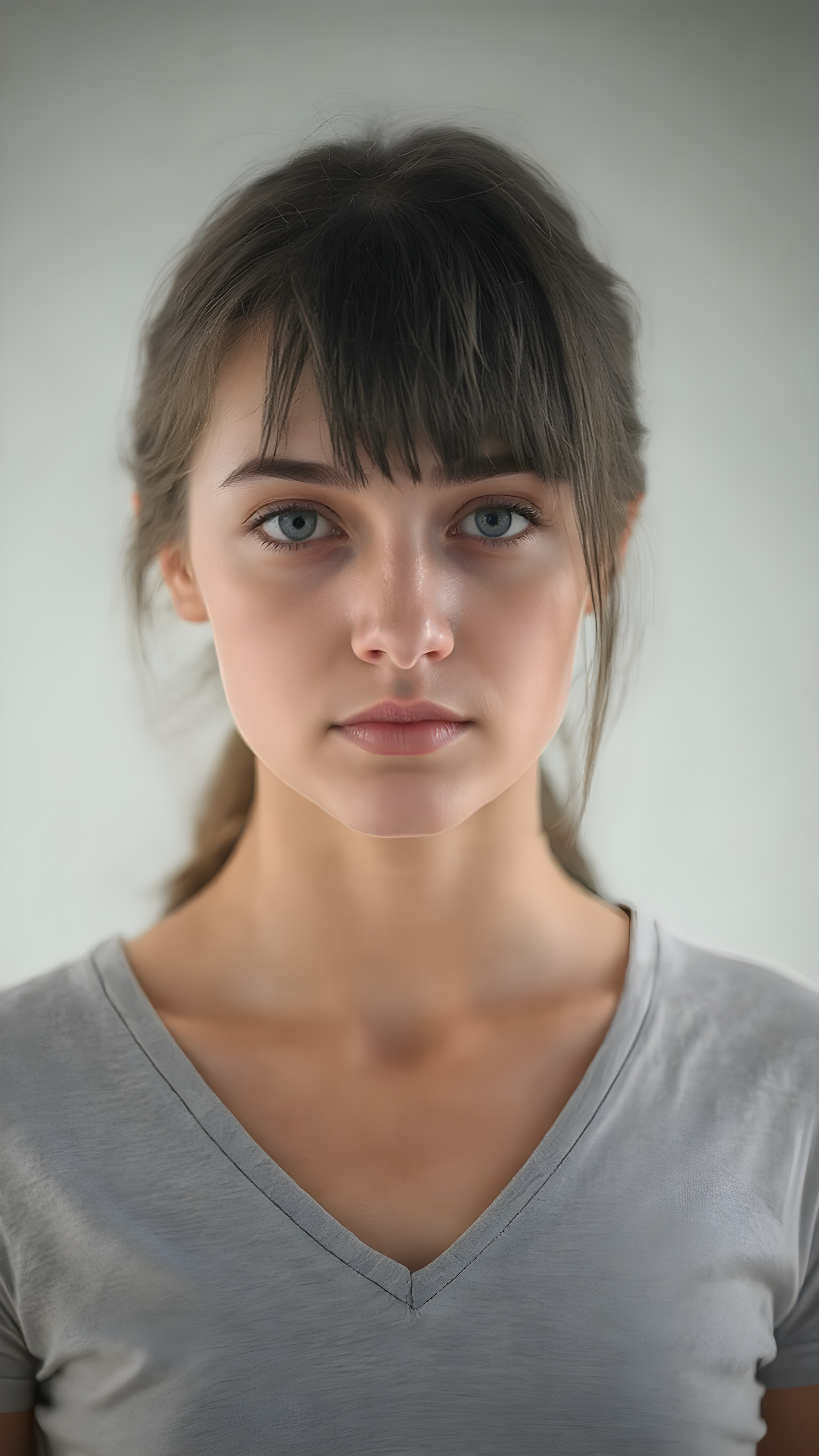 a upper body portrait from a young beautiful cute teen girl, 16 years old, perfect body, cropped short t-shirt, deep v-neck, straight jet hair, grey background, ((stunning)) ((gorgeous)) ((realistic detailed photo)), focus on center