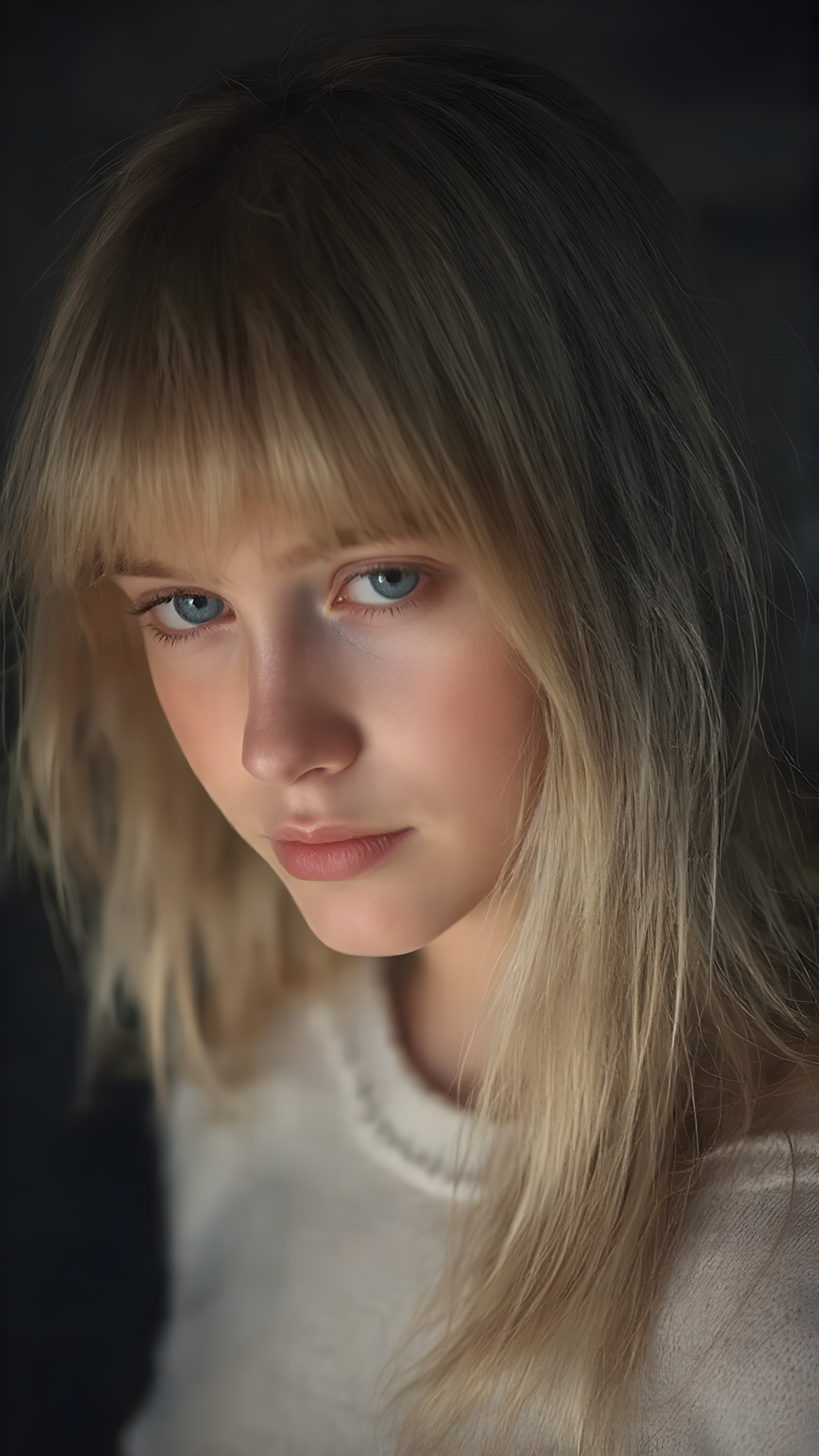 a young beautiful cute young fit Nordic teen girl, 13 years old, warm smile, dimmed light falls on her, she has long (((white straight long hair, bangs cut))) (her hair falls on her shoulders), and (realistic dark blue eyes), ((angelic round face)), in a dreamy, perfect shadows, she wears (a ((white tight silk sweater))), perfect curved fit body, she looks seductively at the viewer and smiles slightly, upper body, flawless skin, grey background, ((side profile)) ((ultra realistic photo)) ((stunning)) ((gorgeous)) ((4k))