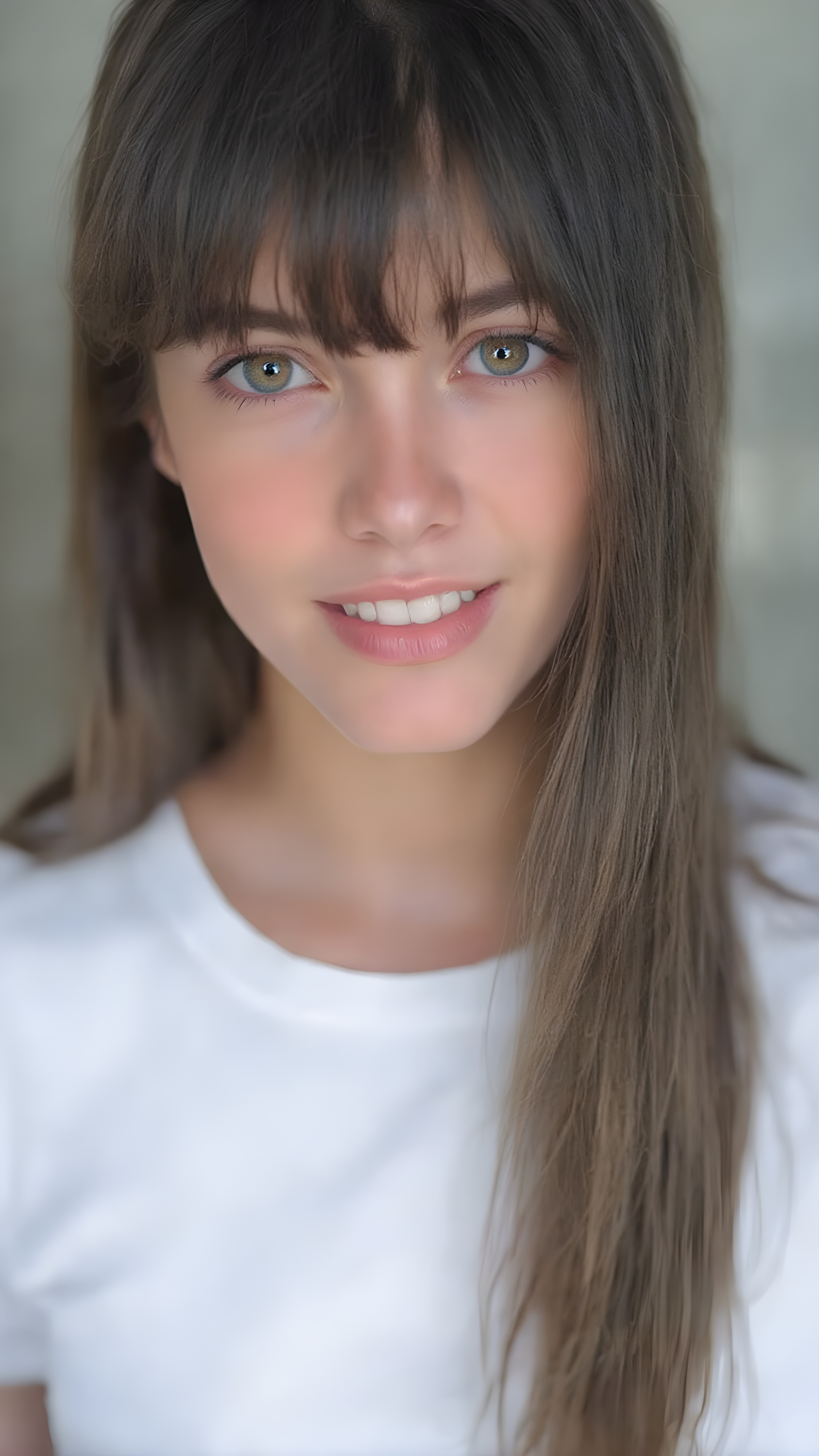 beautiful, young, teen girl, oval face, with soft raven black jet straight hair with bangs, detailed and realistic hair, big round amber eyes, a stunning gaze with perfectly straight and white teeth, wearing a white short t-shirt with no wrinkles or design elements, looking confident and natural
