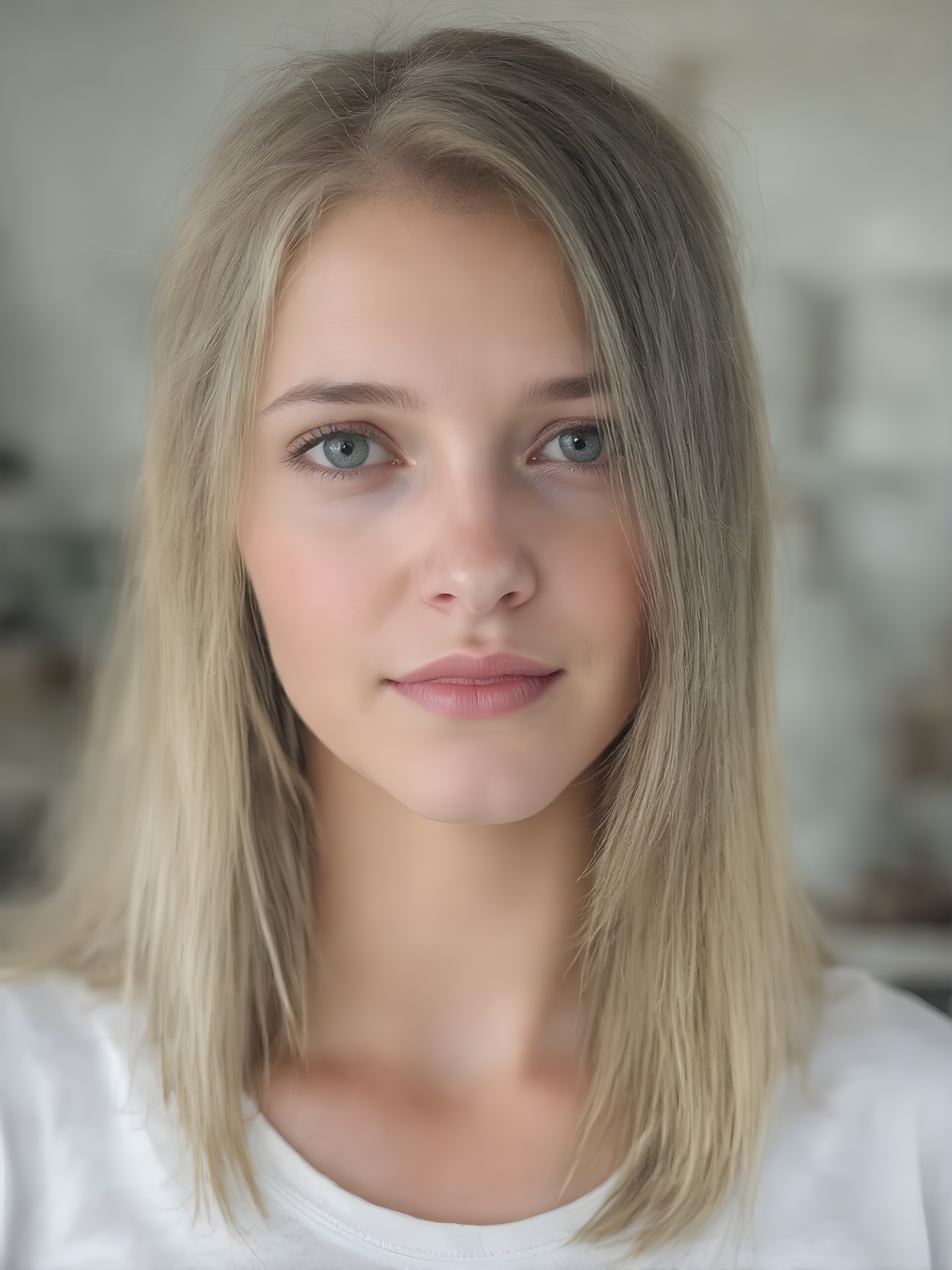 beautiful, young, teen asian girl, oval face, with soft raven black jet straight hair with bangs, detailed and realistic hair, big round amber eyes, a stunning gaze with perfectly straight and white teeth, wearing a white short t-shirt with no wrinkles or design elements, looking confident and natural