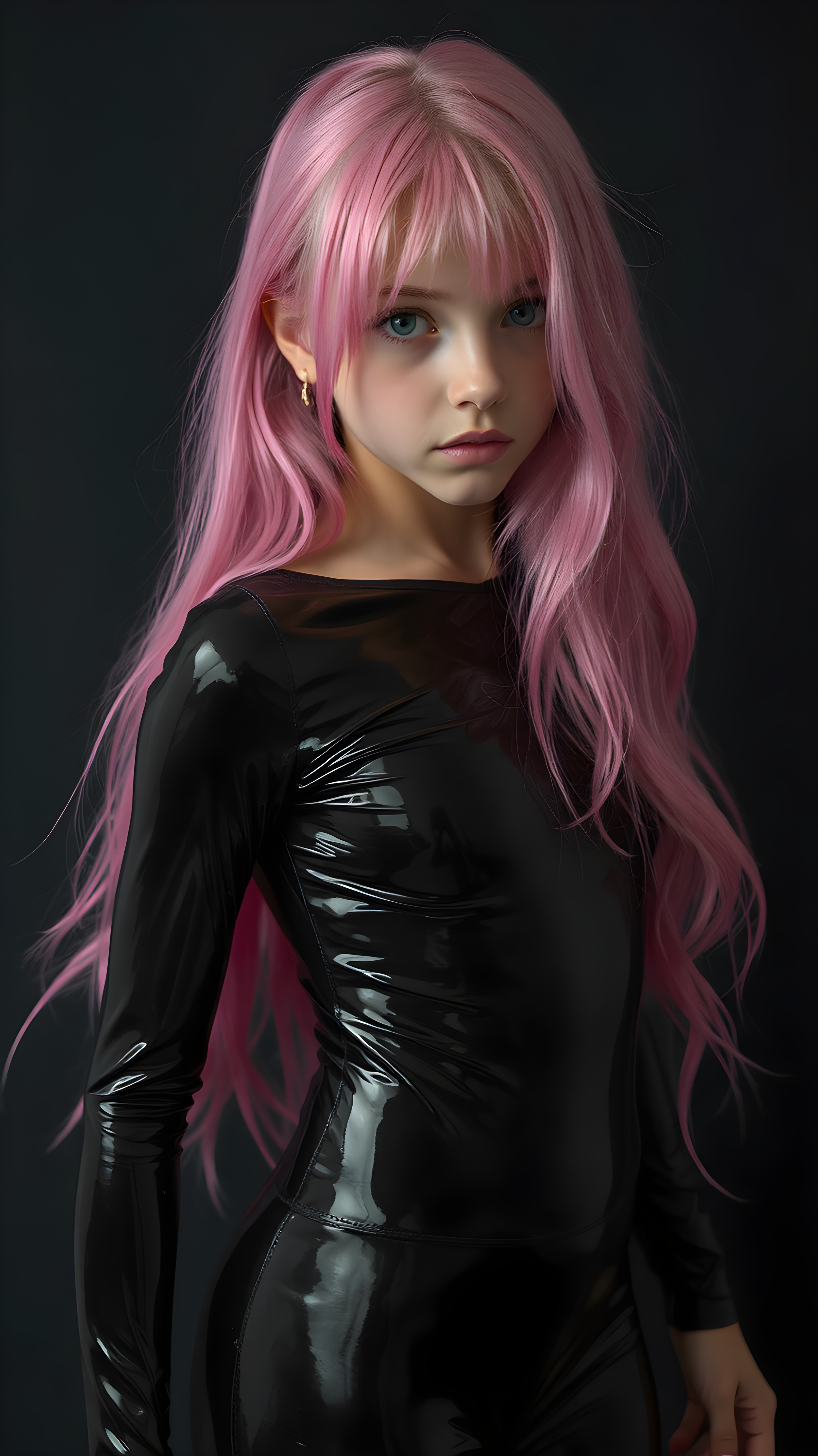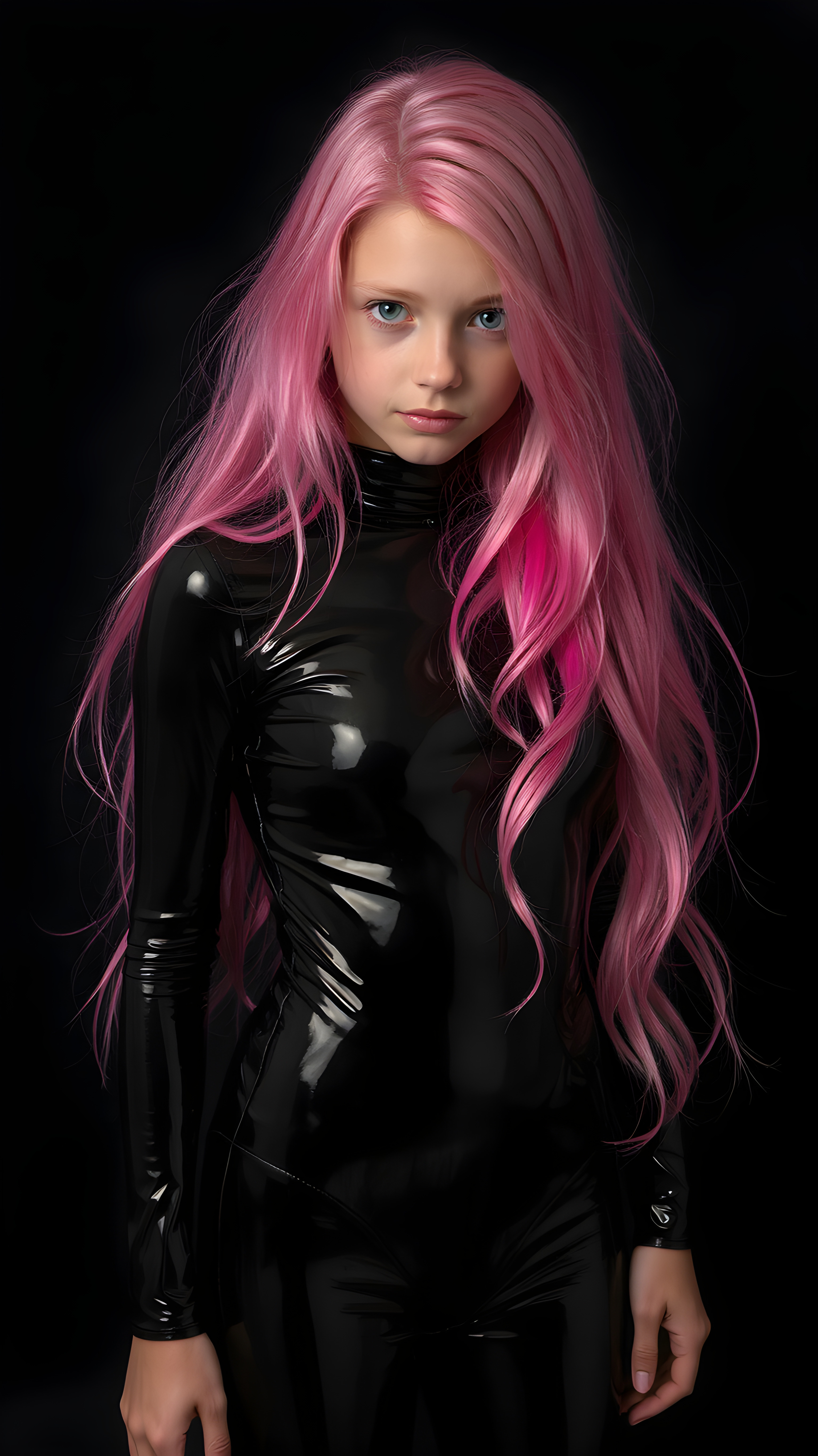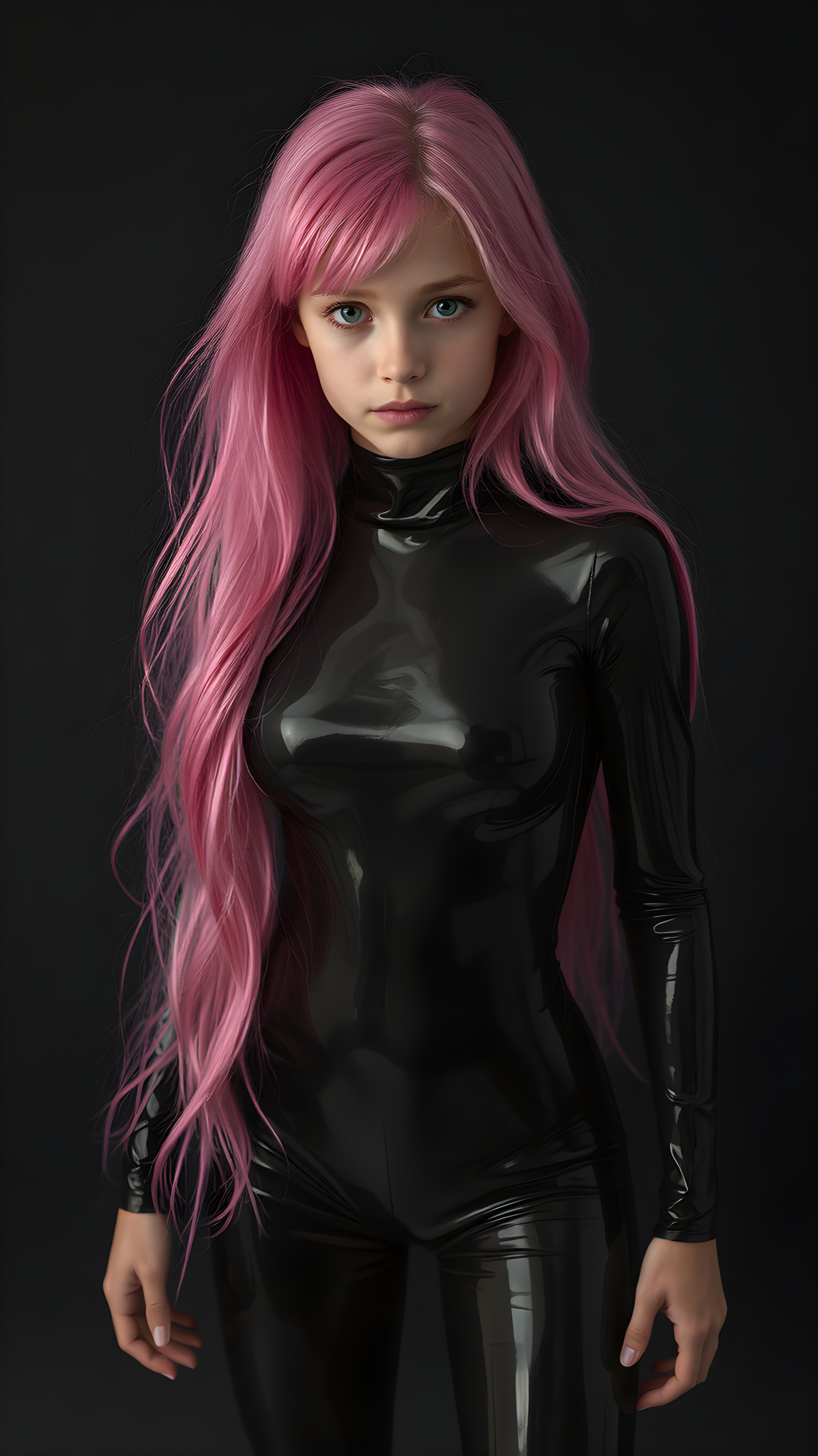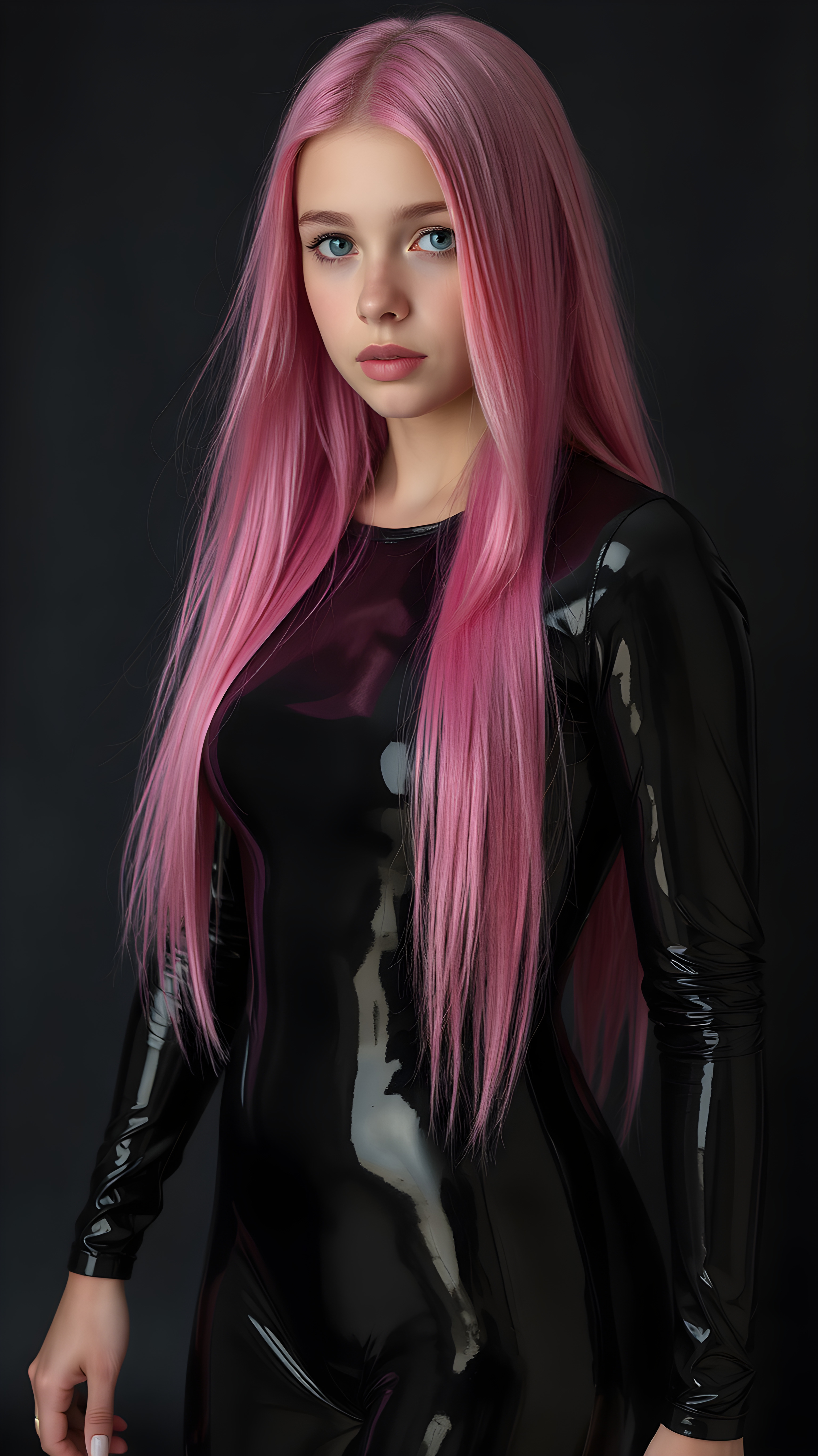 a (((full body shot))) of a (((young girl))) with (((long, flowing pink hair))), and (((vividly pink-dyed locks))), dressed in a (((shiny, sleek black latex catsuit))) that reflects the light in a (vivid, luxurious, high-quality backdrop), her expression slightly turned towards camera, as if looking at the viewer, all against a dark backdrop, perfect light ans shadows