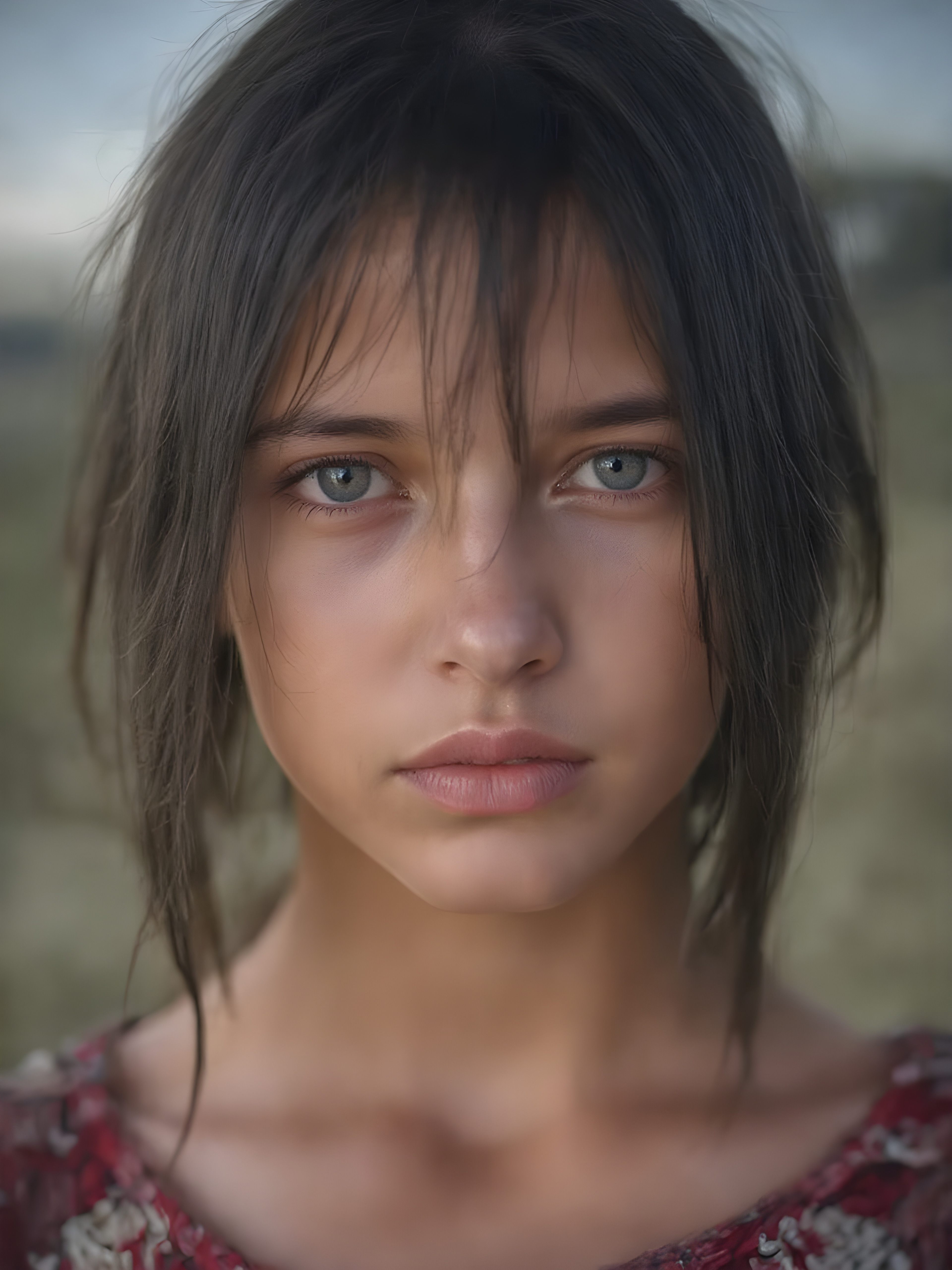 a ((teen girl)) realistic upper body portrait shot, her hair is obsidian-black and with long straight haircut, she has glancing silver-white eyes and are orbit round, she has pouting lips, she has a soft outlook, she has a fit figure, she wears female native american clothing style, in a natural way, mood scenery background