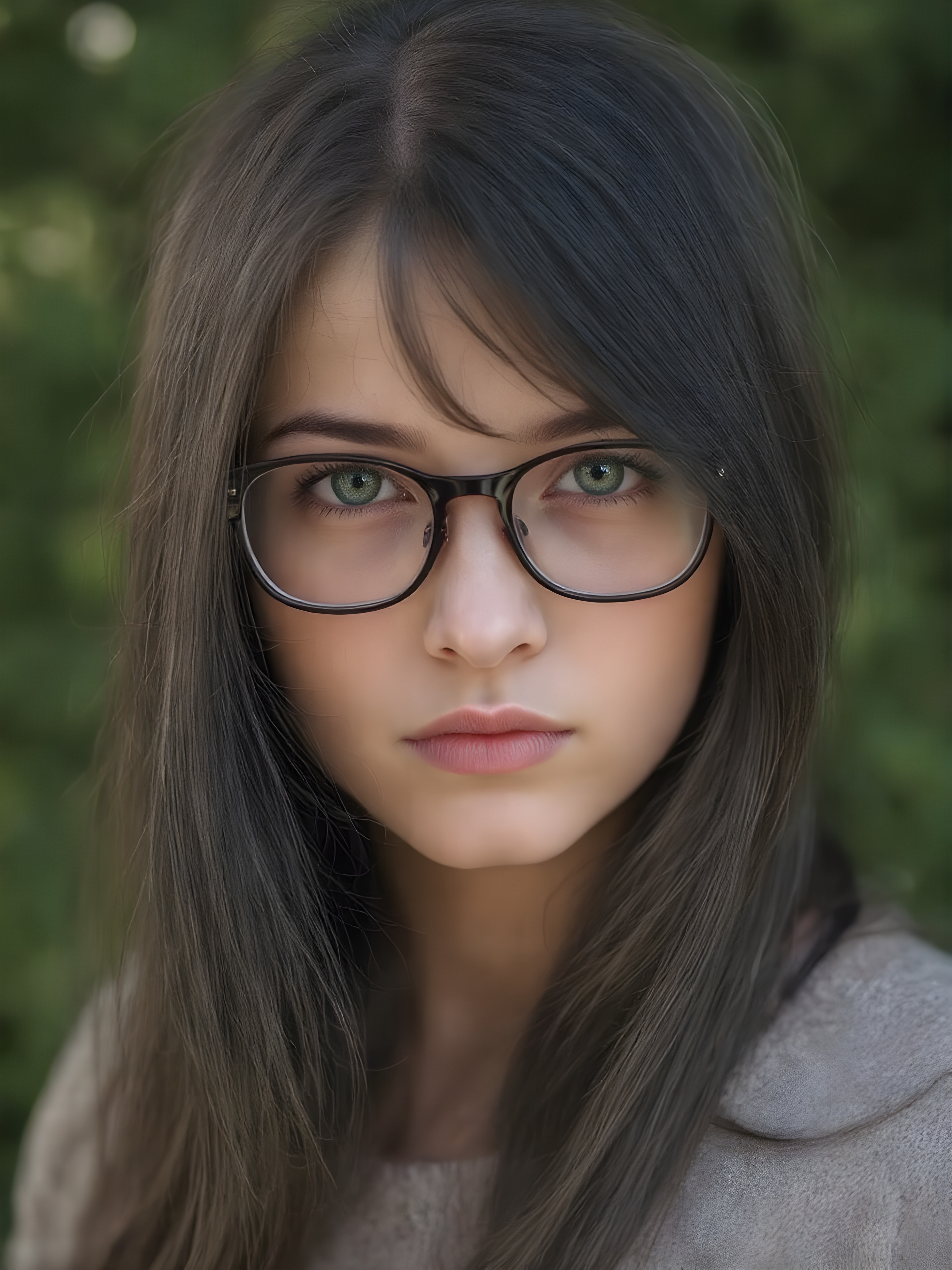 portrait from a stunningly beautiful young nerd girl, wearing a large, dark prescription glasses, age 15, with ((black long straight jet super soft hair (luminous)), flowing down to her waist, and (((bright amber eyes))), that match perfectly with her flawless complexion. She’s dressed in a tight ((wool sweater)), perfectly complemented by her (perfectly proportioned figure). Her look exudes seduction and playfulness, as she gazes directly at the viewer, all against a sunny green backdrop