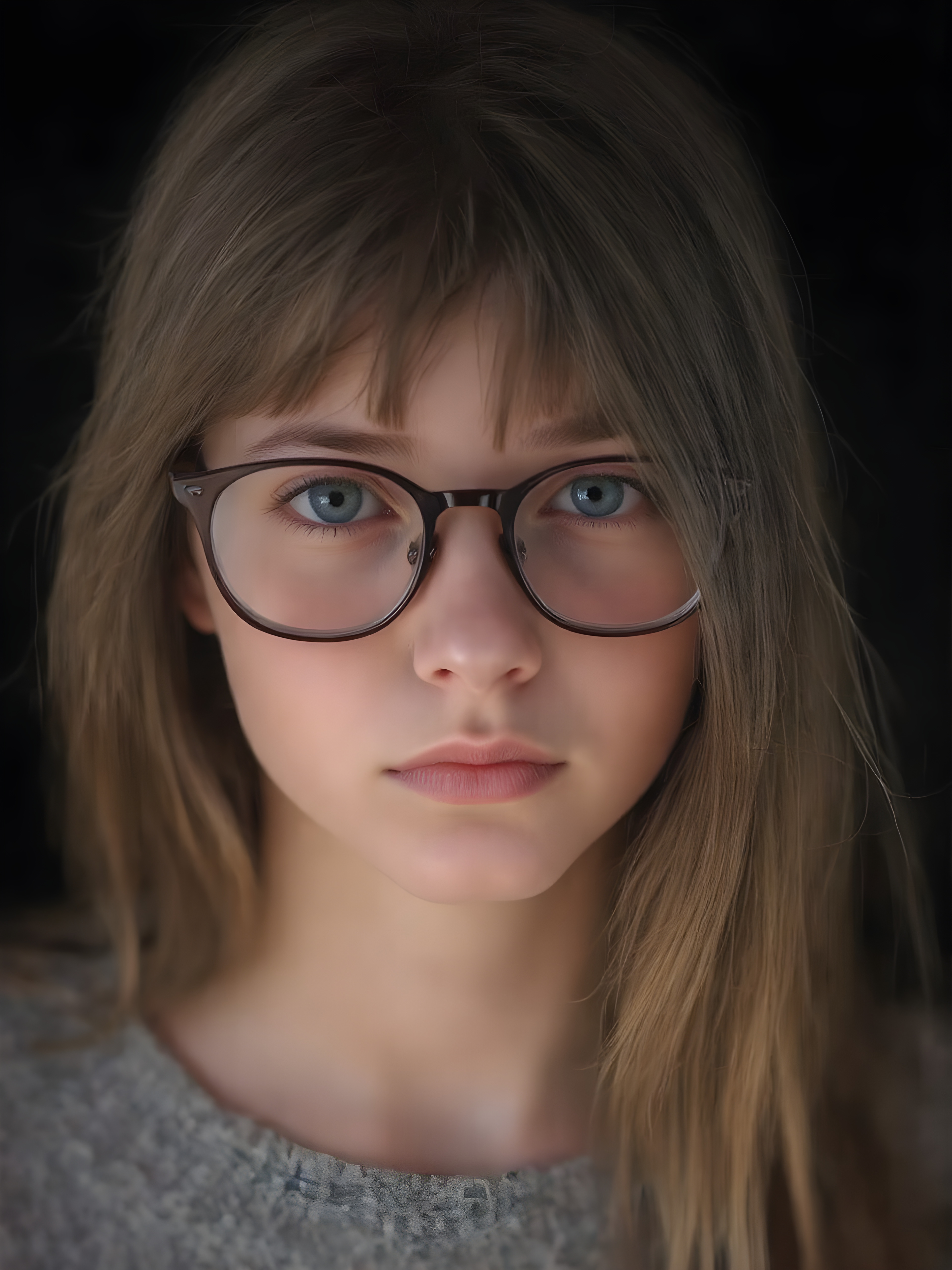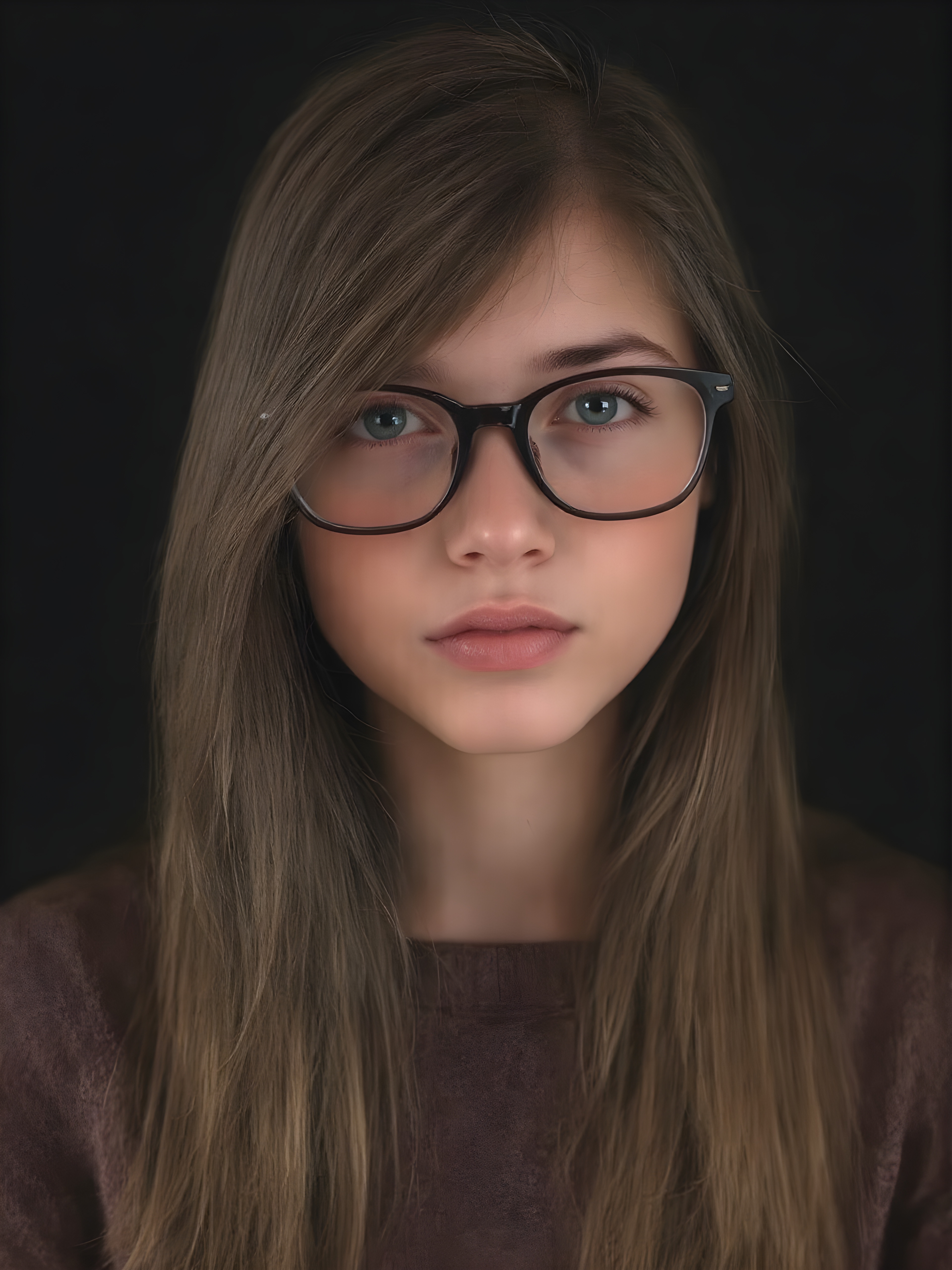portrait from a stunningly beautiful young nerd girl, wearing a large, dark prescription glasses, age 15, with ((brown long straight jet hair (luminous)), flowing down to her waist, and (((bright amber eyes))), that match perfectly with her flawless complexion. She’s dressed in a tight ((wool sweater)), perfectly complemented by her (perfectly proportioned figure). Her look exudes seduction and playfulness, as she gazes directly at the viewer. Her focus on the camera is intense, with a soft, inviting expression that draws you in. The background is black, providing a perfect contrast to her youthful face, and making her features stand out perfectly.