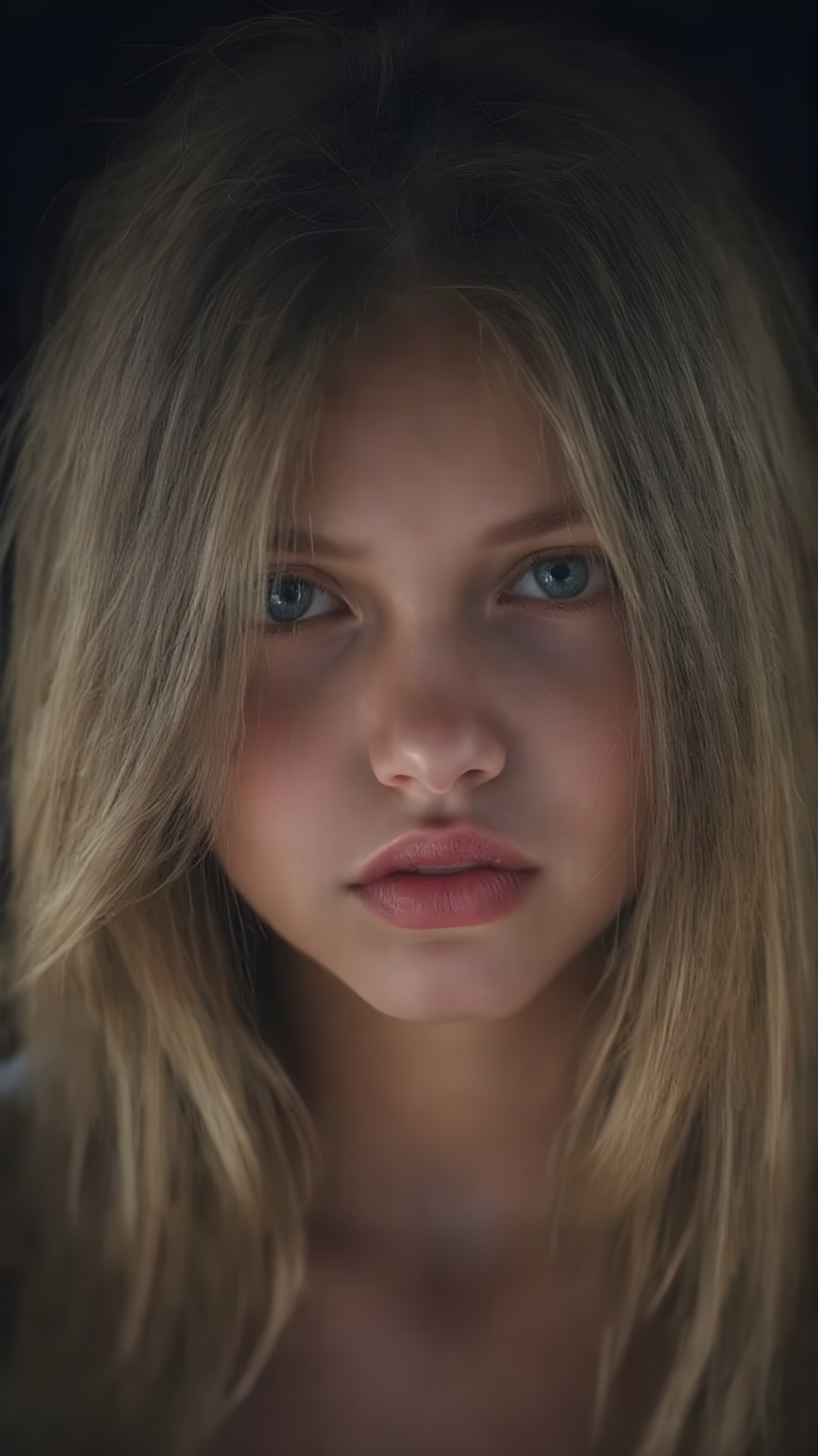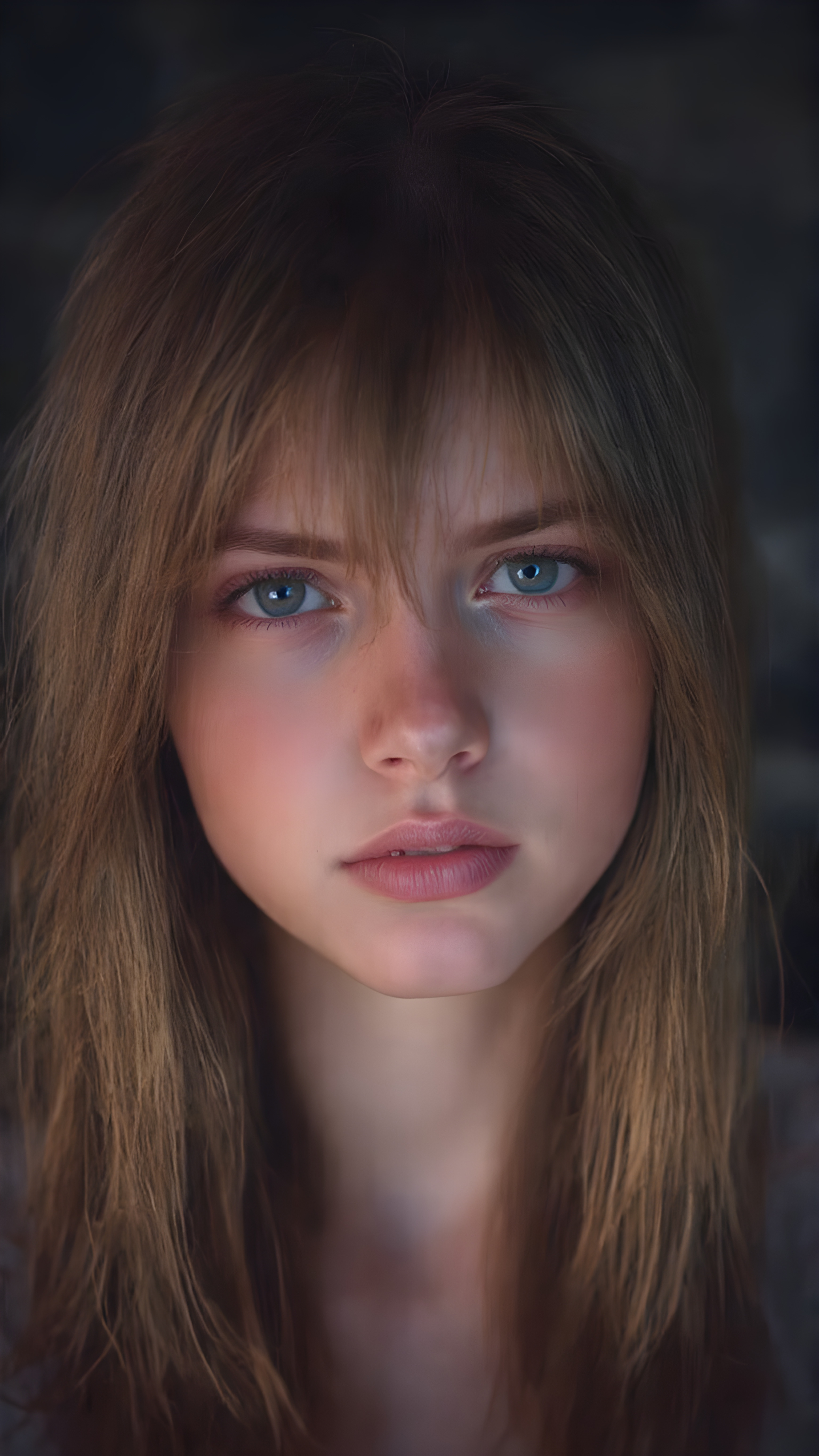 visualize a detailed and realistic photo: a (((stunning young teen girl, 13 years old))) (silky curved layers, (((vivid copper soft straight hair)))), whose frame a (seriously sensual face) with (dramatically contrasting, full, (((red lips)))), set against a (broodingly atmospheric backdrop) for an unforgettable (upper body shot). Her features are captured in (intense detail), accentuated by the (perfect shadow and highlights) that draw the eye, wears a white wool switcher, ((stunning)) ((gorgeous))