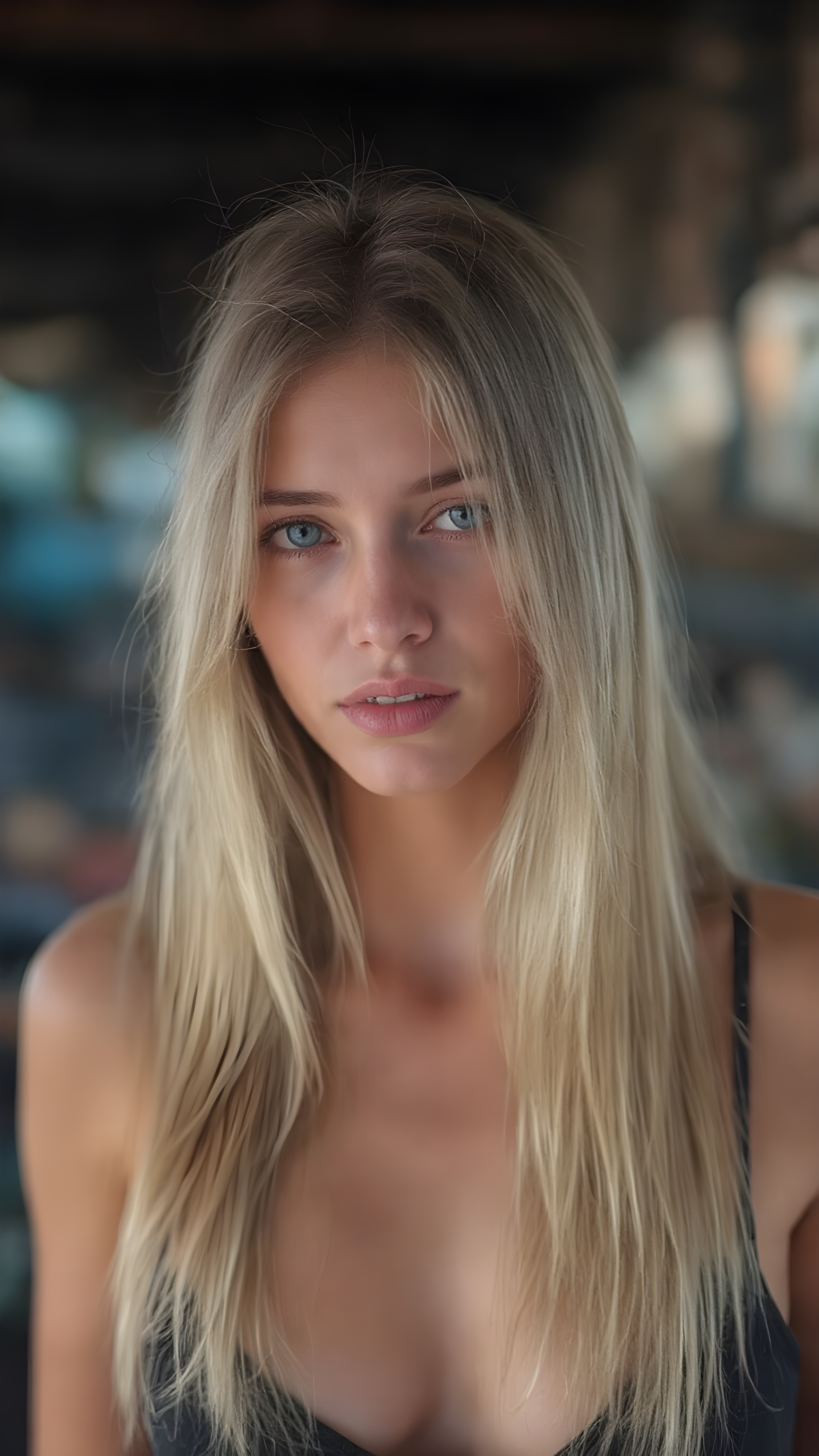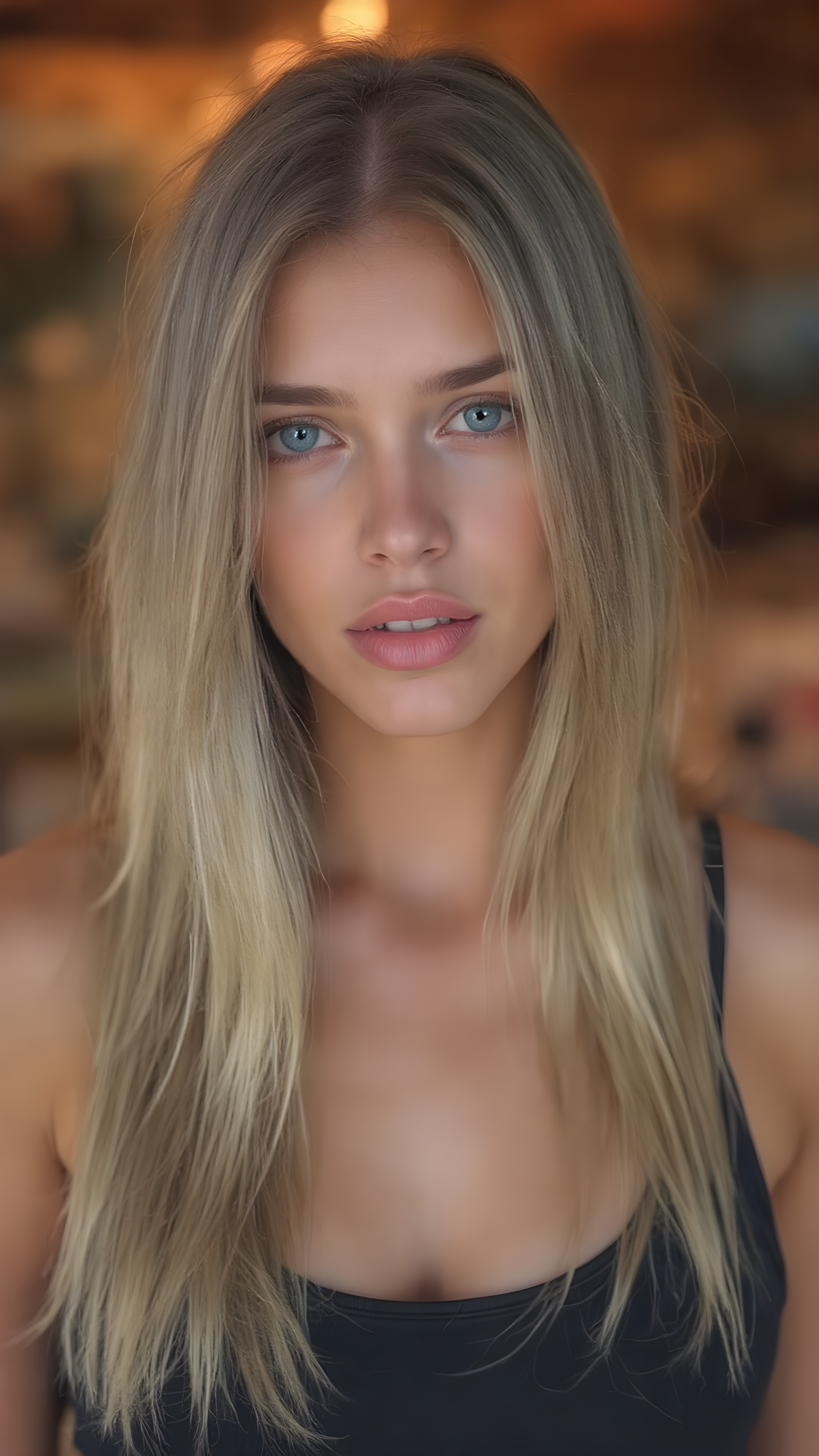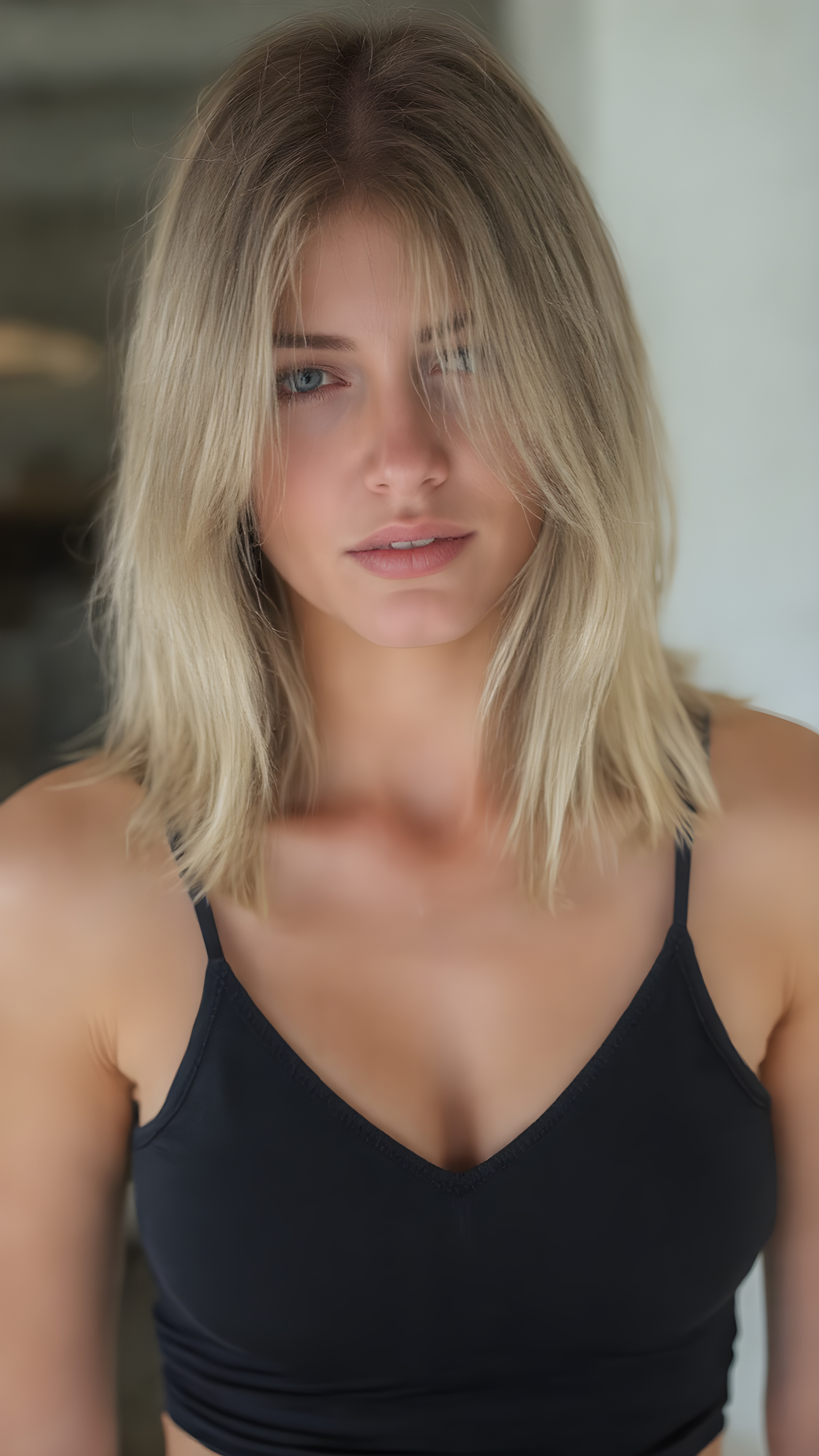 a beautiful and pretty girl with long, straight blonde hair wears a short, skimpy cropped black tank top. She has full, plump lips and looks seductively at the viewer