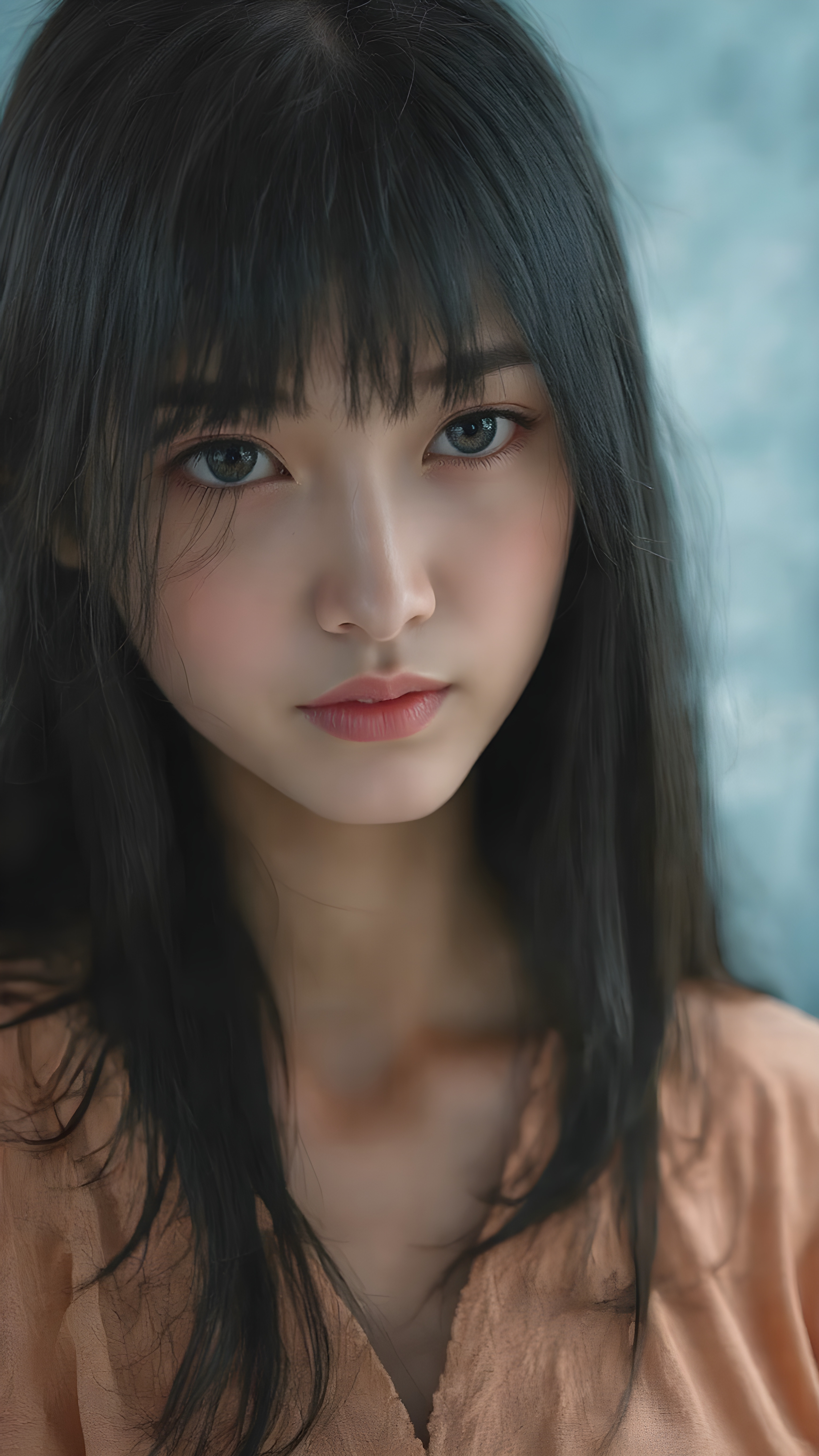 a detailed and realistic (((Japanese teen girl))) with intricate details and ornate patterns, luxurious black long straight hair with side-swept bangs, ((blue background)), perfect light and shadow, ((stunning)), ((gorgeous))