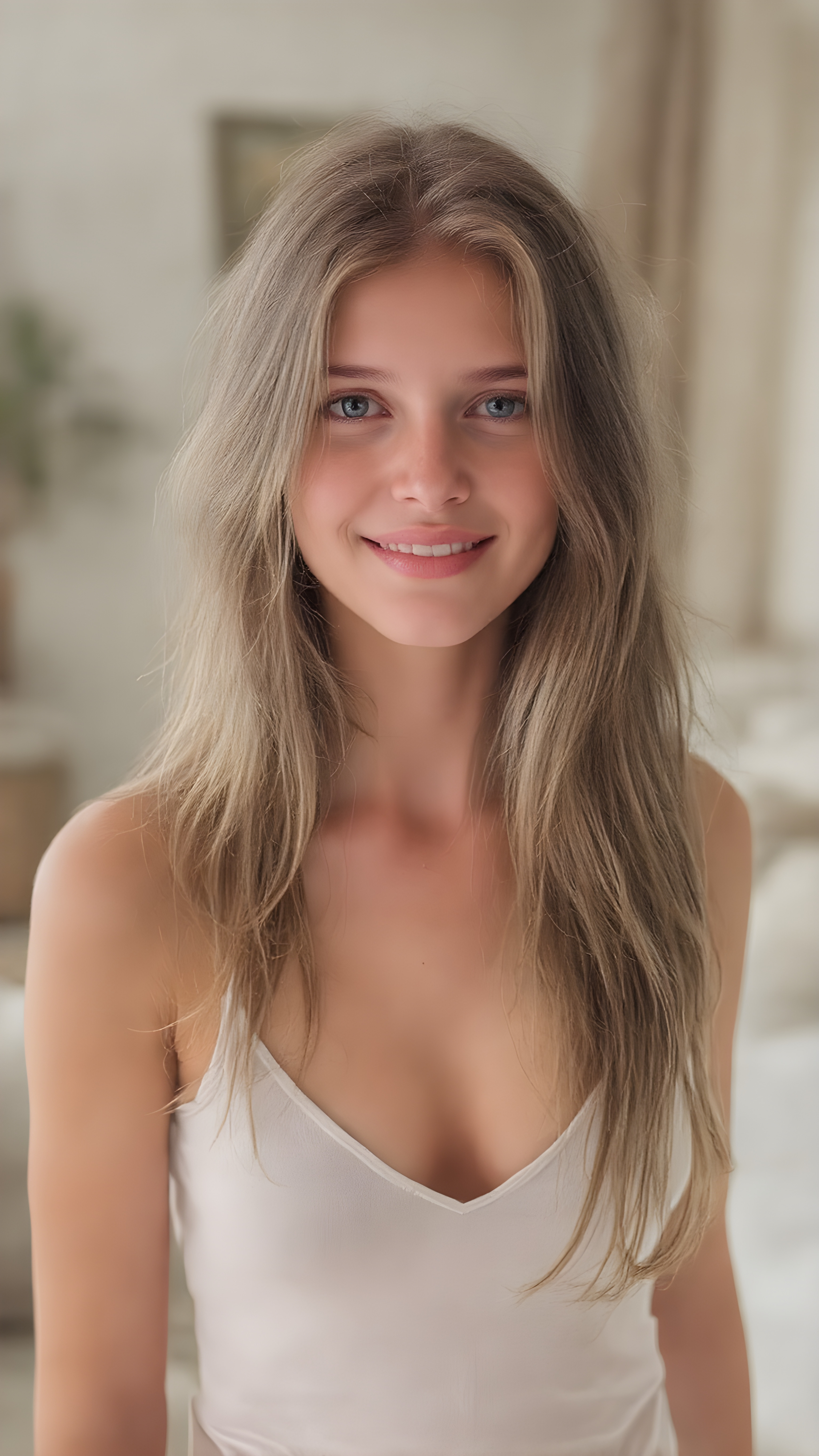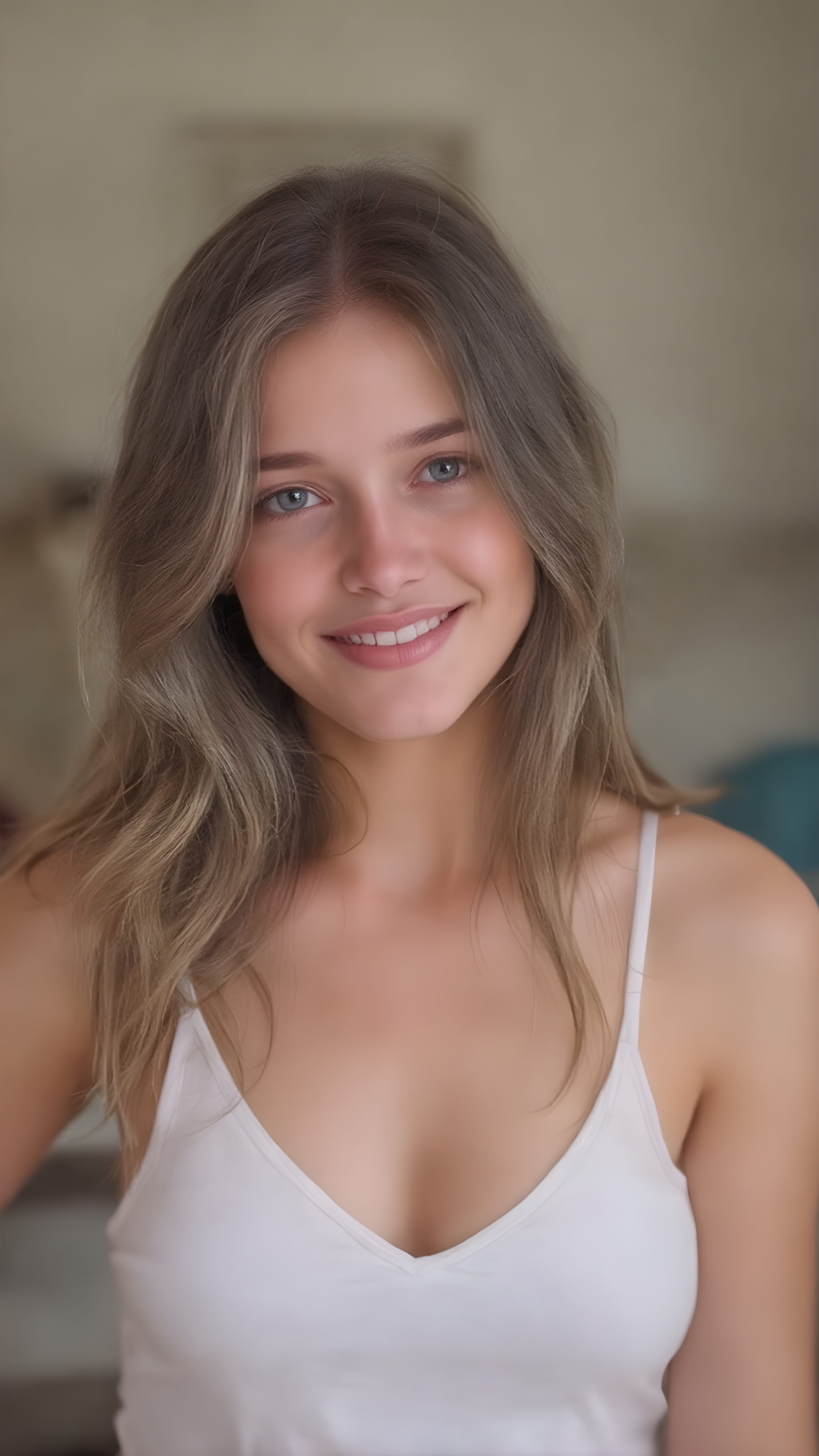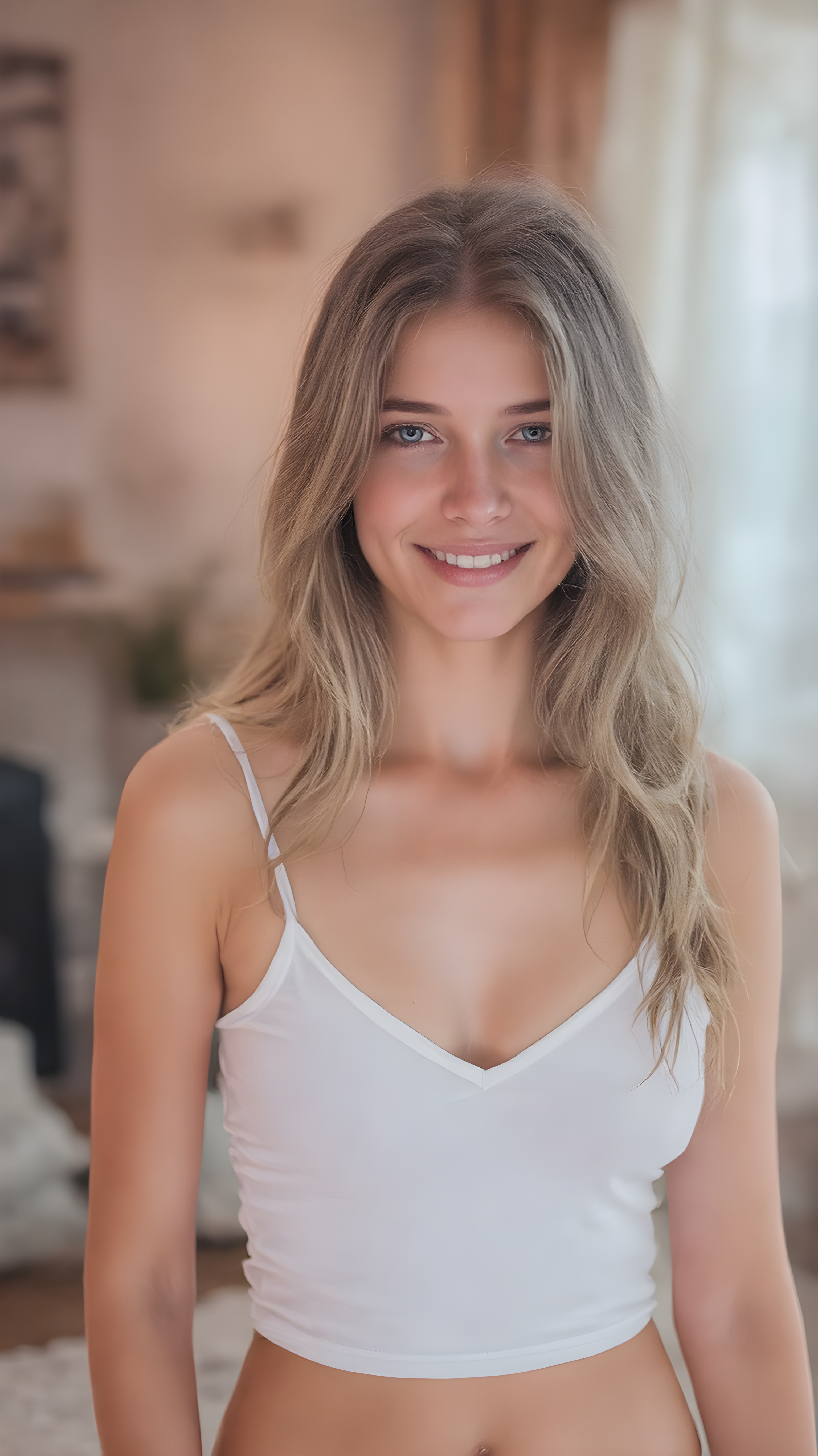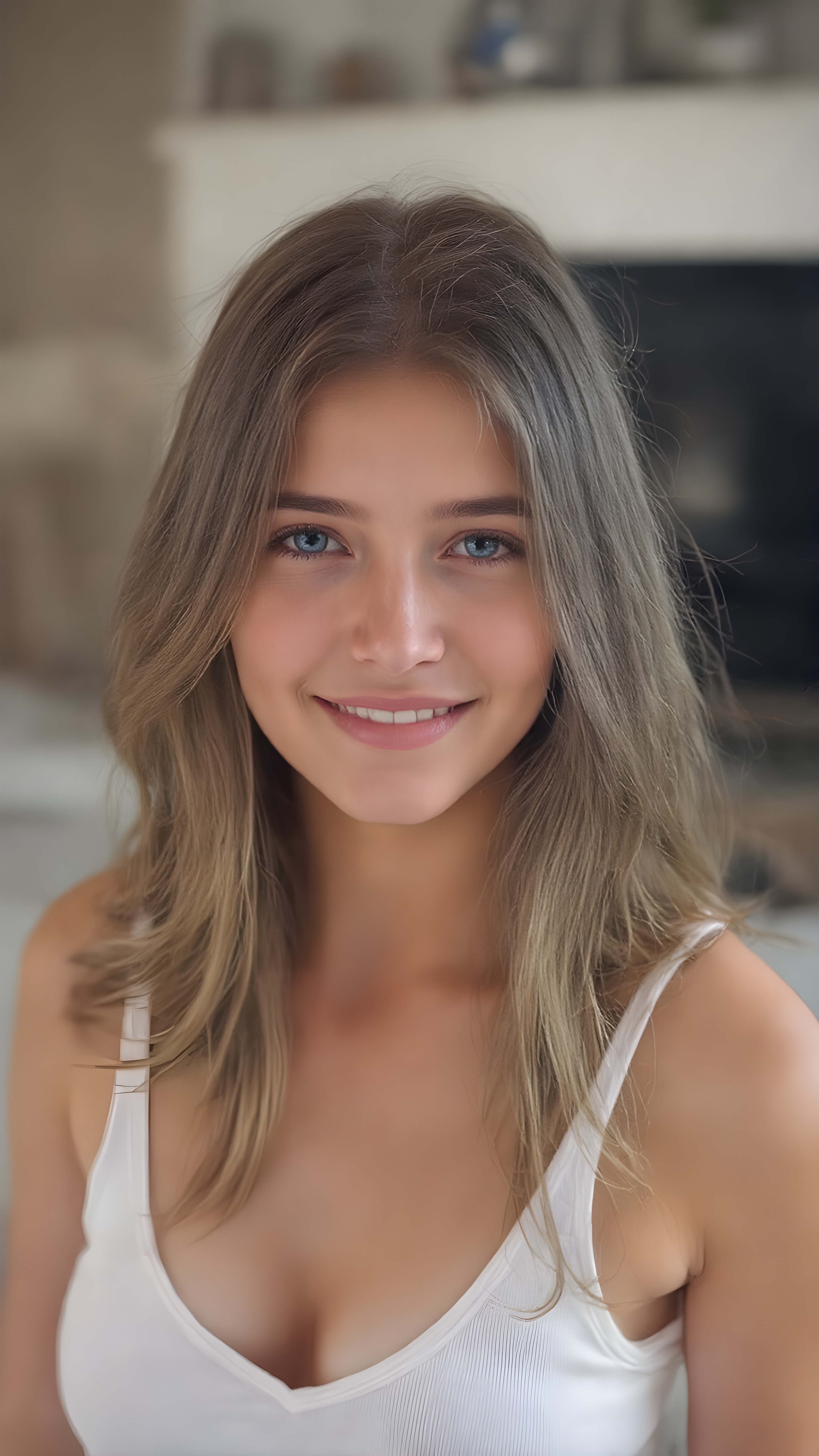 a (((professional photograph))) depicting a beautiful, cute, innocent and shy ((young well busty girl))) with soft long wavy hair, perfect realistic detailed angelic round face, upper-body, (((perfect curved and toned thighs))), white tank top, deep v-neck, ((highly detailed, high resolution, full quality image)), that exudes a sense of pure perfection. Her smile is bright and natural looking. The background is a cozy, warm and inviting living room.