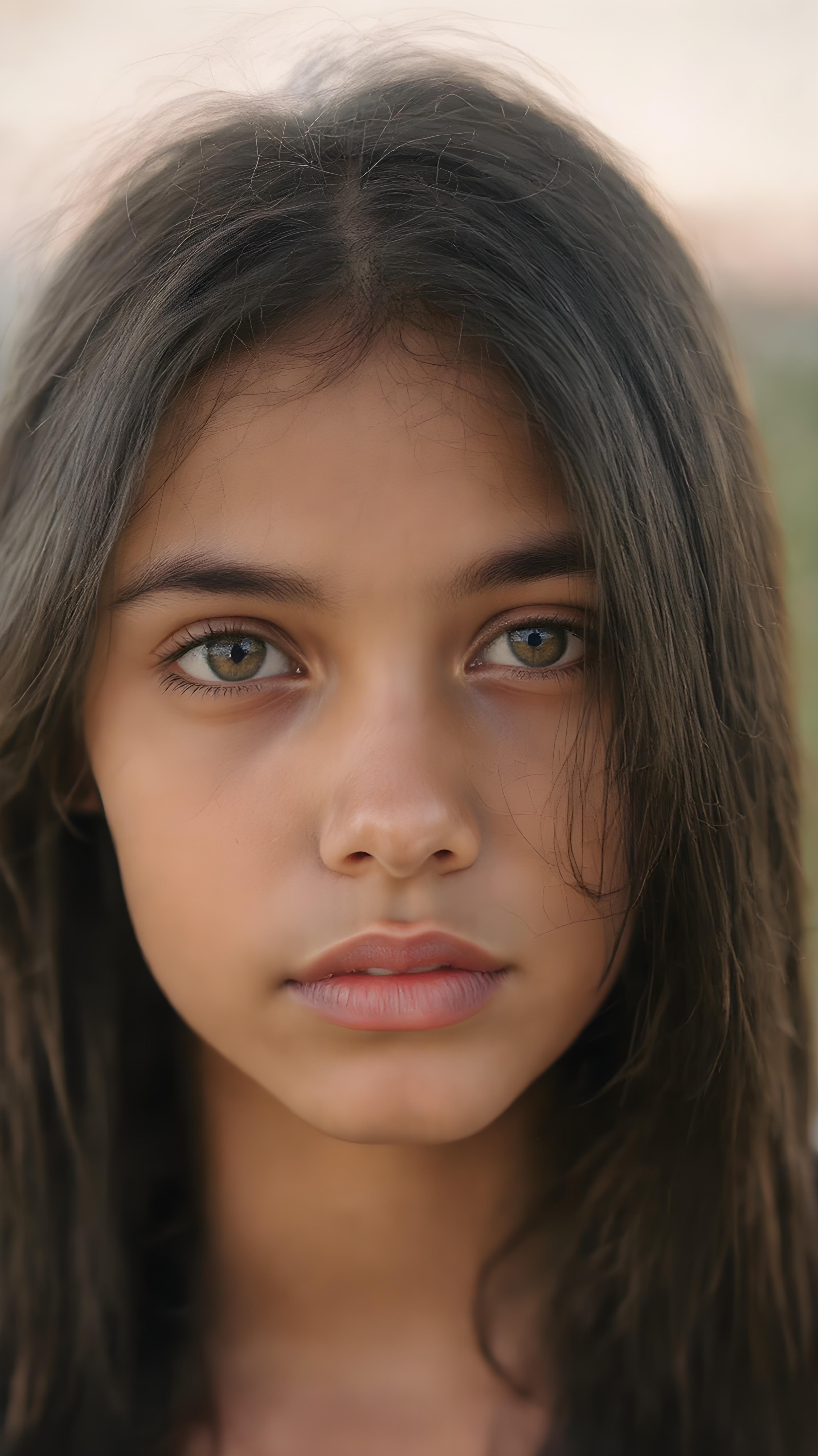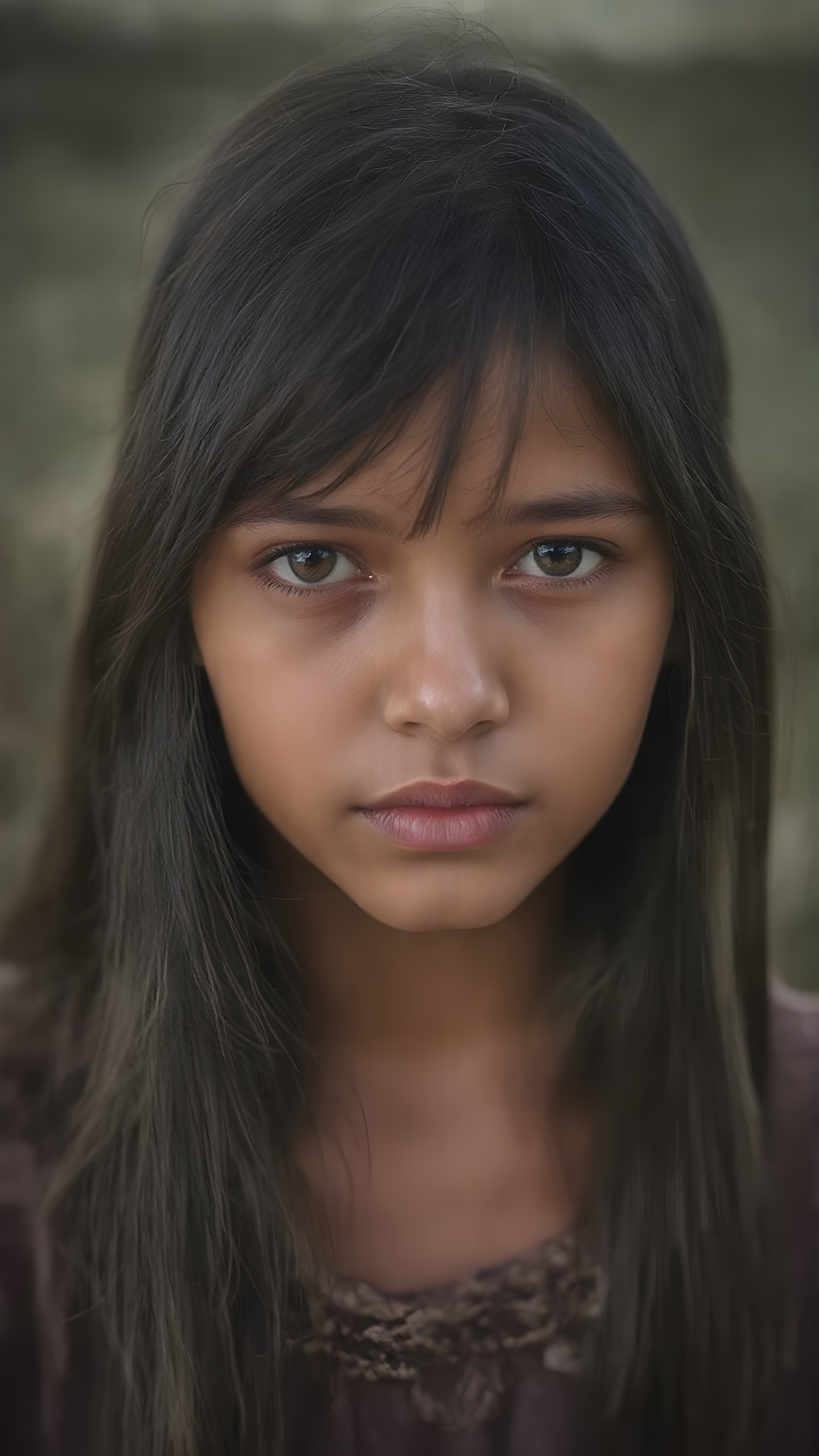 perfect detailed and realistic portrait photo from a ((cute brown-skinned teen girl)) medium silhouette shot, her hair it’s obsidian-black and with long straight haircut, she has amber eyes and are orbit round, she has pouting full lips, she has a soft outlook, she has a fit and perfect curved figure, in a natural way, mood scenery background