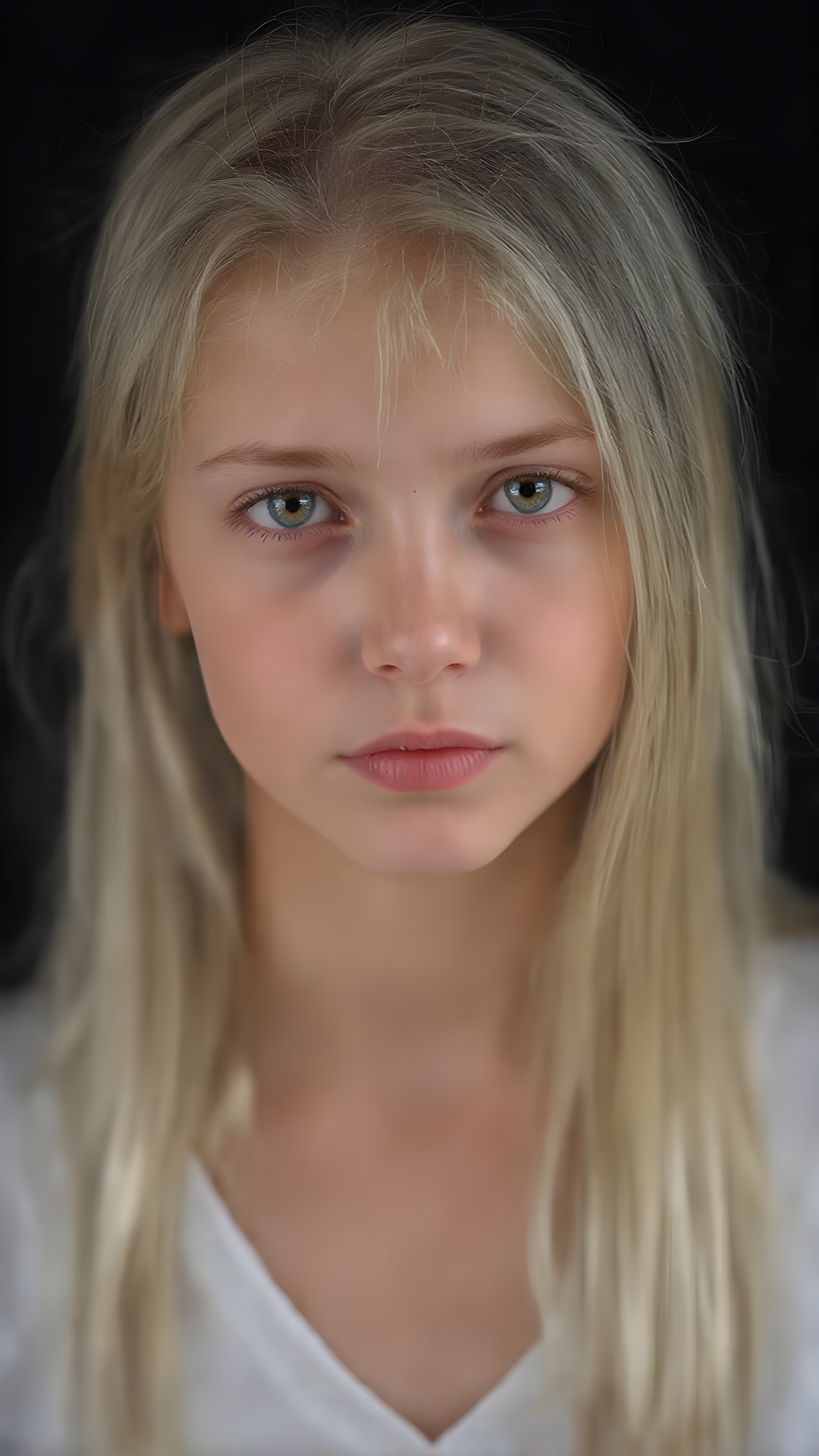 full body shot of a stunningly beautiful young girl, age 15, with ((white long straight jet hair (luminous)), flowing down to her waist, and (((bright amber eyes))), that match perfectly with her flawless complexion. She’s dressed in a tight ((white short t-shirt, deep v-neck)), and ((cute (flared) jeans)), perfectly complemented by her (perfectly proportioned figure). Her look exudes seduction and playfulness, as she gazes directly at the viewer. Her focus on the camera is intense, with a soft, inviting expression that draws you in. The background is black, providing a perfect contrast to her youthful face, and making her features stand out perfectly.