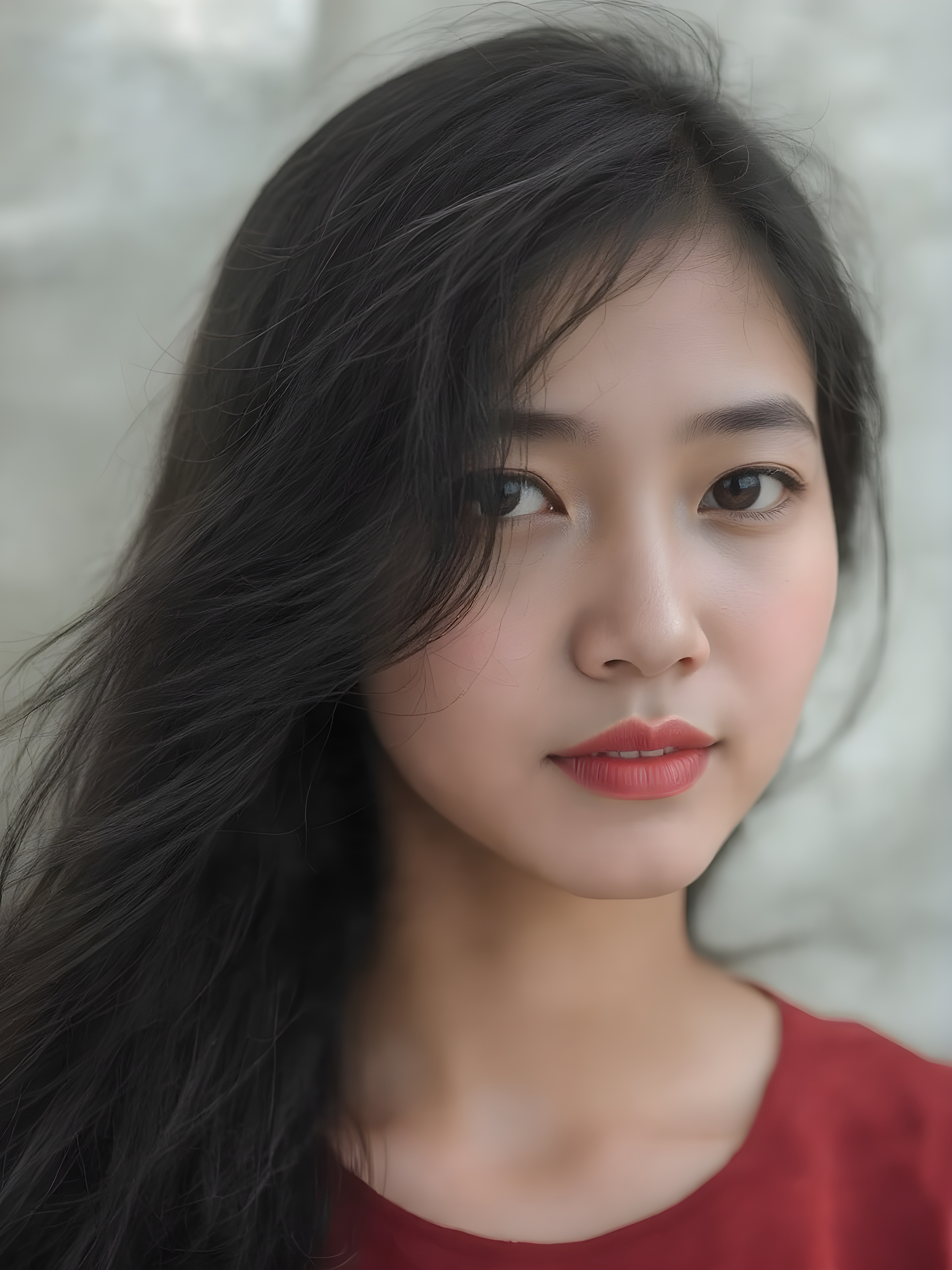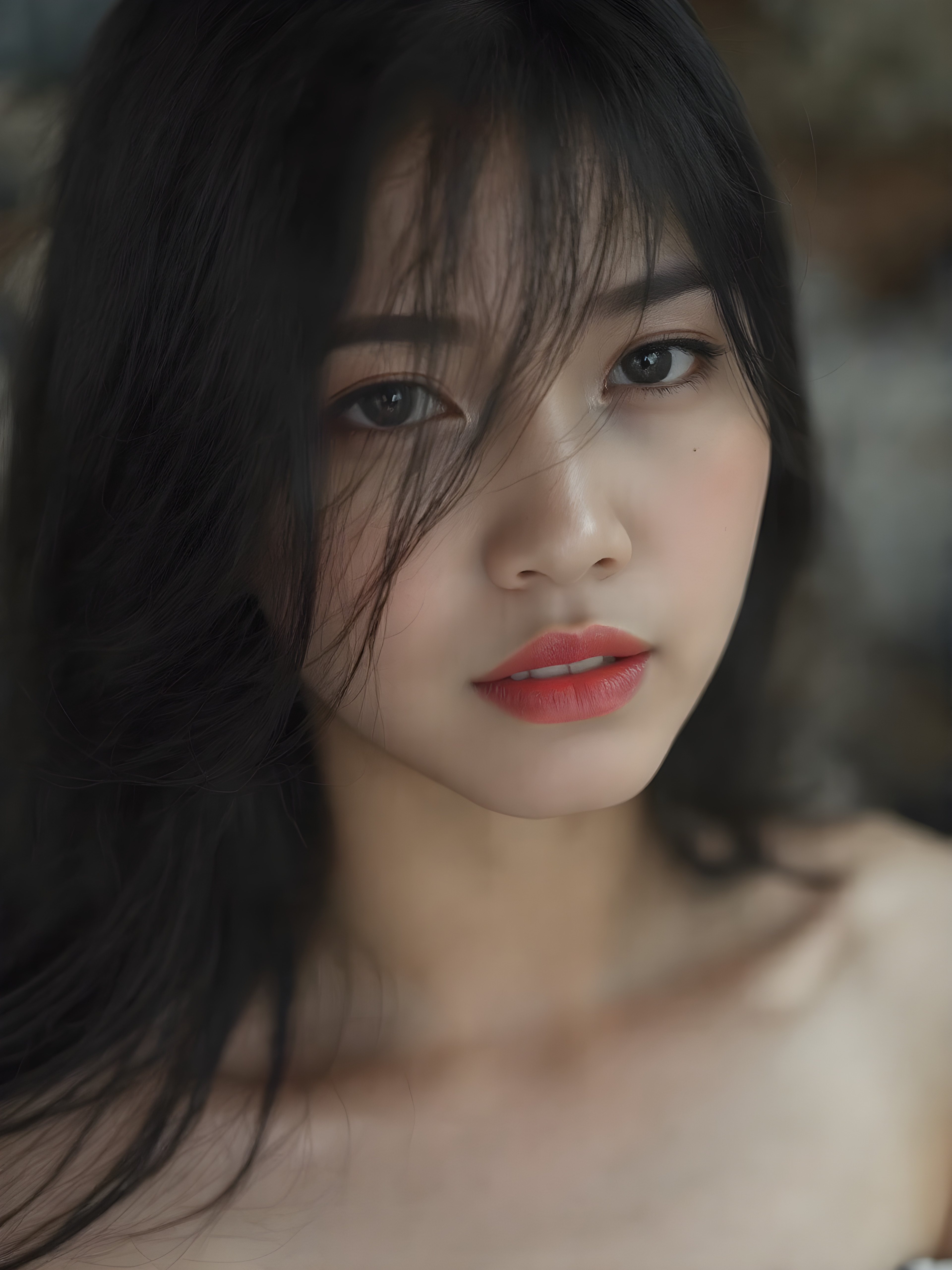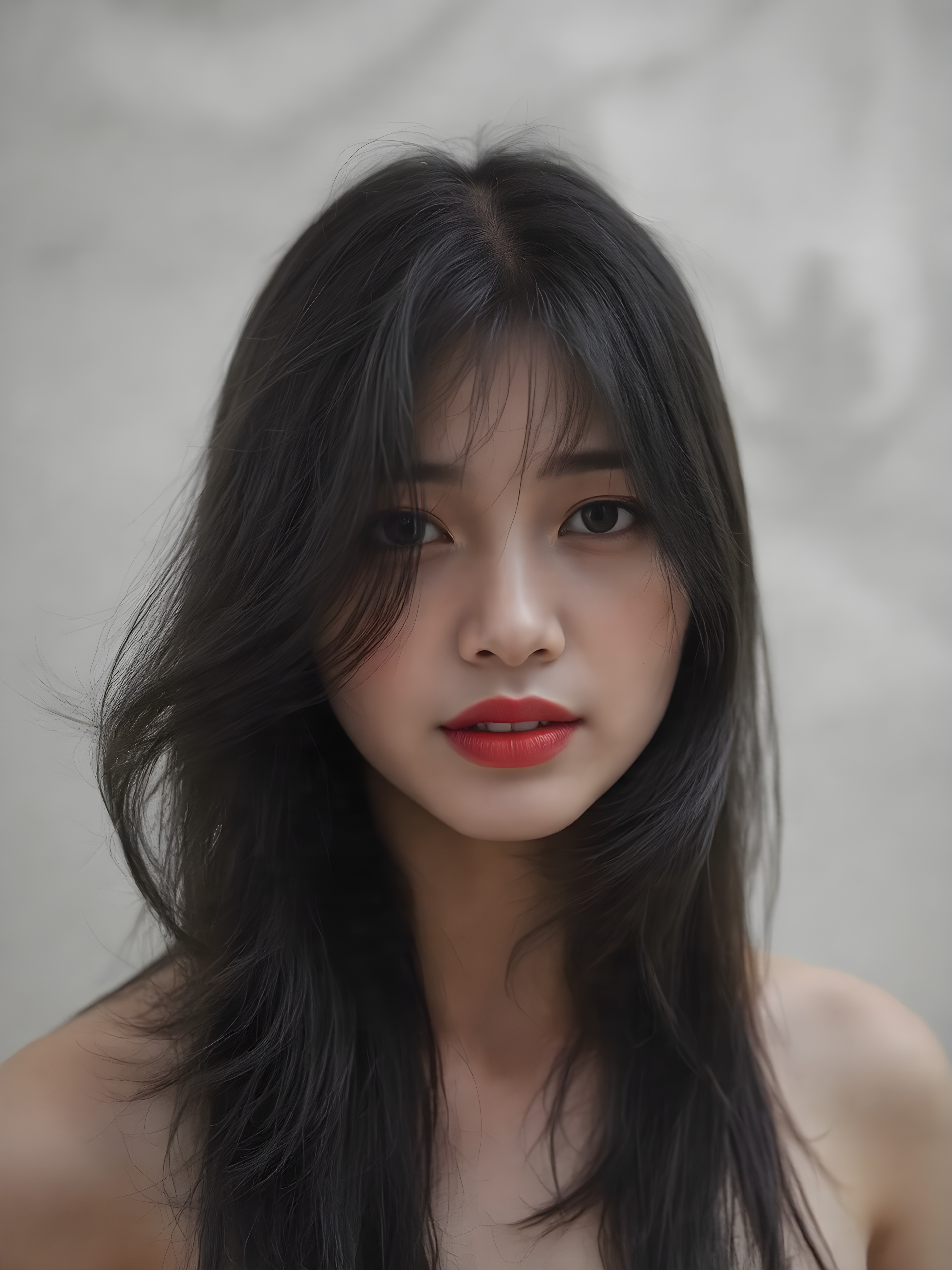a (((black and white photograph))), vividly contrasted by splashes of (((red lip color))), representing a (((full-body capture))) of a (((beautiful young Asian girl, long black hair))) with an (((ultra realistic, intricate details))) that defy the laws of physics, with a (((dynamic advanced lighting system))) that brings out the extreme details, composited against a (((natural, grainy backdrop))), emulating a hyper-realistic, advanced photography