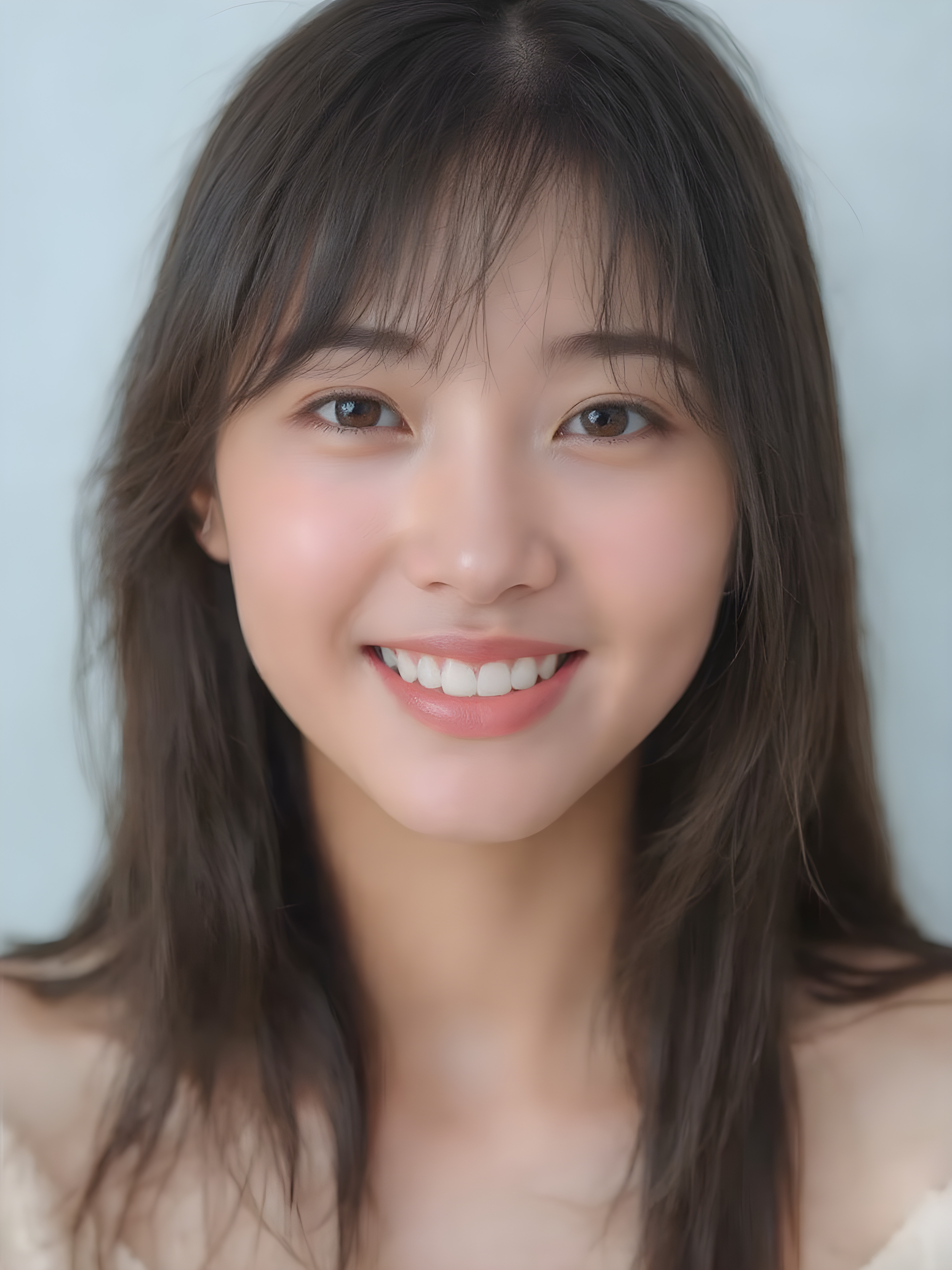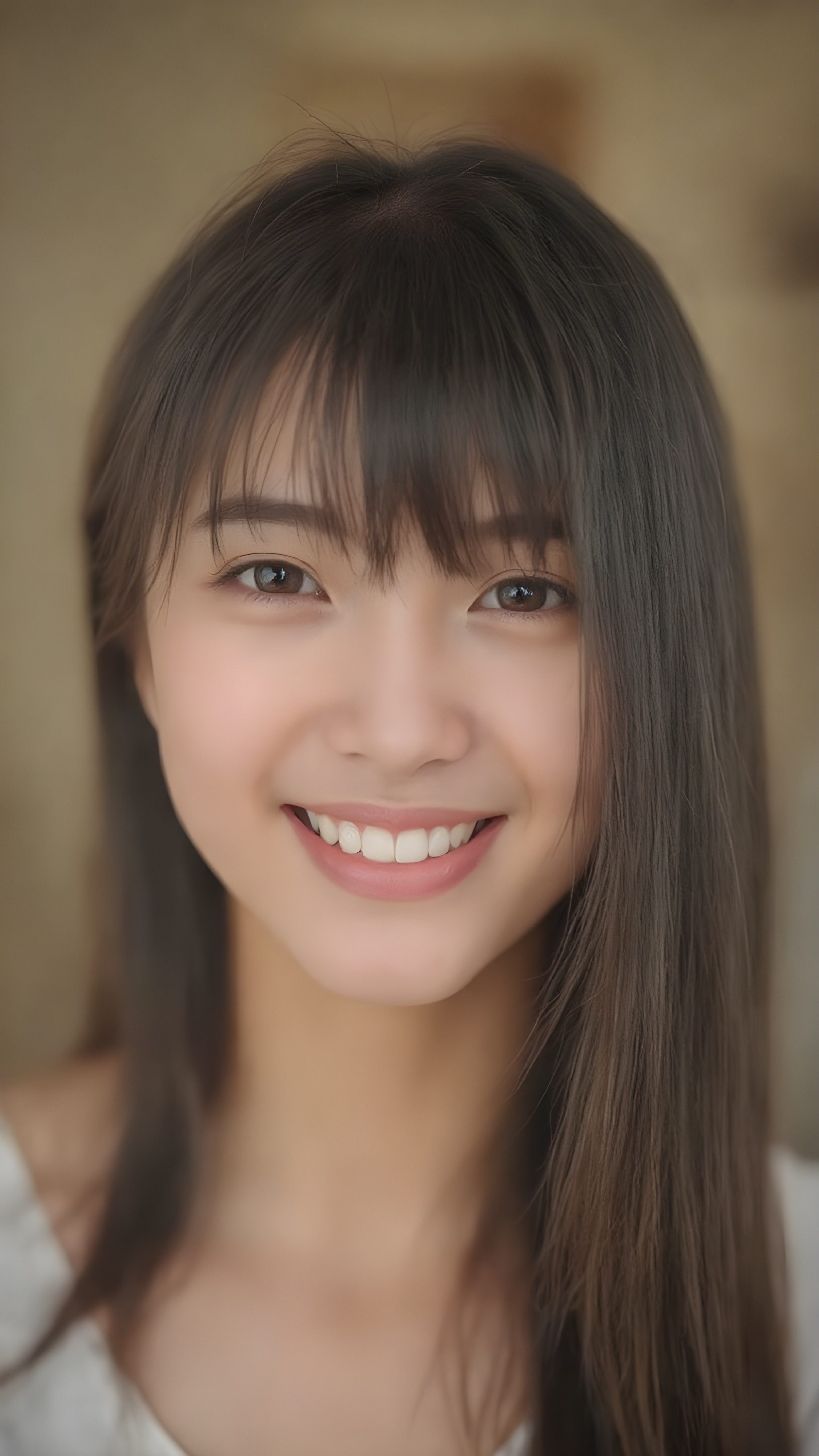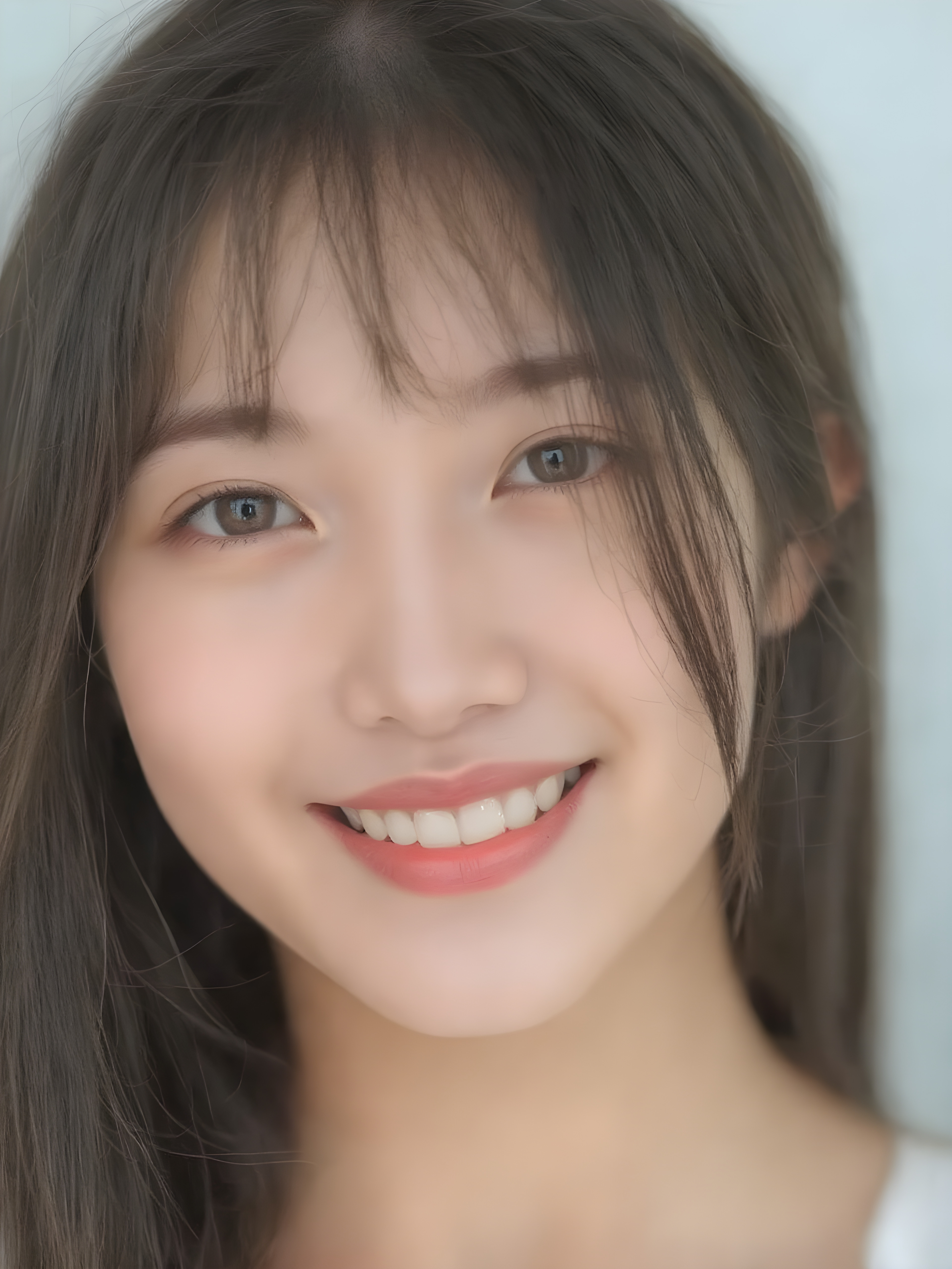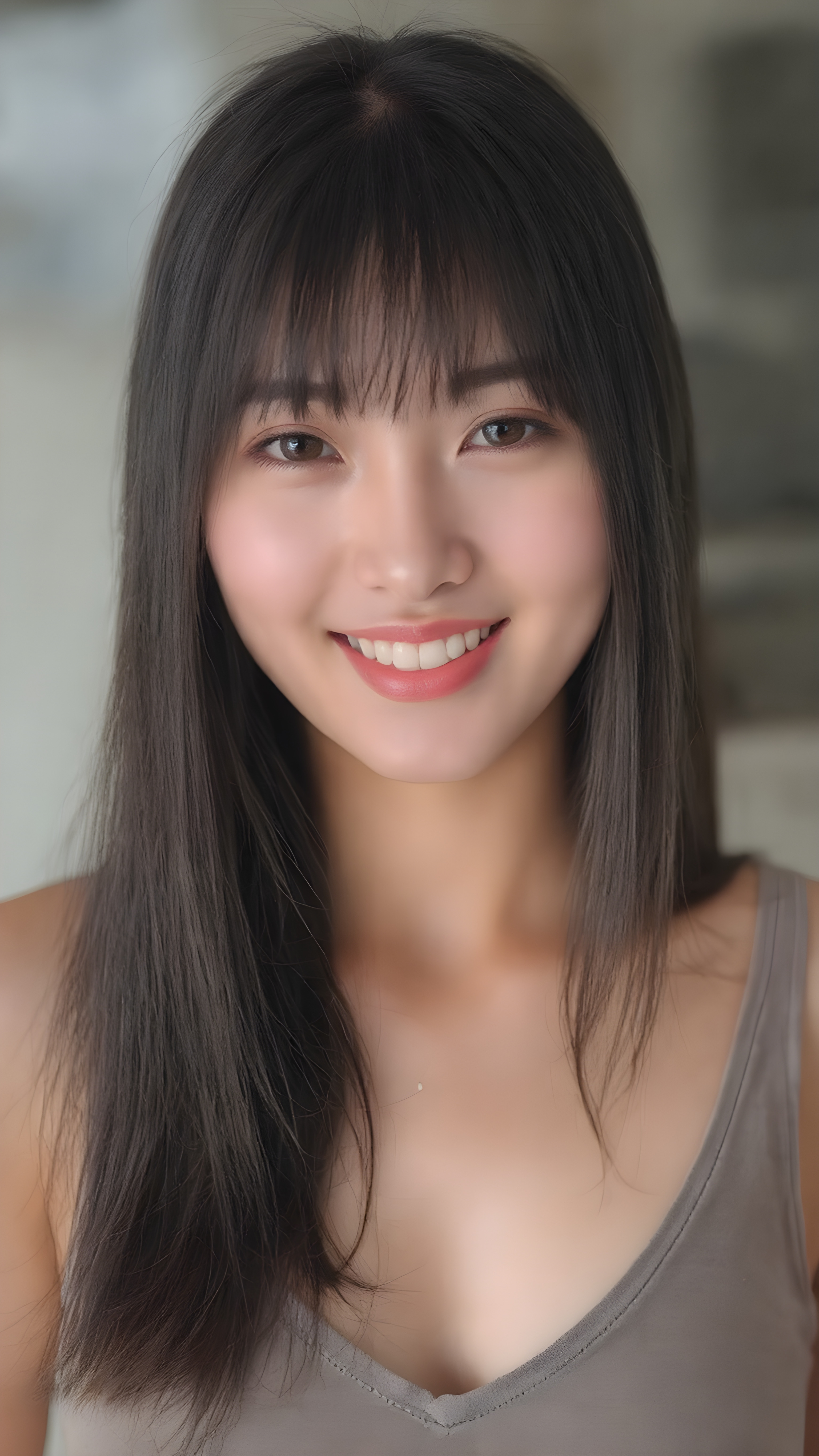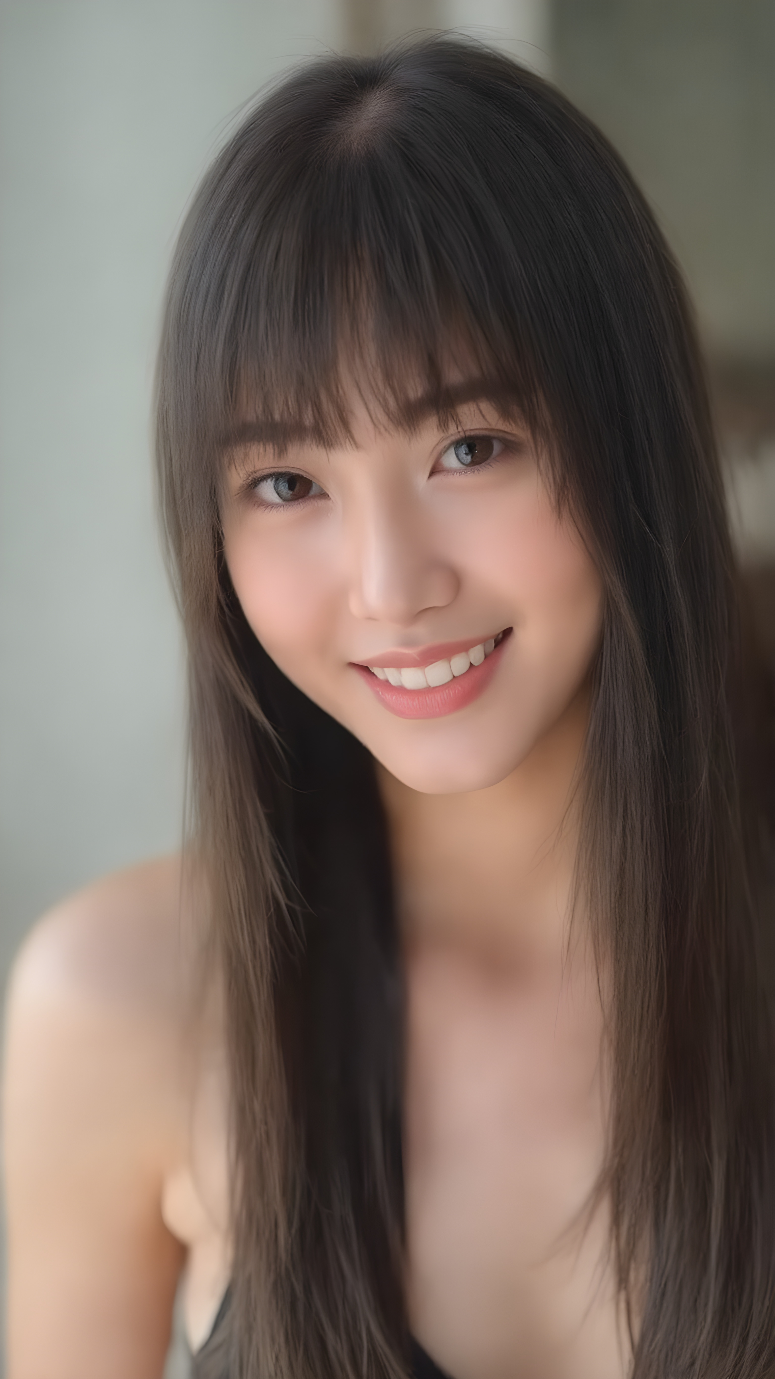 ((portrait photo)), with a (((gorgeously straight, sleek and shiny, white teeth shining brightly)), in a (((brightly detailed and high quality light and shadow photography))), featuring a (((beautiful young Korean girl))) with (((straight jet soft very long black hair, bangs cut))), her (((skin is beautifully toned and complements her look))), with (((soft, diffused lighting))) that brings out her (((best features))), including (((perfect white balance))) and (((dynamic depth of field))), as if captured by a (((professional studio photography team))).