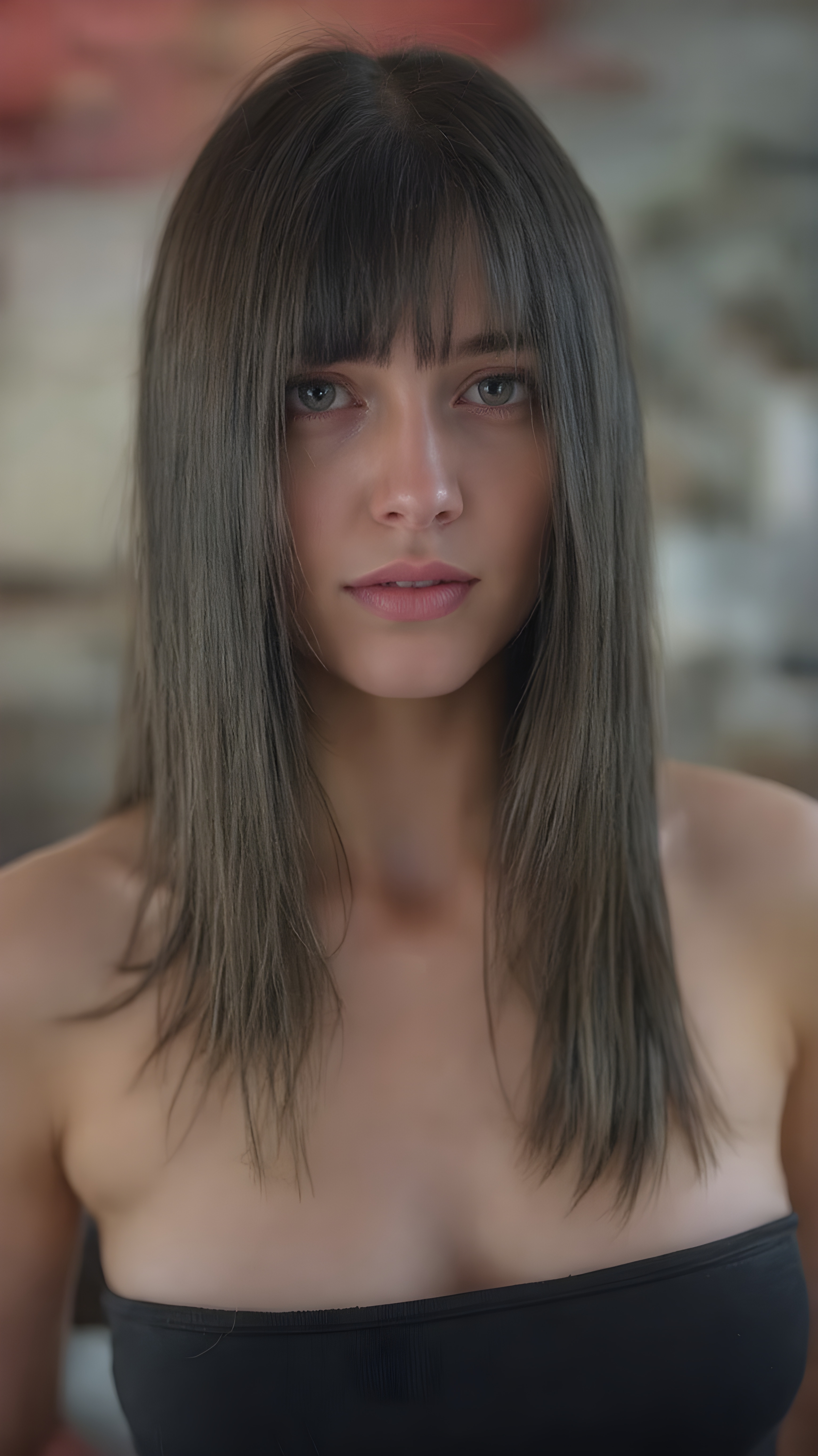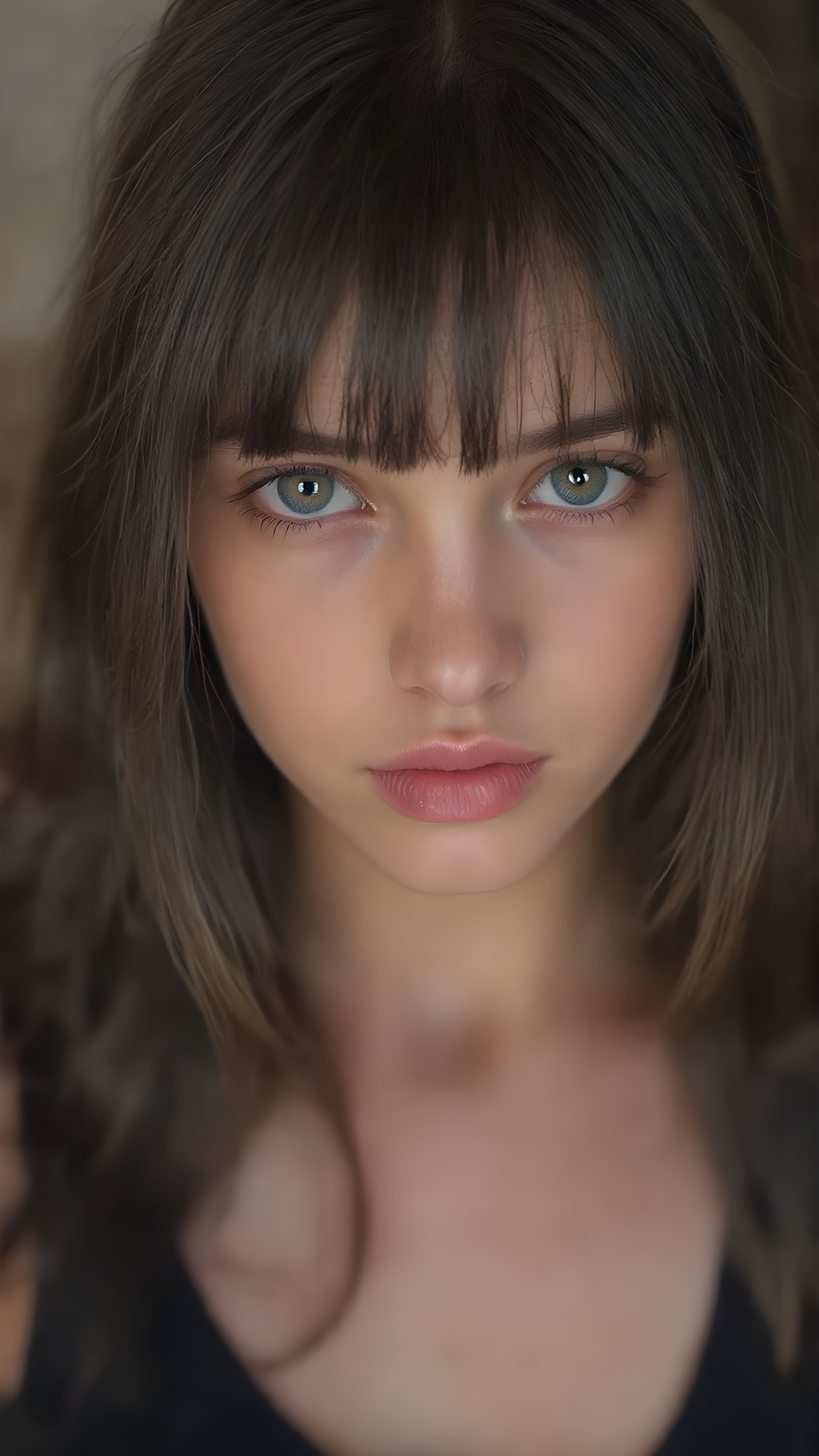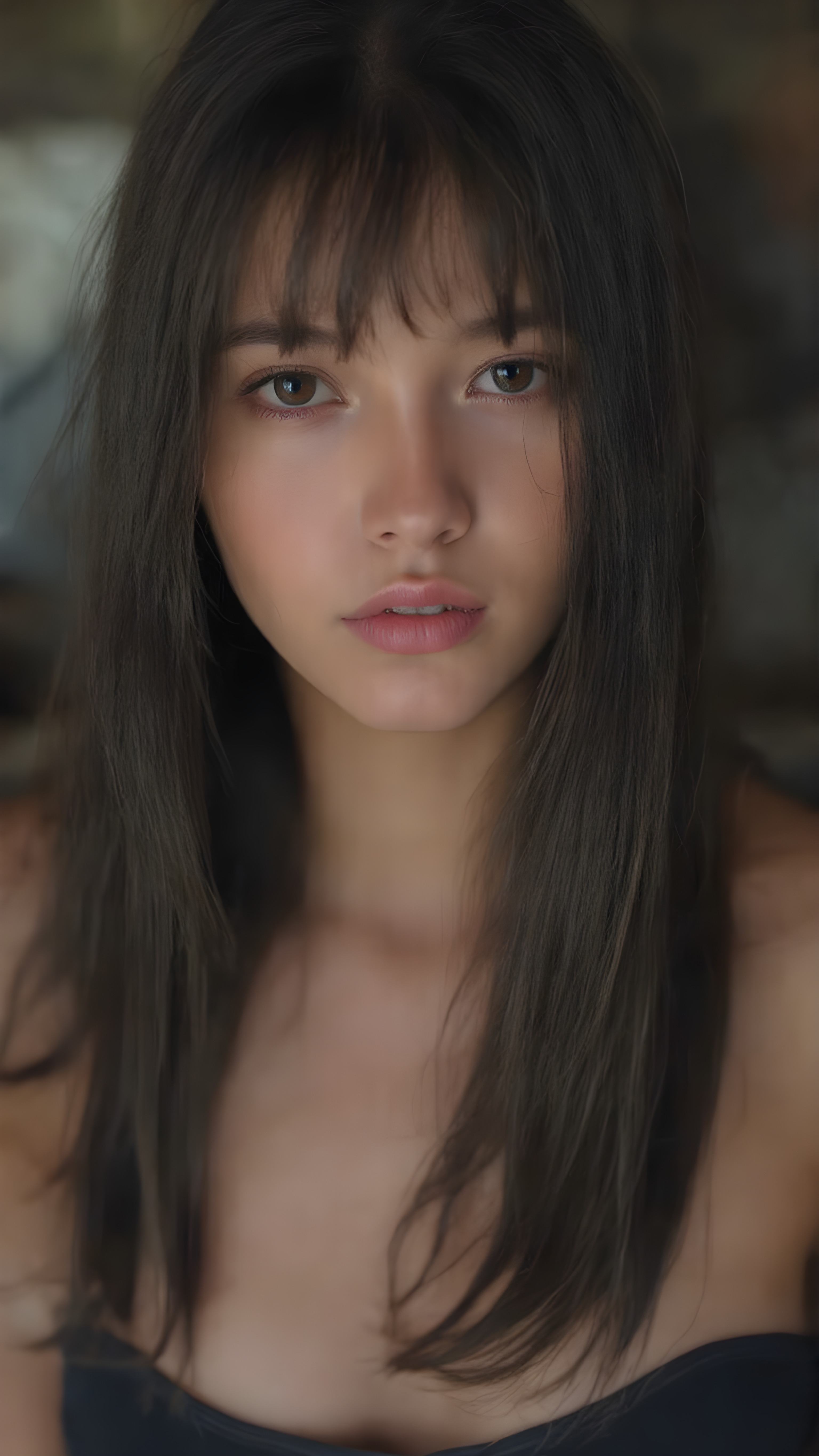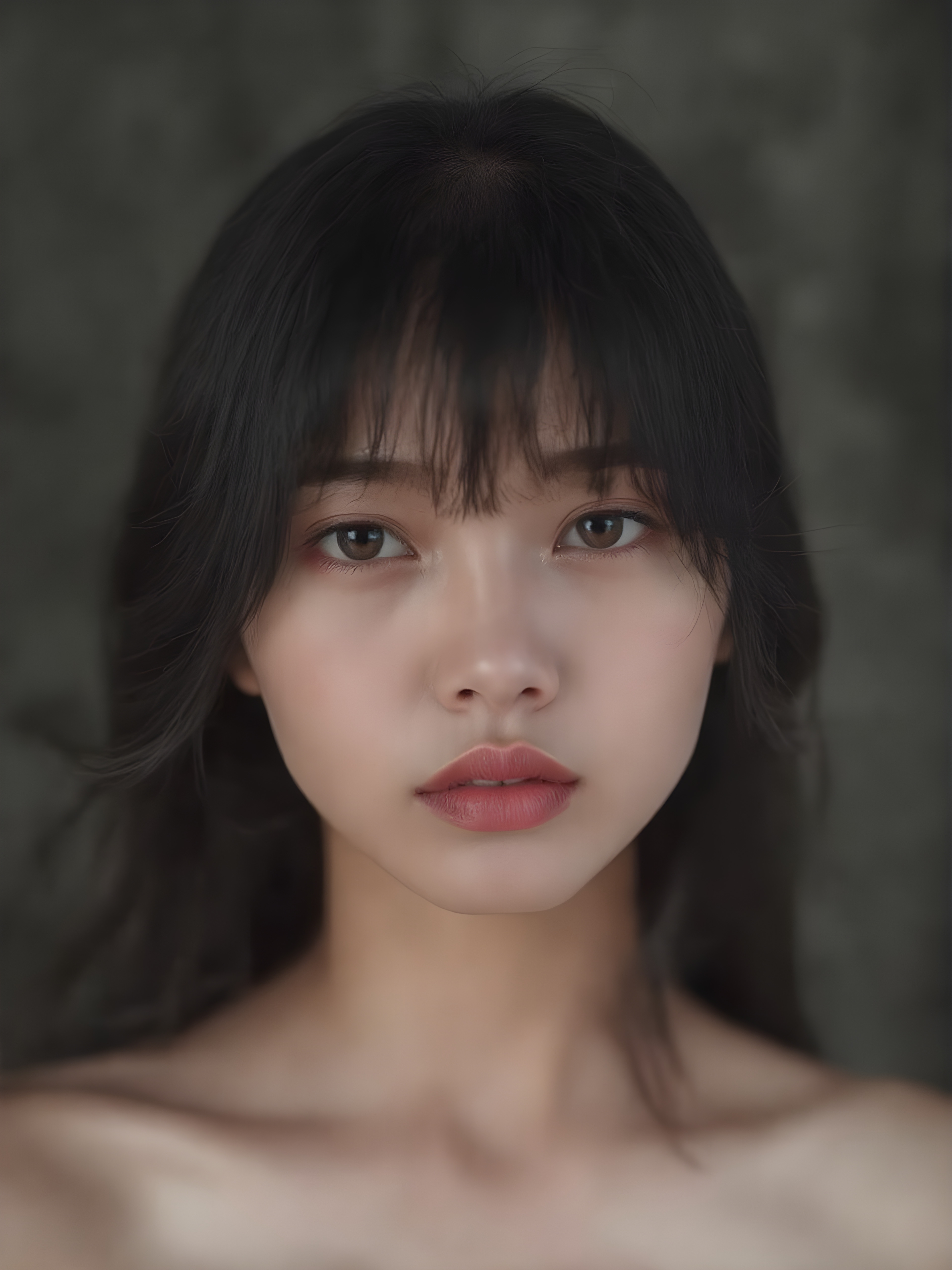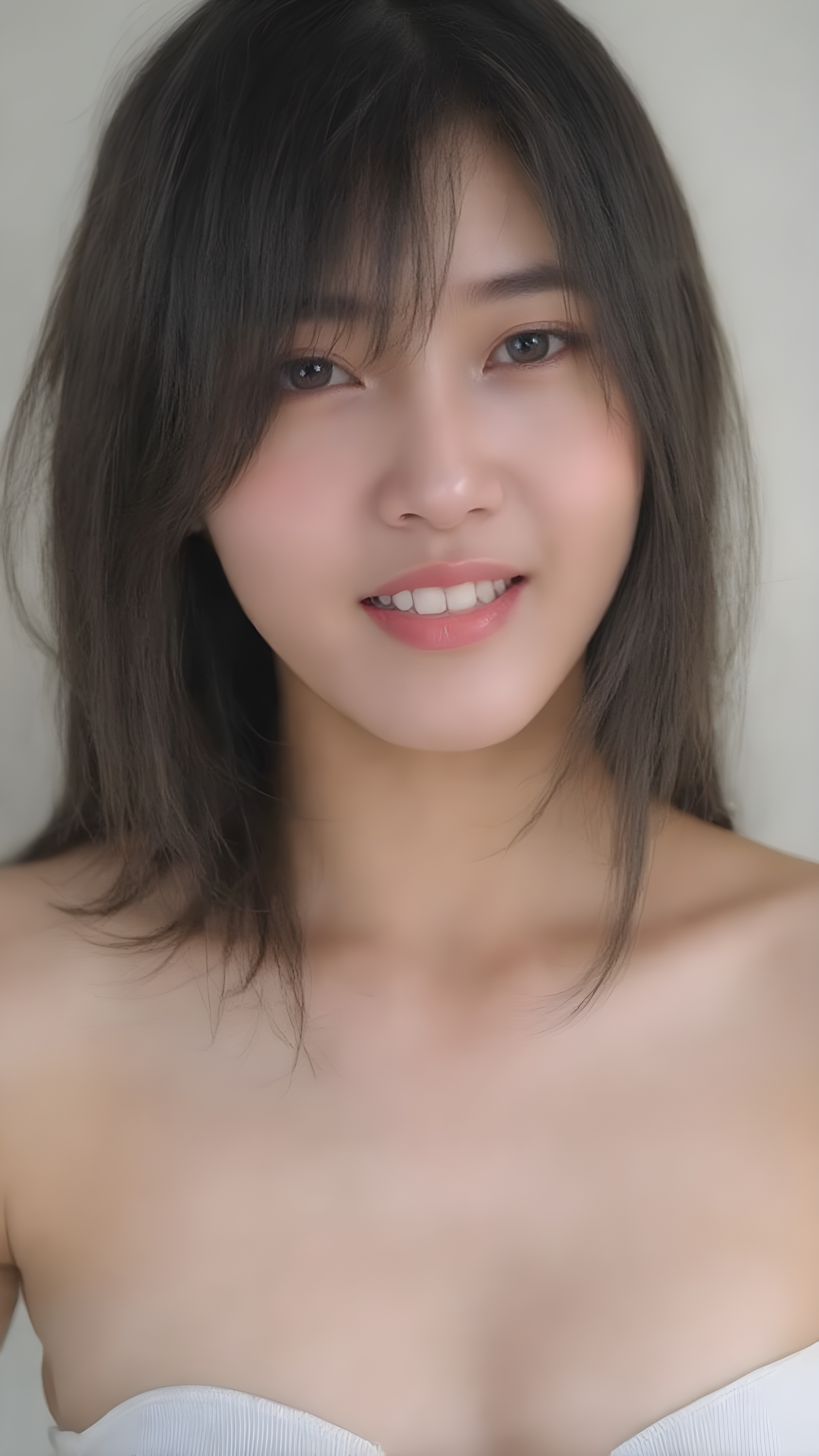 ((portrait photo)), with a (((gorgeously straight, sleek and shiny, white teeth shining brightly)), in a (((brightly detailed and high quality light and shadow photography))), featuring a (((beautiful young Korean girl))) with (((straight jet soft very long black hair, bangs cut))), her (((skin is beautifully toned and complements her look))), with (((soft, diffused lighting))) that brings out her (((best features))), including (((perfect white balance))) and (((dynamic depth of field))), as if captured by a (((professional studio photography team))).