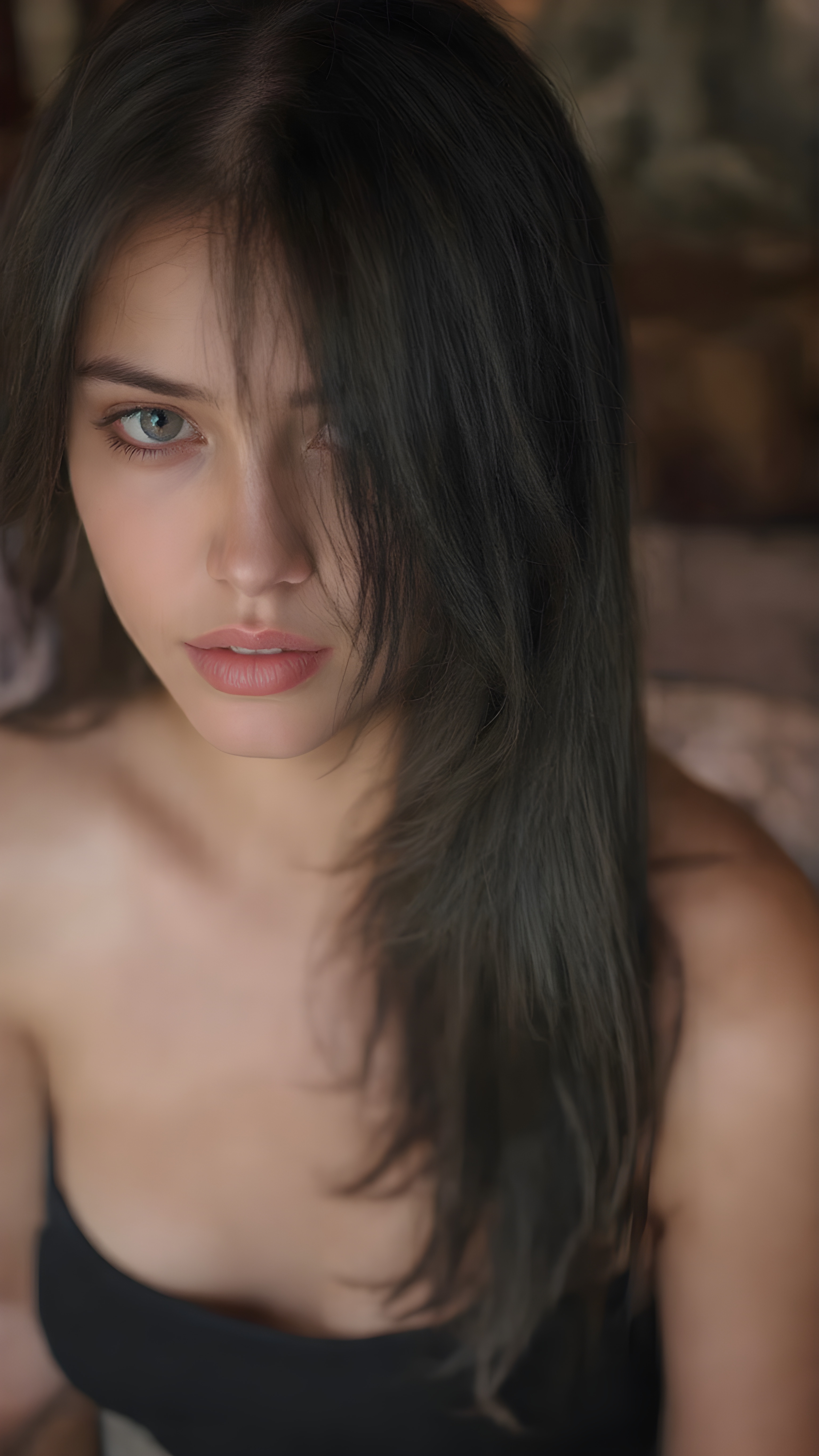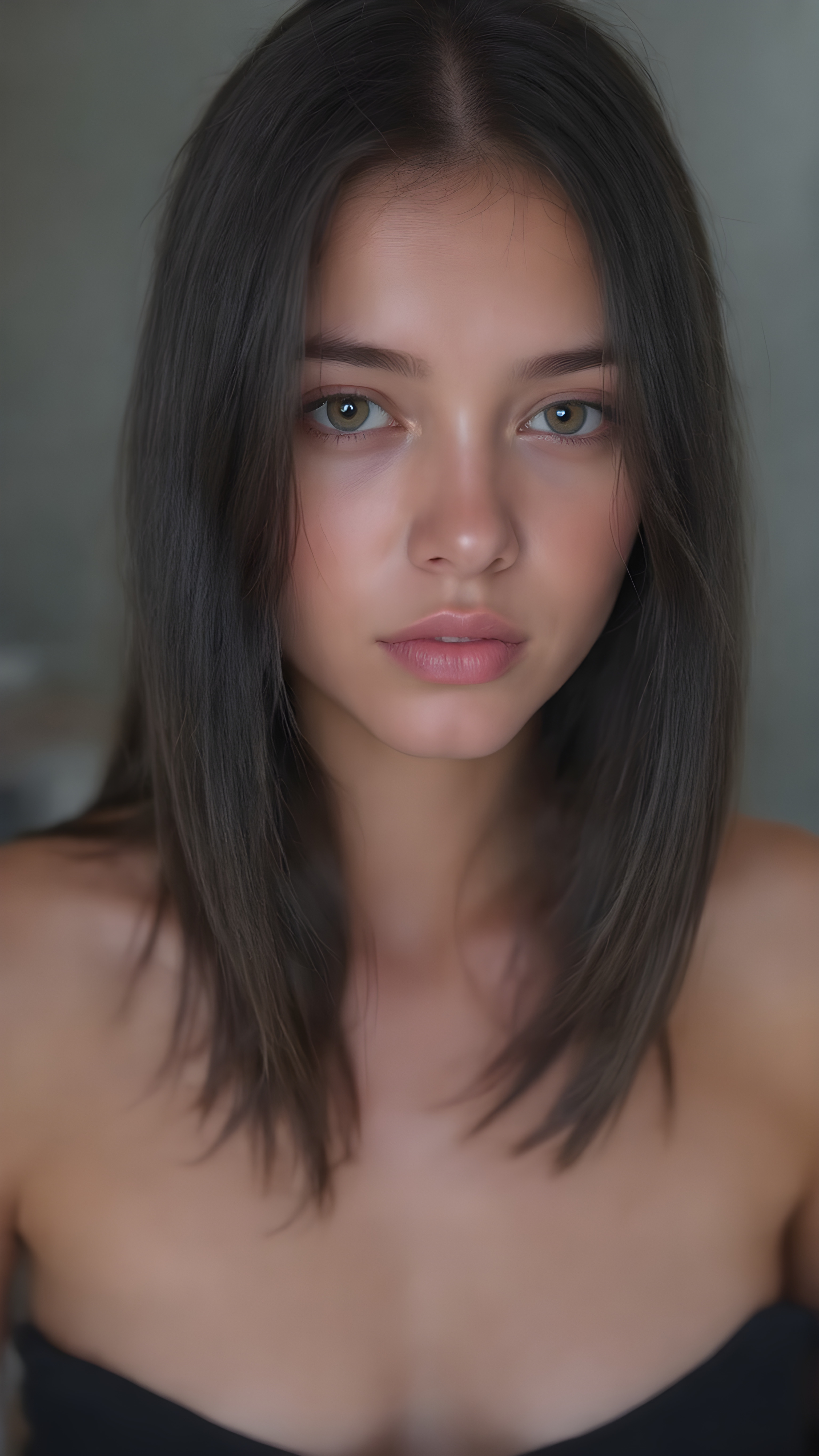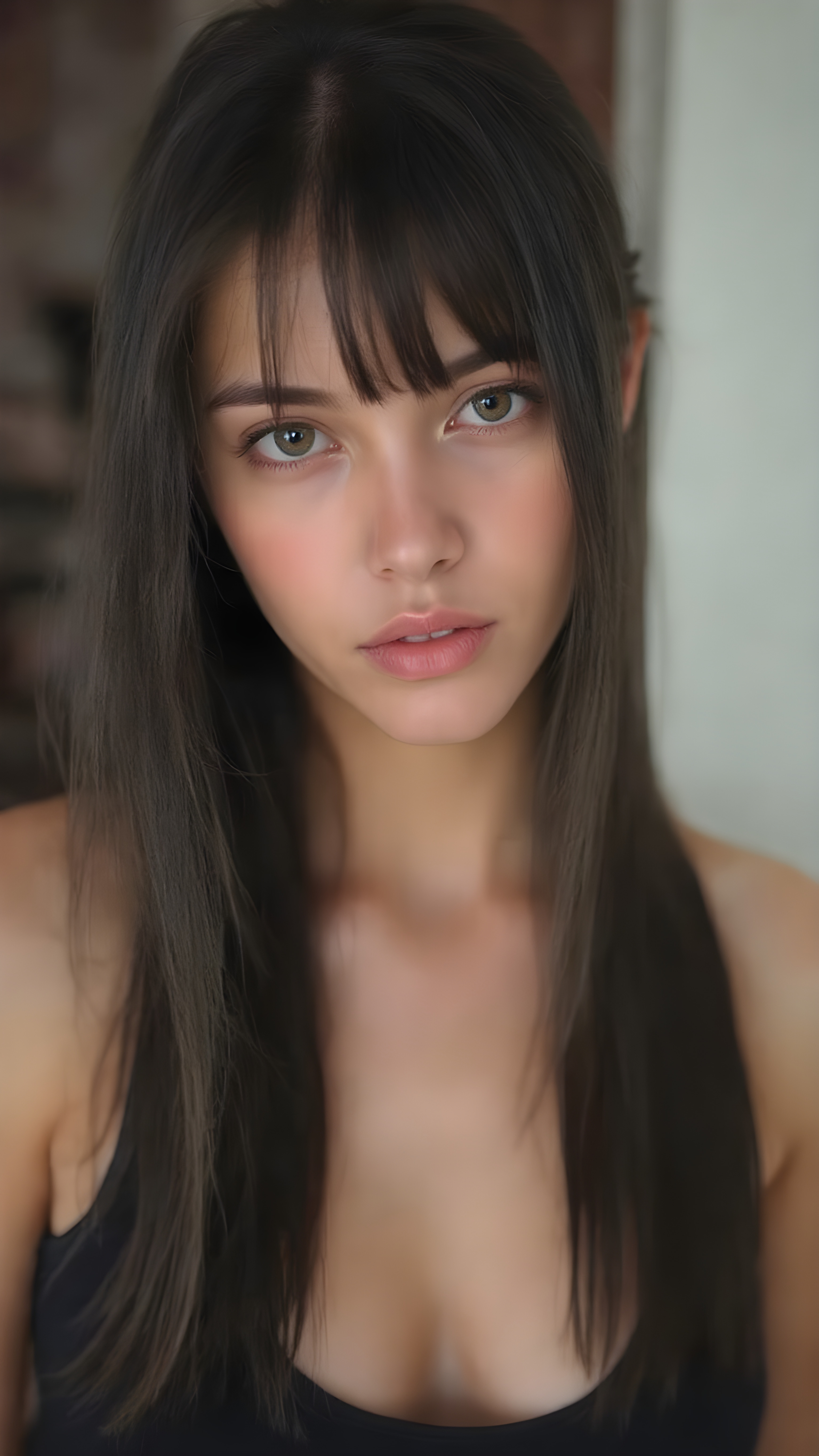 a (((young girlie))), sexy and provocative look, wears a short cropped black tank top, straight soft long black hair, ((round face)), full kissable lips, round eyes, perfect skin