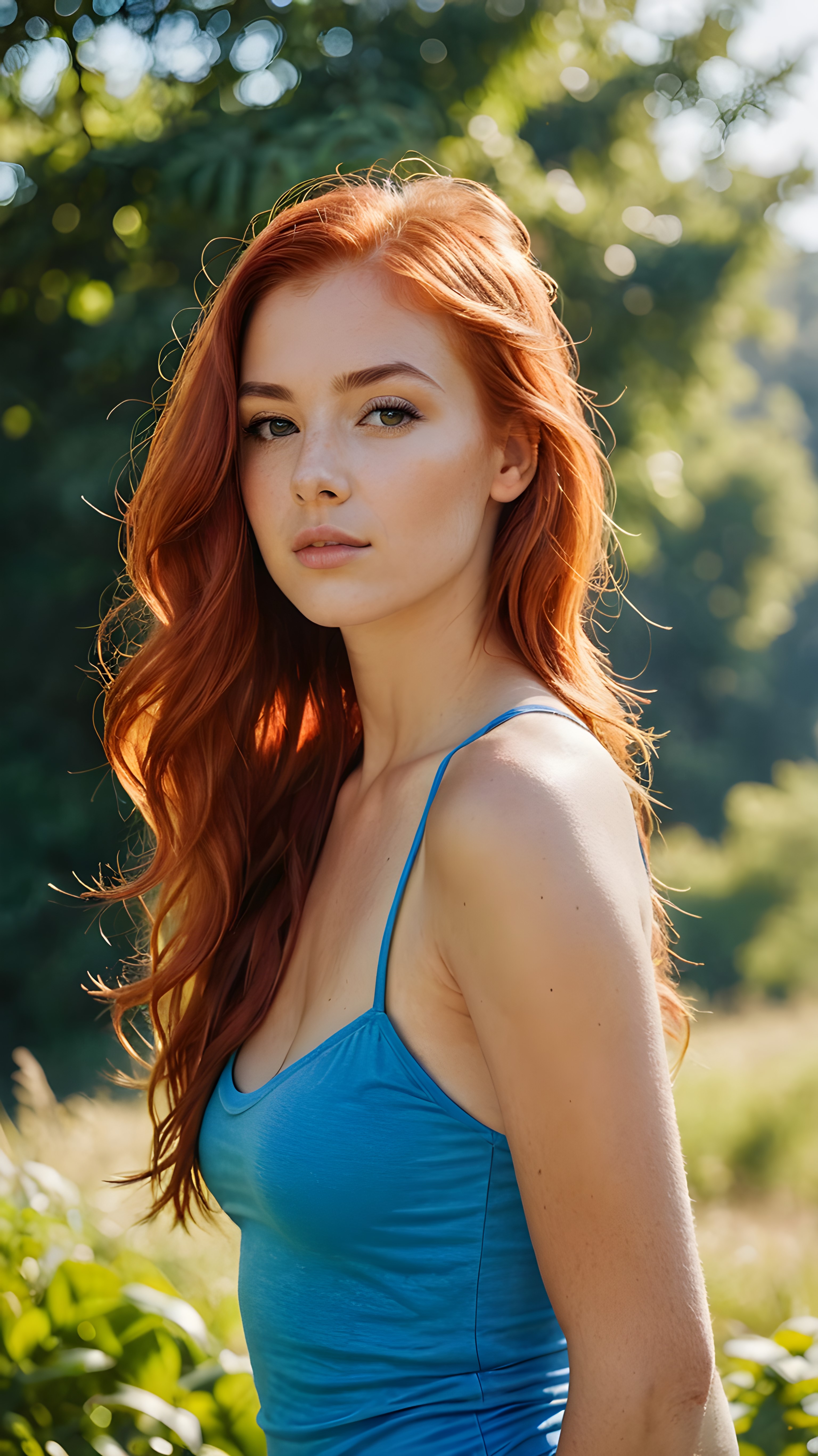 a (((sensual young girl with red hair))), wearing a sleek, strapless, ((tight blue tank top)), with her long soft hair flowing around her shoulders, natural sunny backdrop