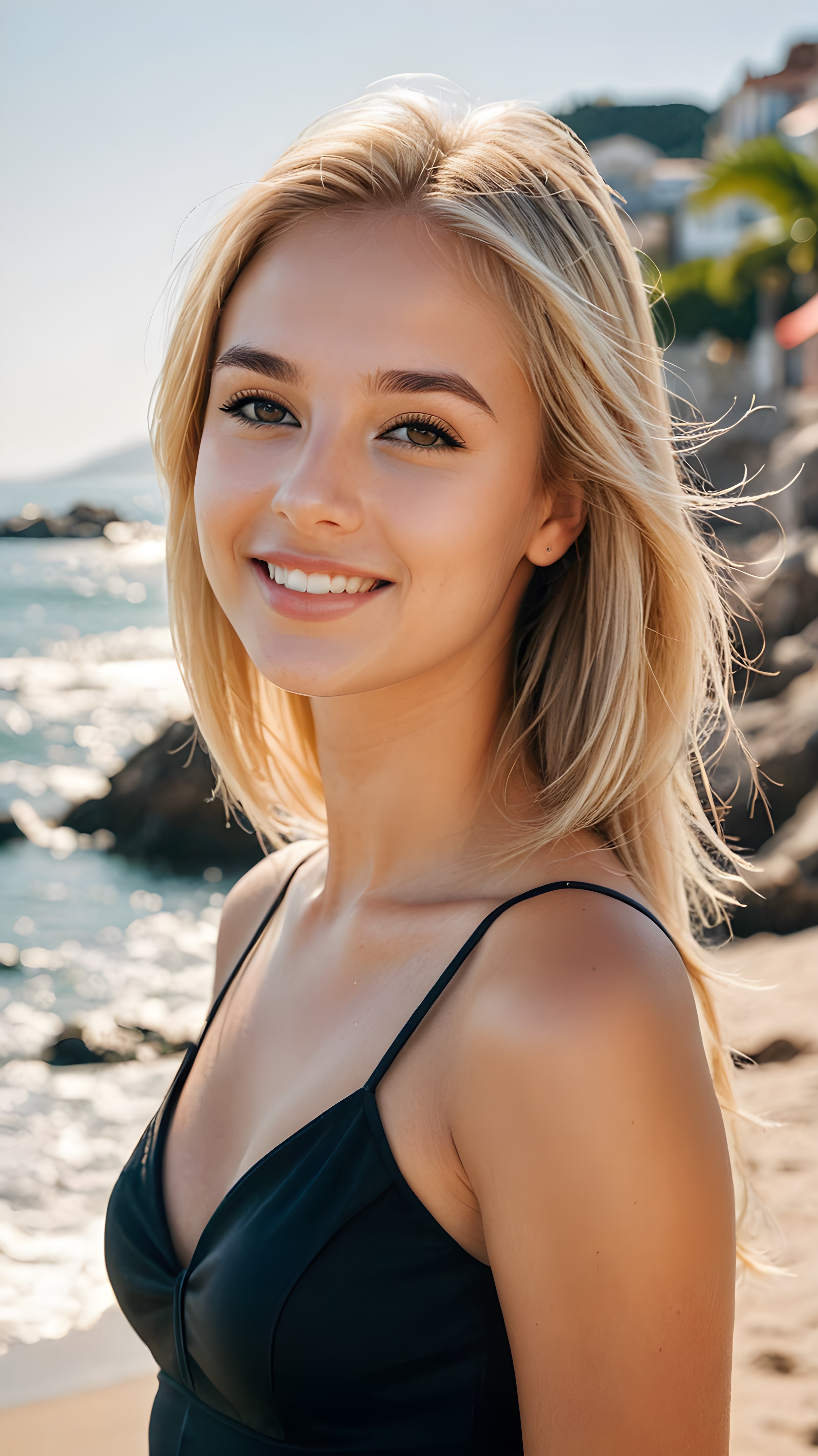 create detailed photo: a (((sensual young girl with straight soft blond hair))), wearing a sleek, strapless, ((tight black top, deep v-neck)), round face, smile, sunny beach backdrop