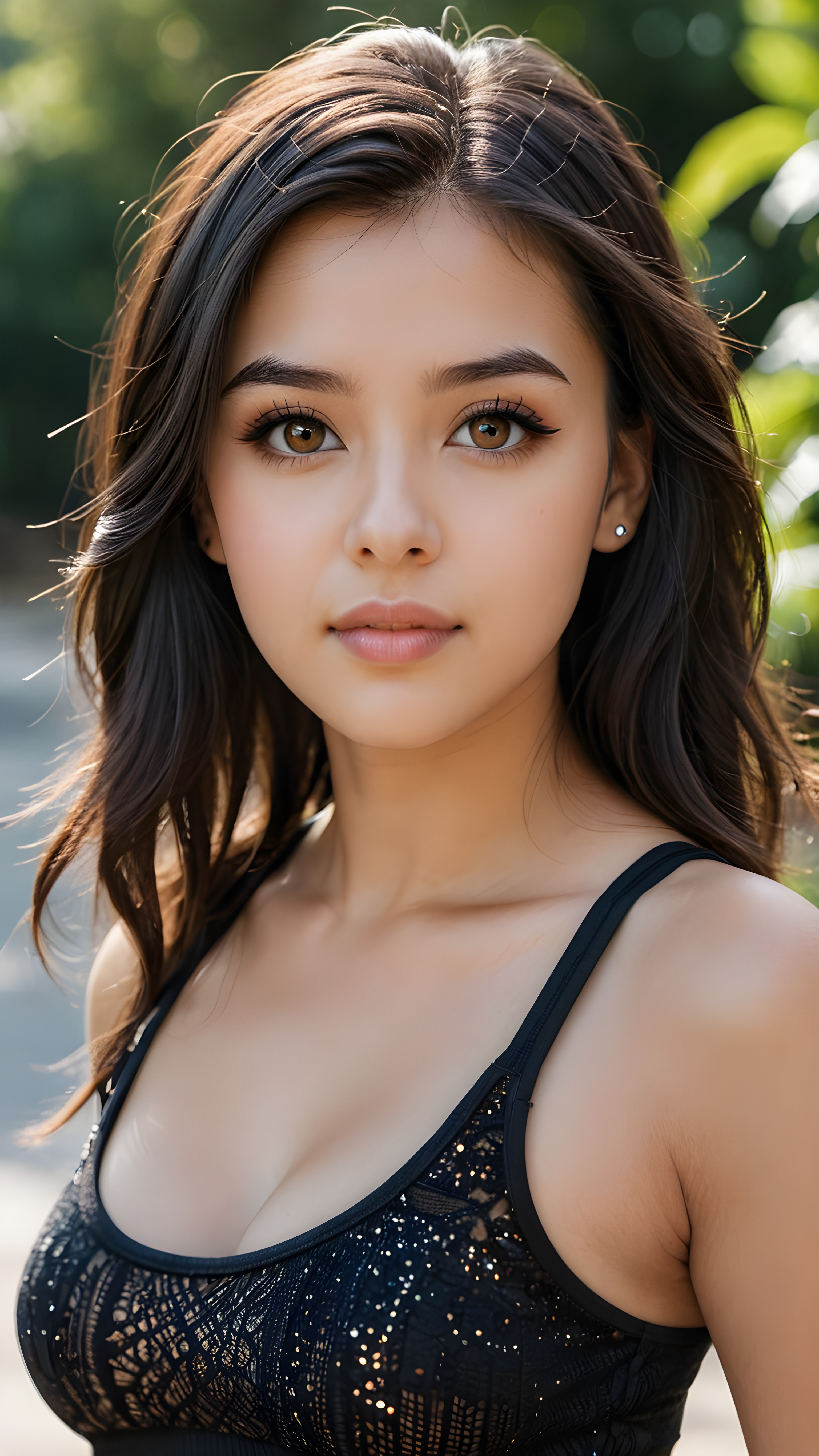 a (((busty teen girl))) with long, luxurious obsidian hair and softly arched eyebrows, framing piercingly beautiful, ((light brown eyes)), ((she wears a soft and short cropped tank top))