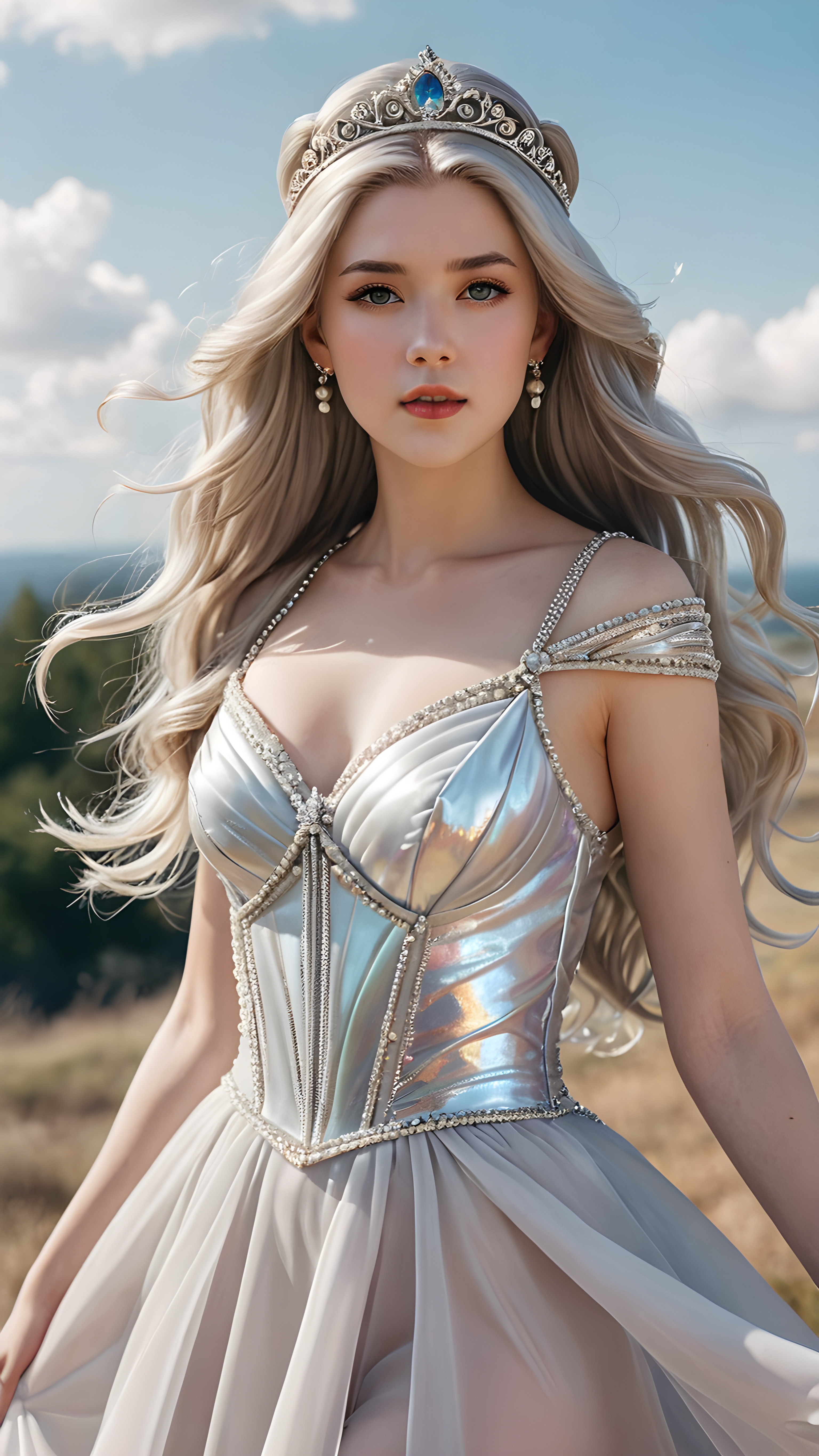 a stylized drawing of an elegant (((adult princess of the Element of Wind))), with gray eyes and pale, porcelain skin. Her long (((translucent, iridescent hair))) is swirling in a windy sky backdrop, complemented by a (((silver tiara))). She’s dressed in a (((windy pearlescent dress in white))), with a forlorn expression that suggests heartbreak and sorrow. Anatomically accurate details elevate this advanced prompt to a level of ethereal beauty that’s both visually pleasing and emotionally evocative