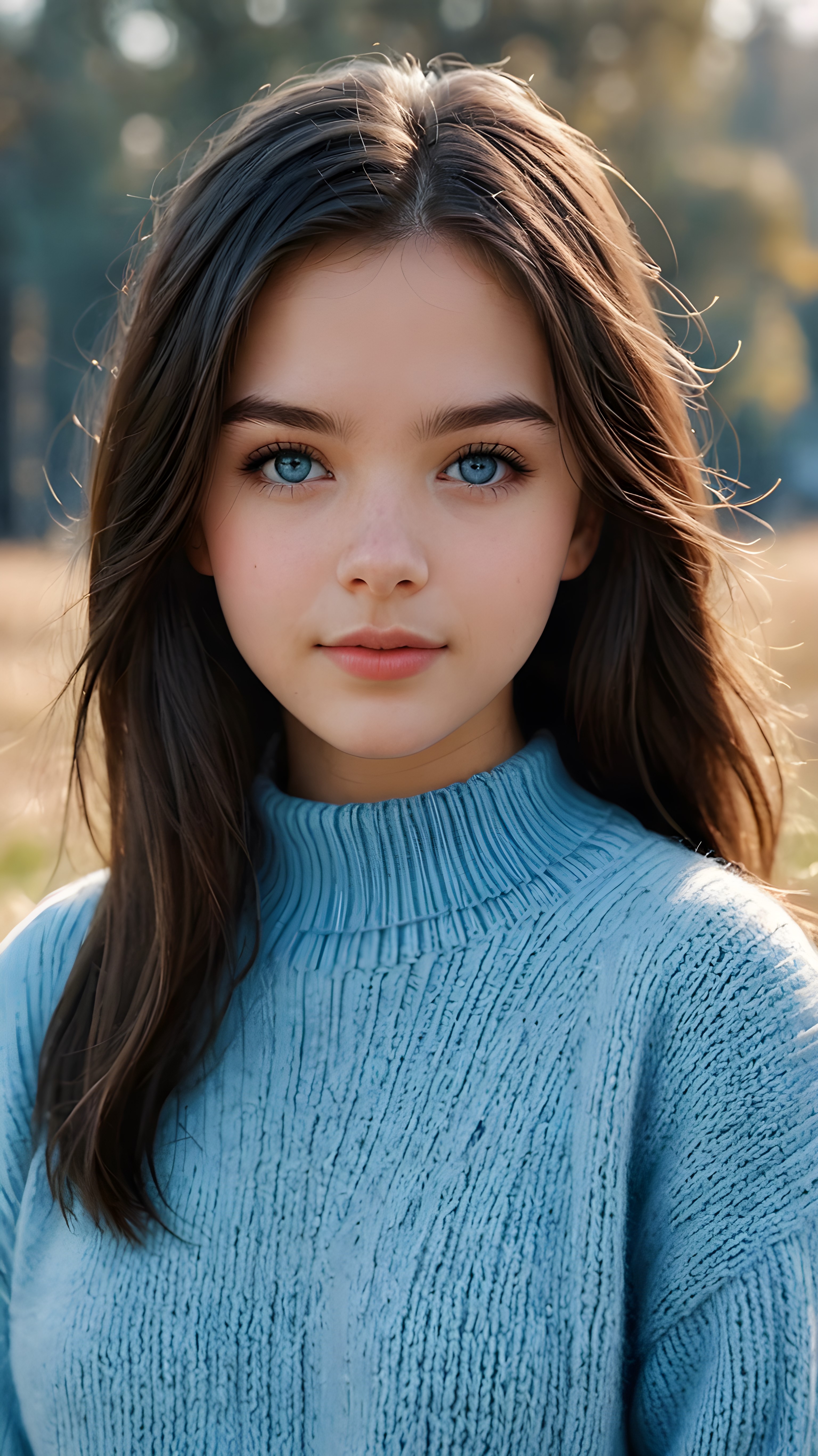 a ((teen girl)), her hair is black and with long straight haircut, full lips, soft outfit, light blue eyes, she wears a wool sweater, 4k, realistic and detailed photo