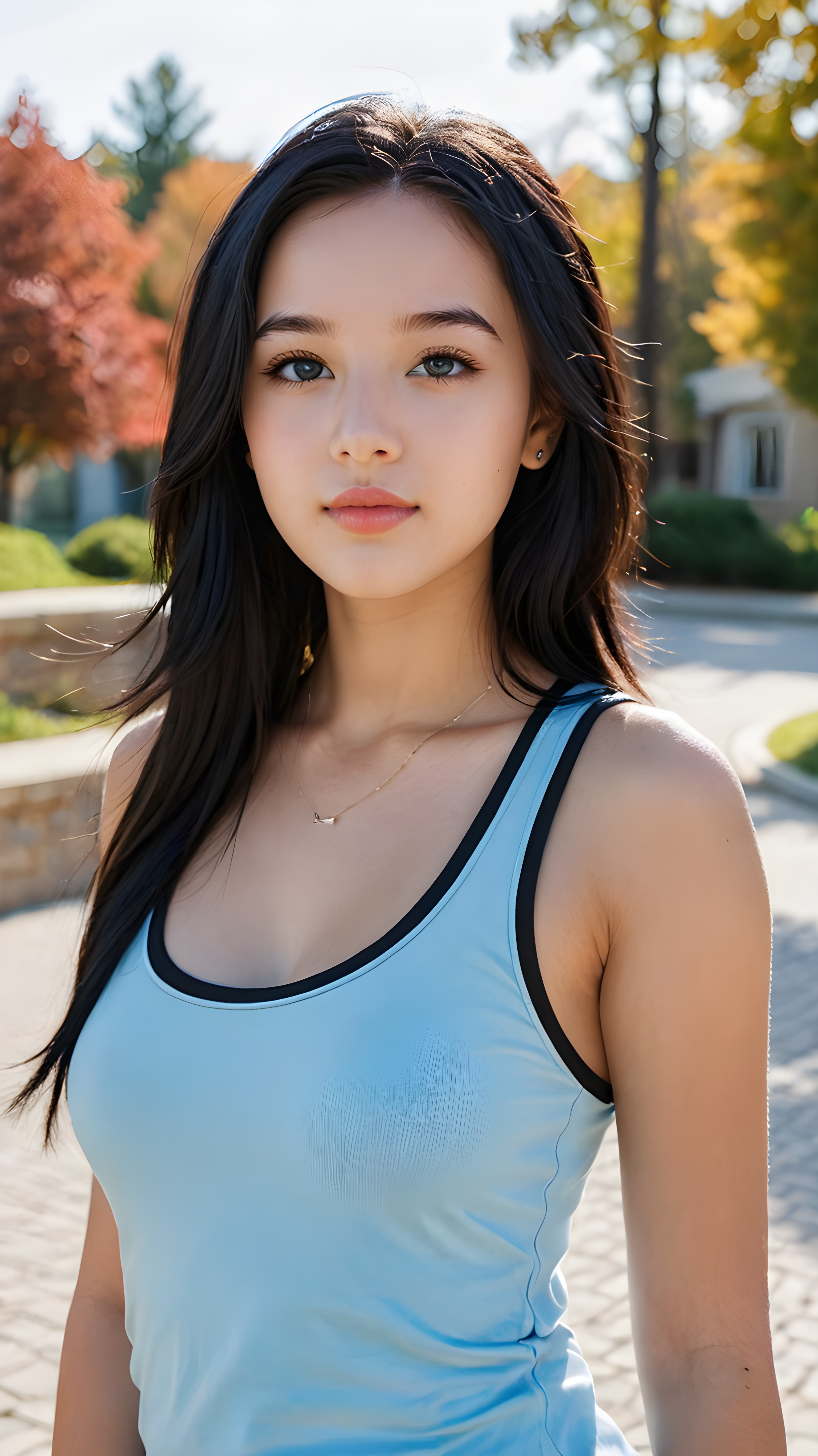 a (((teen girl))) with long, luxurious black hair and softly arched eyebrows, framing piercingly beautiful, light blue eyes. Her full lips are contrasted by a (((modern fall-collared tank top))), which complements her advanced yet timeless style