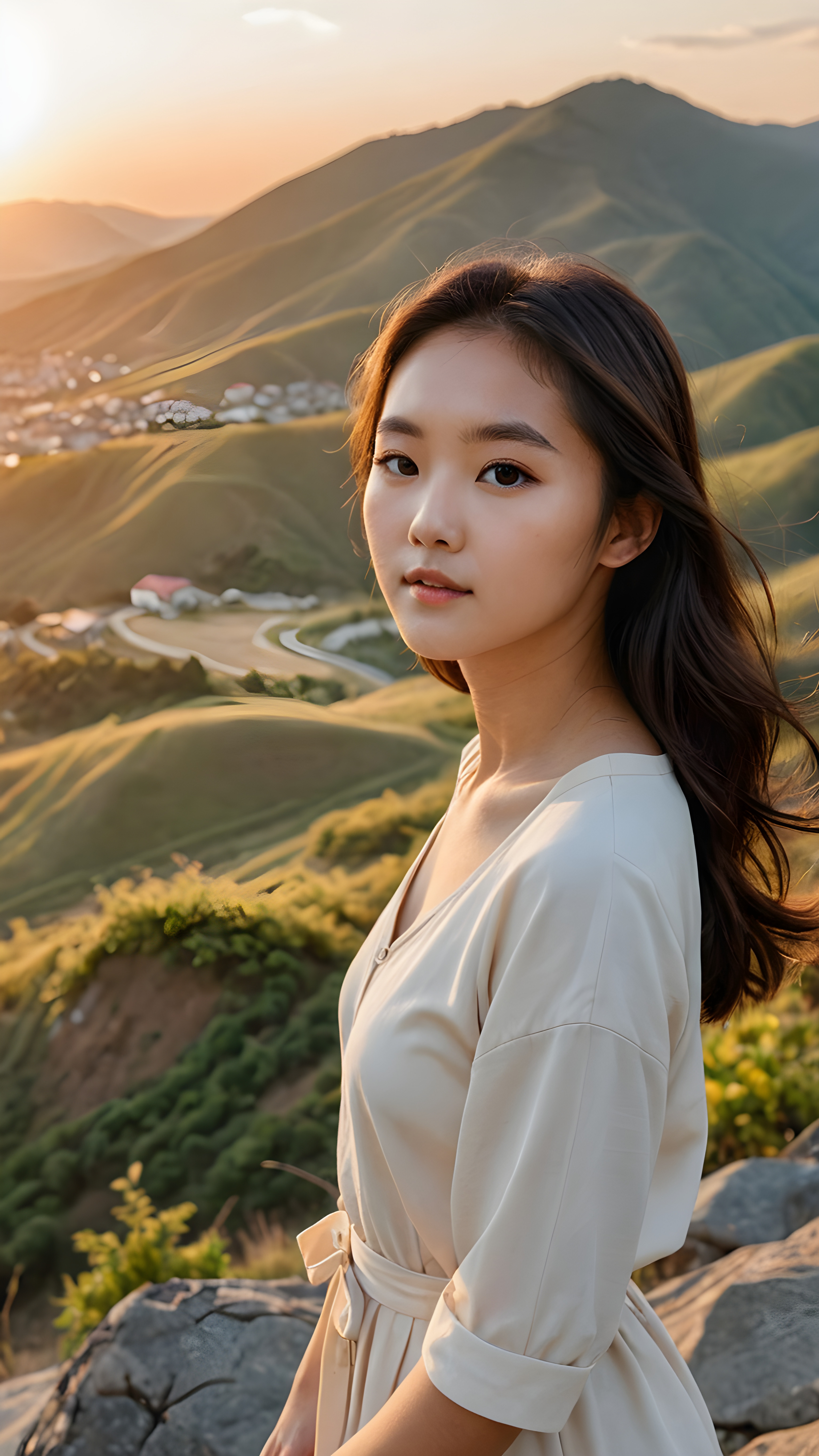 a (((Natural Korean Girl))) standing confidently on a scenic (((hill))), framed against a breathtaking backdrop of a (sunset-filled valley)