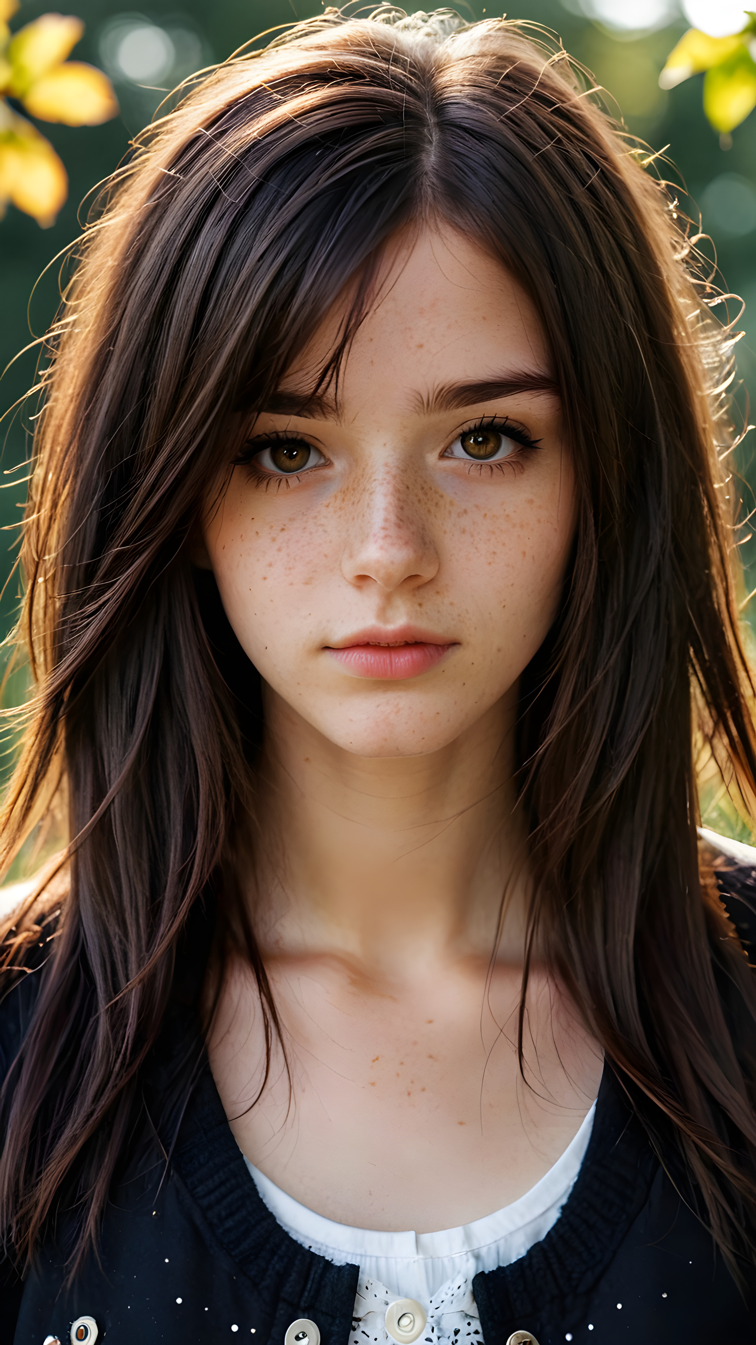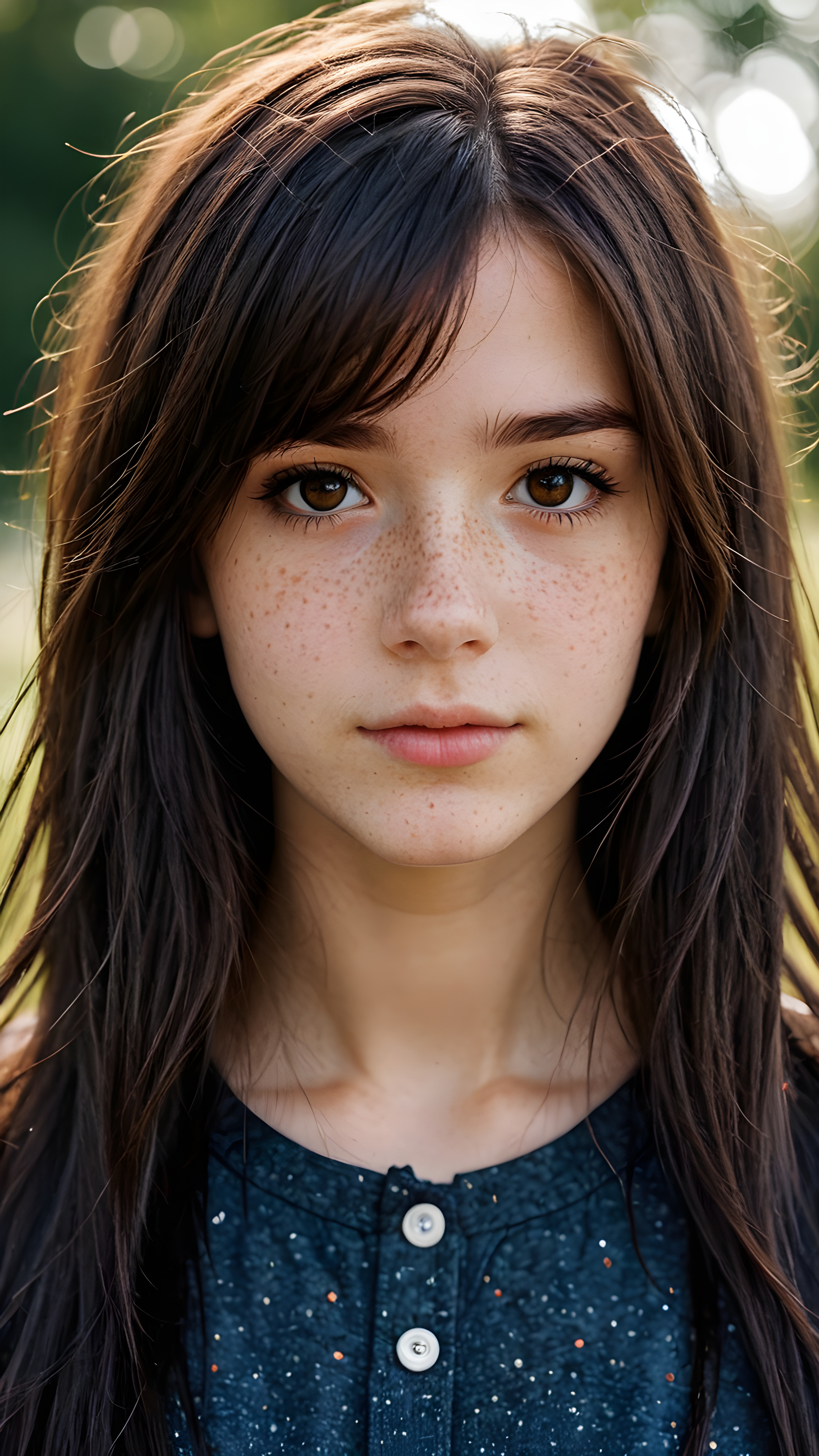 a breathtakingly beautiful (((14-year-old emo girl))) with warm amber eyes and luxuriously thick (((dark brown soft hair))), which subtly shift towards a deep navy at the tips, framing a face and a serenely fair complexion ((freckles))