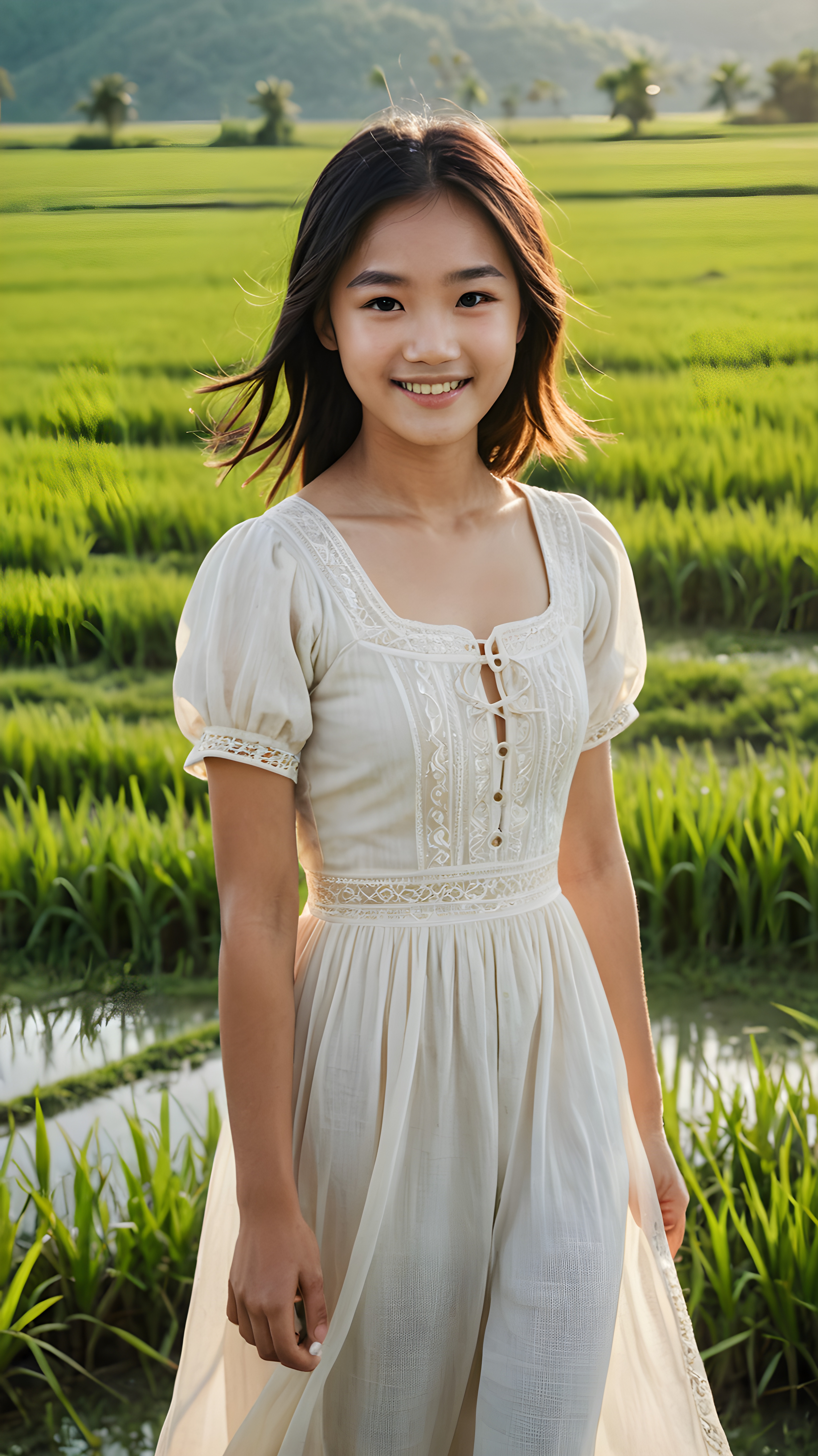 a (((young, beautiful Asian peasant teen girl))), dressed in a simple, flowing dress, smile confidently as she stands amidst a vast (((rice paddy))), her surroundings bathed in a serene, sunny glow