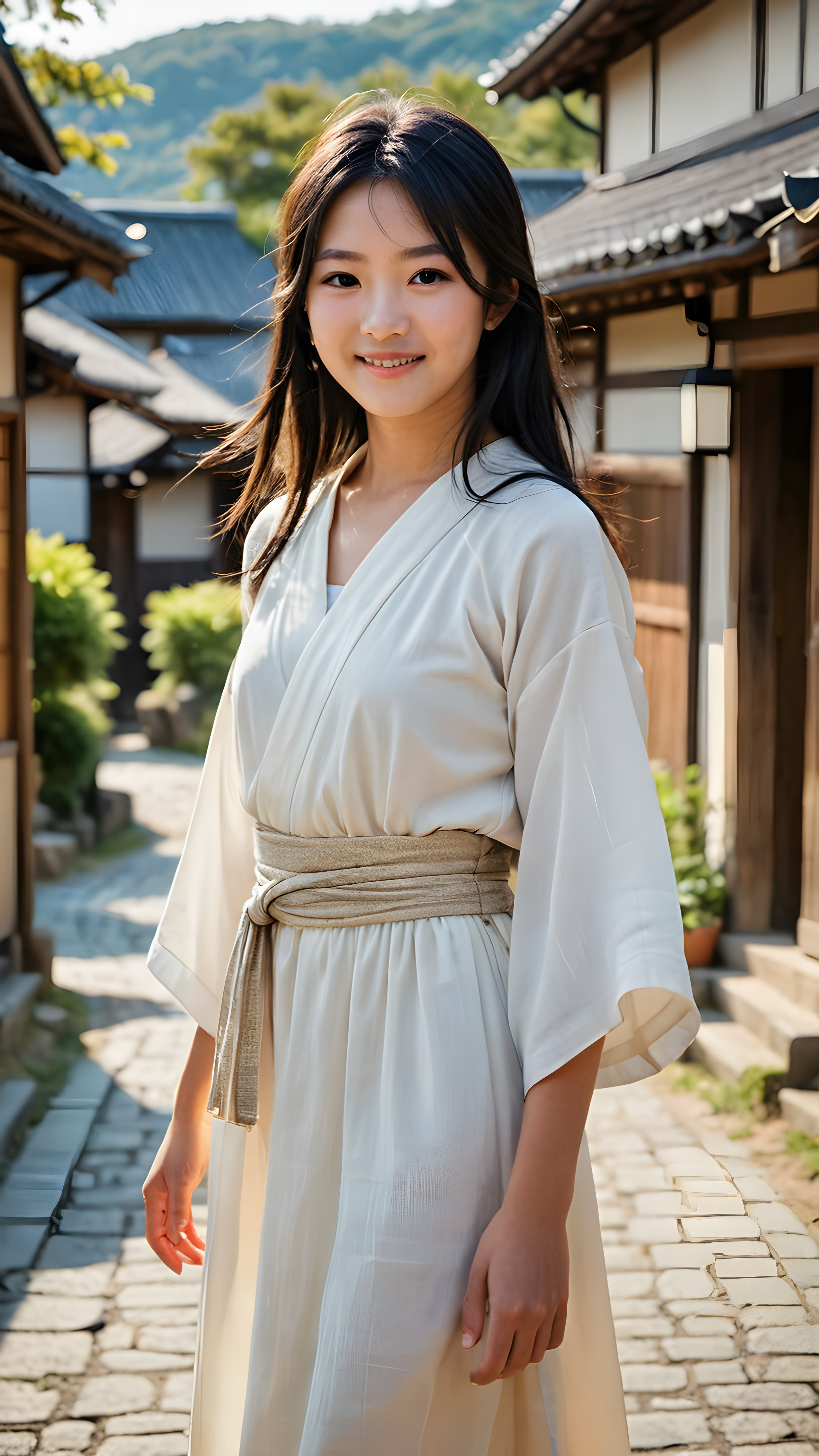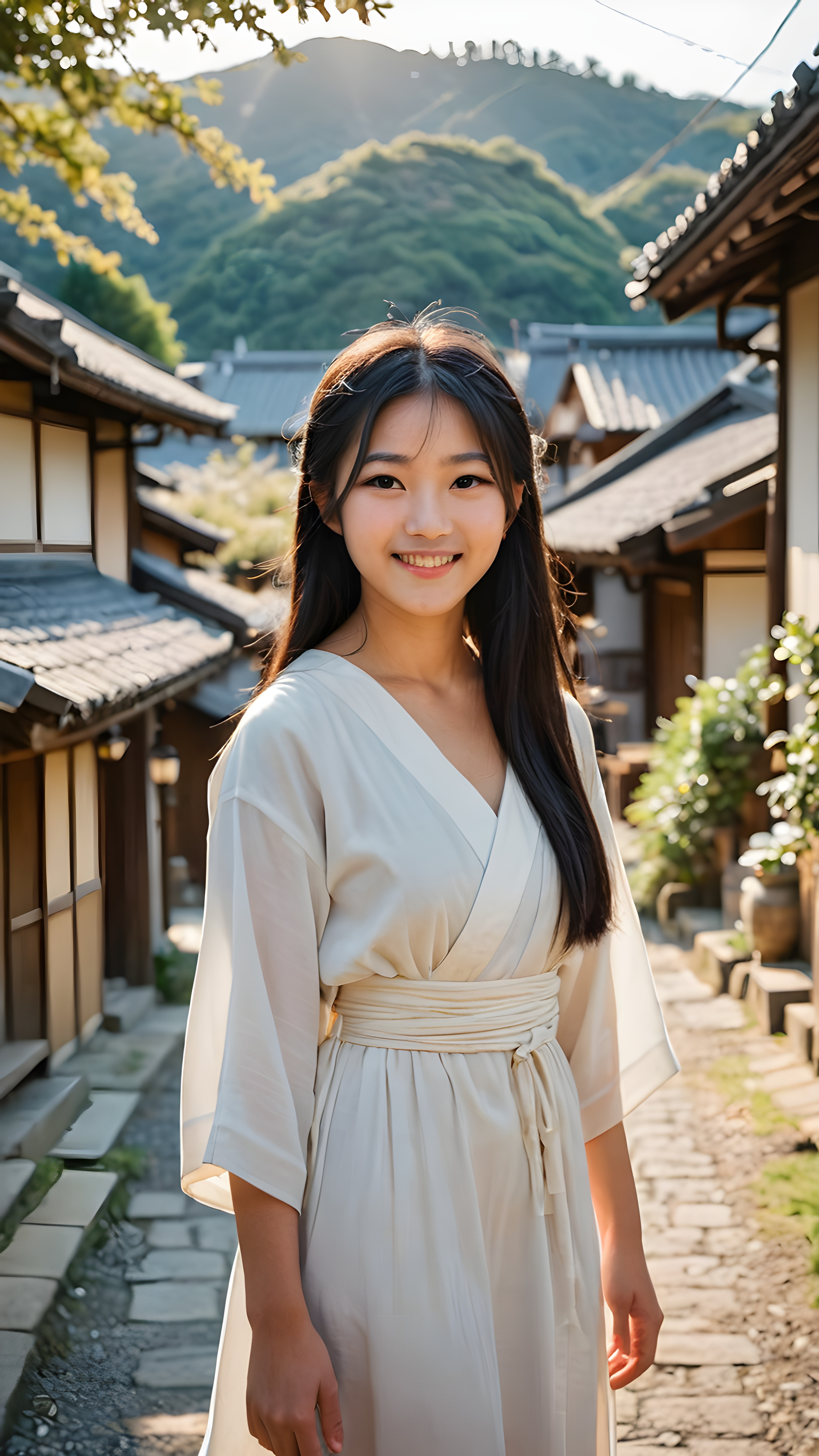 a (((young, beautiful Japanese peasant teen girl))), long straight soft black hair, dressed in a simple, flowing dress, smile confidently as she stands amidst a vast (((traditional village))), her surroundings bathed in a serene, sunny glow