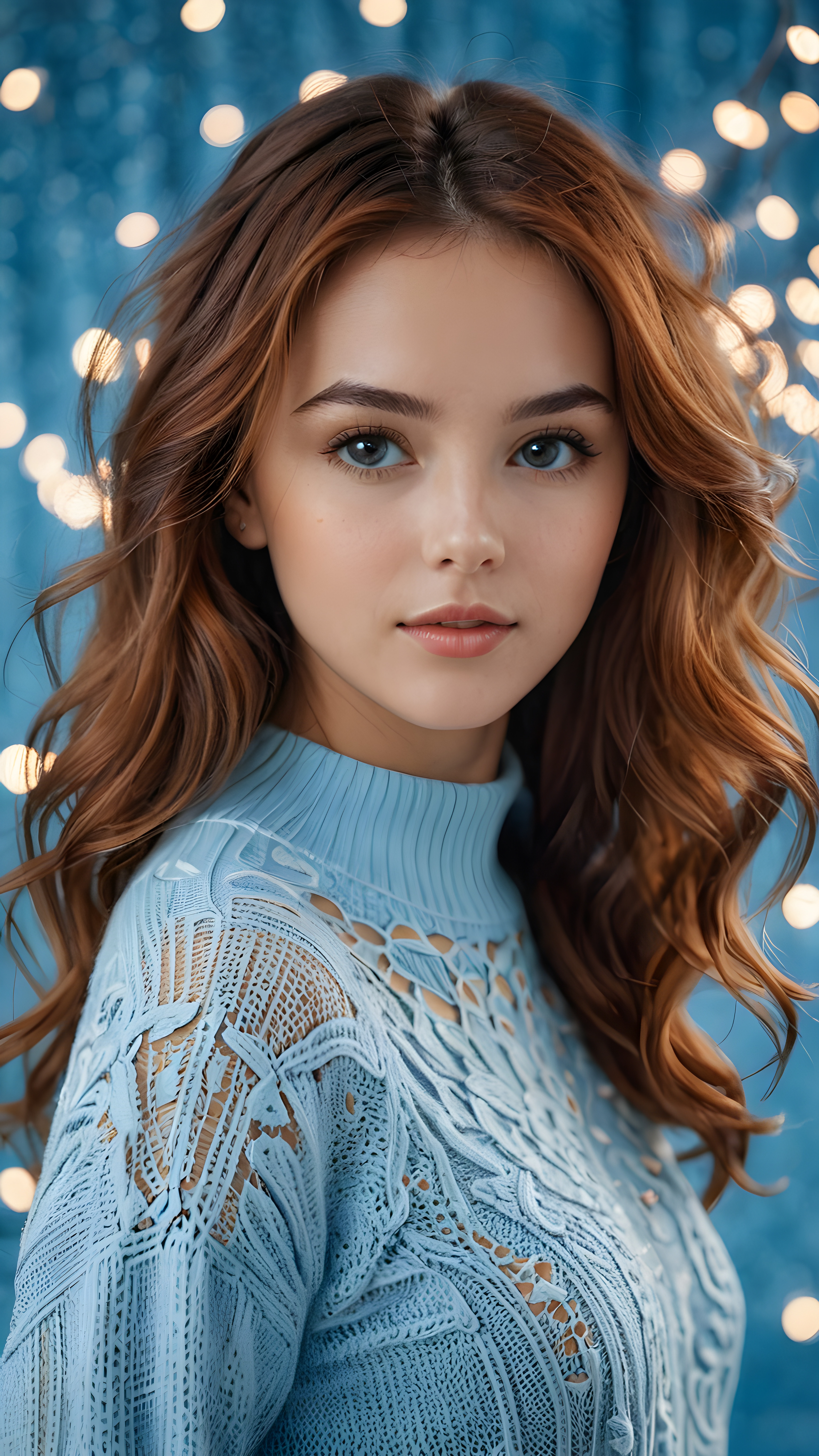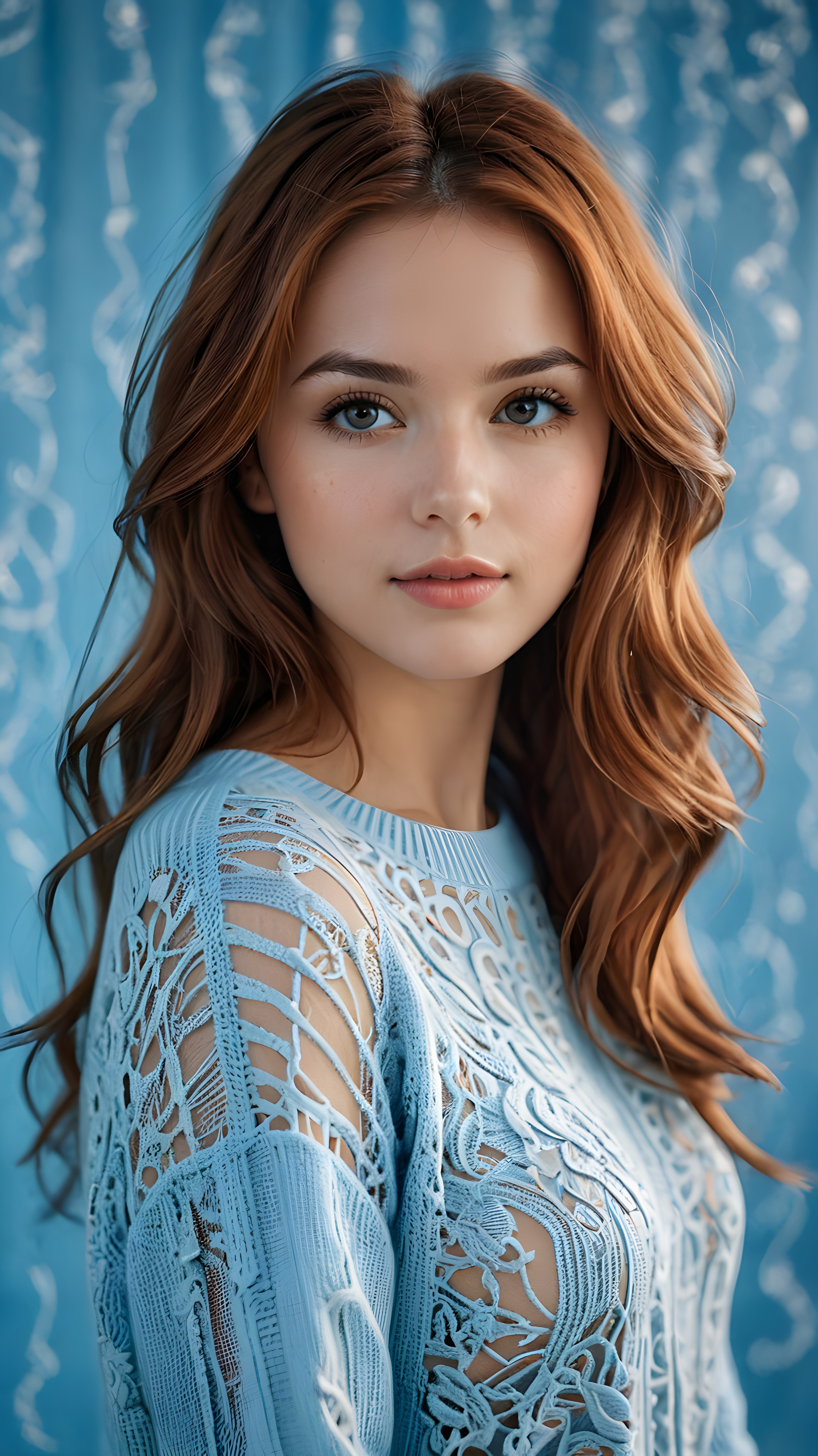 visualize a (((digital masterpiece))), with intricate digital patterns swirling around her (((thin, light blue sweater))), complementing her flawless form and flowing, soft, long, Hazelnut-hued tresses. Her lips exude a (seductive glow) against this digital backdrop