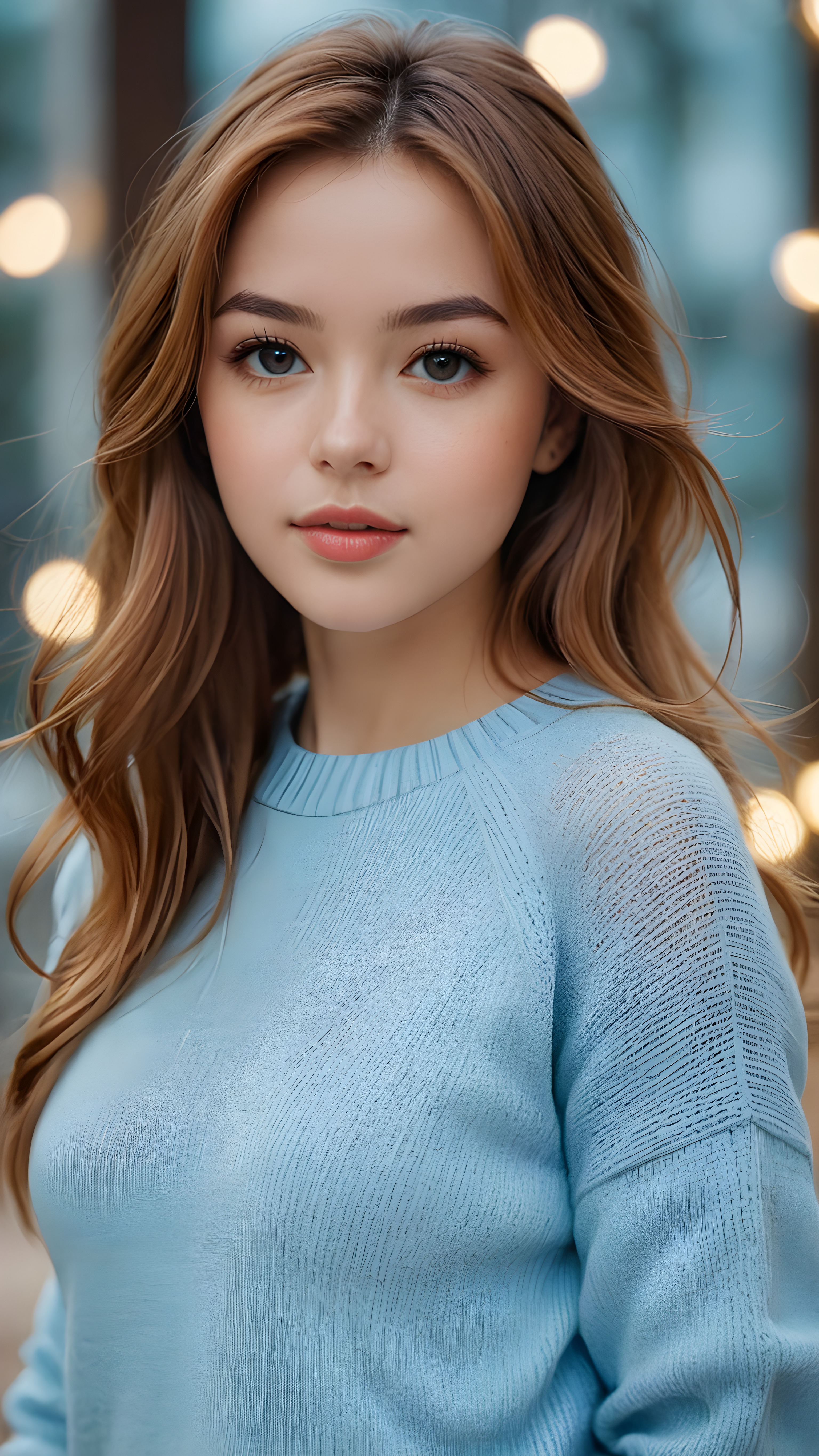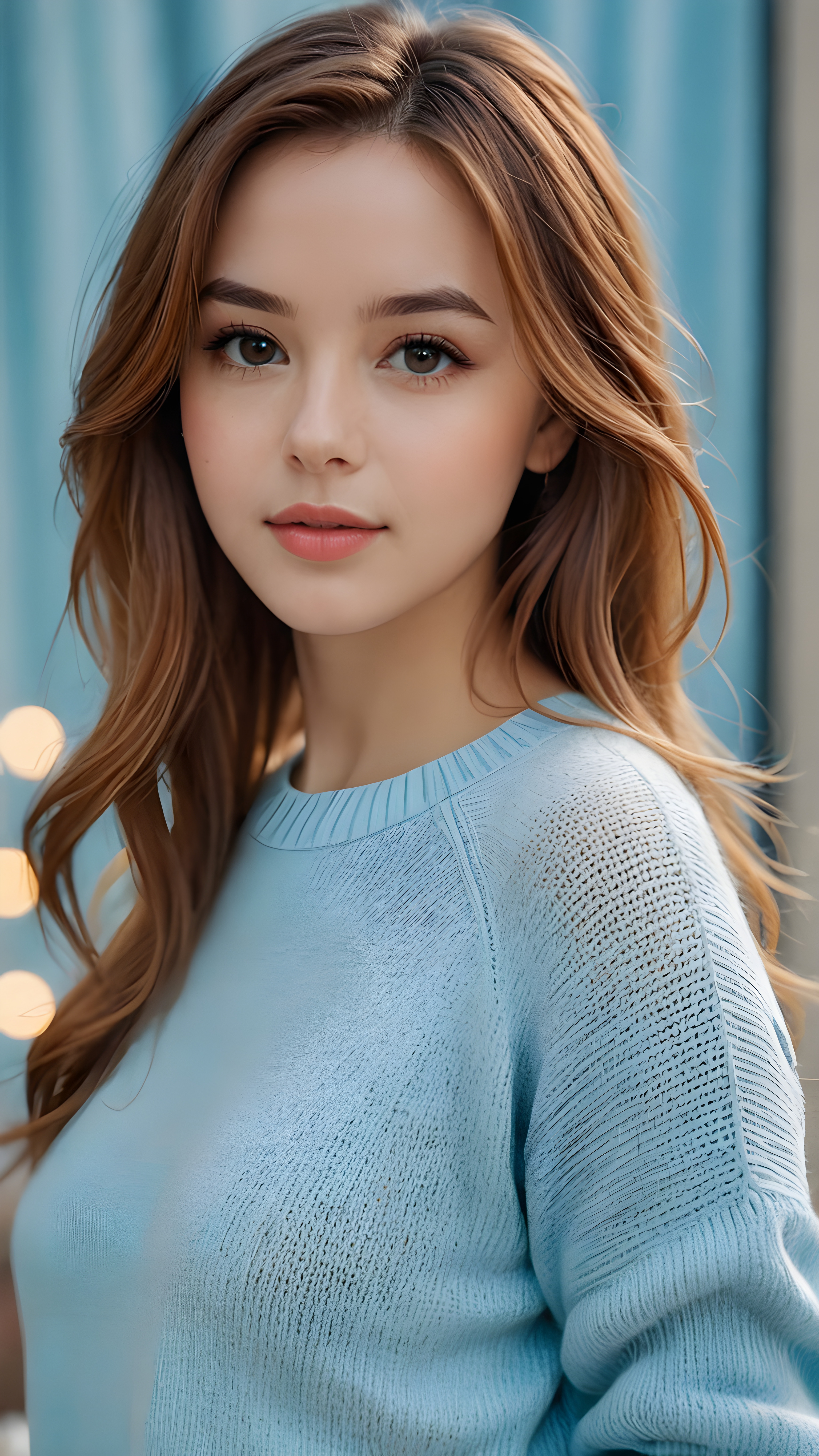 visualize a (((digital masterpiece))), she wears a thin, light blue sweater that supports her perfect body, long straight soft hazelnut hair, full lips, seductive look
