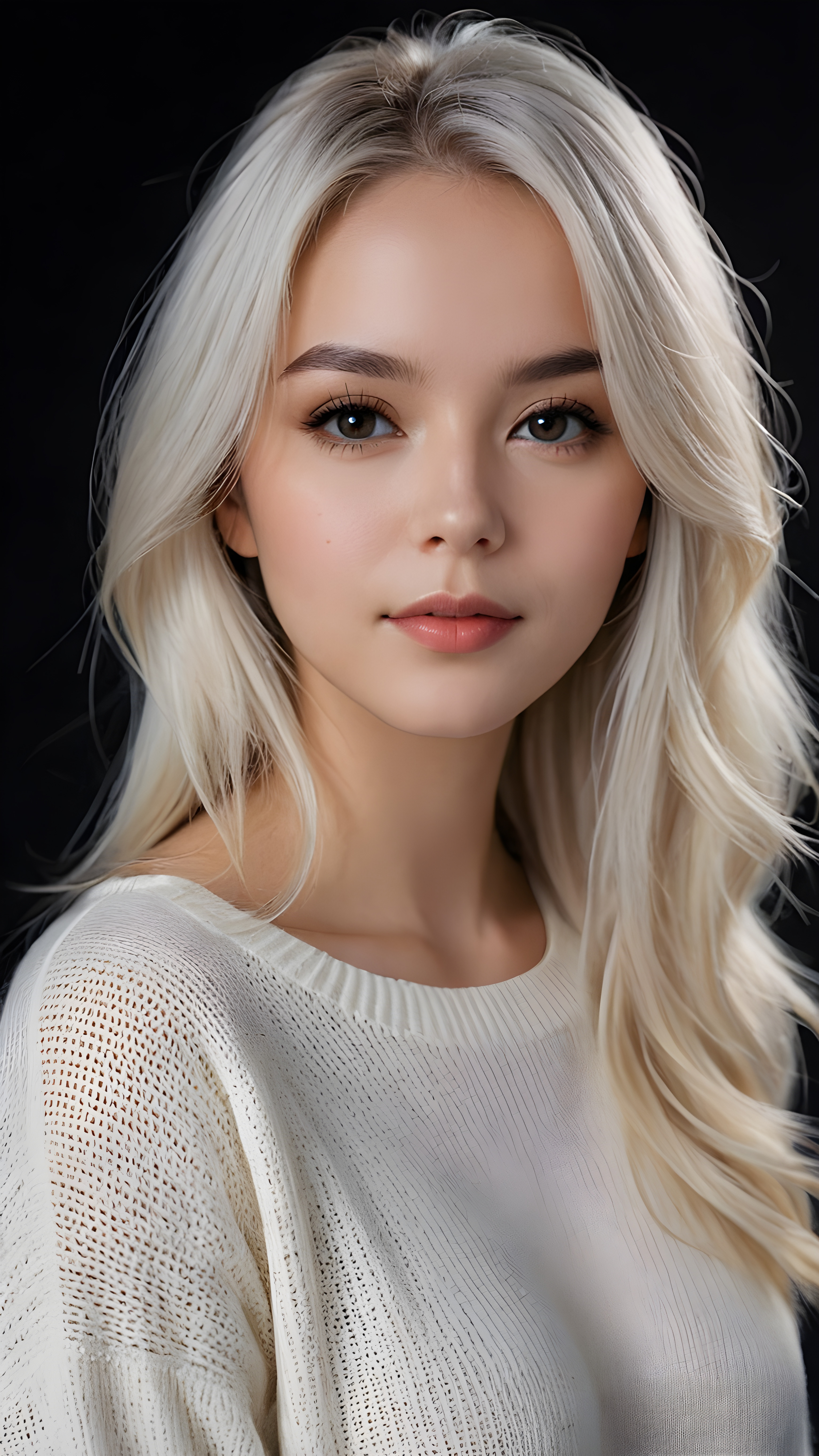 visualize a (((digital masterpiece))), she wears a thin, light white sweater that supports her perfect body, long straight soft platinum hair, full lips, seductive look ((black background)) ((dimmed light)), perfect shadows
