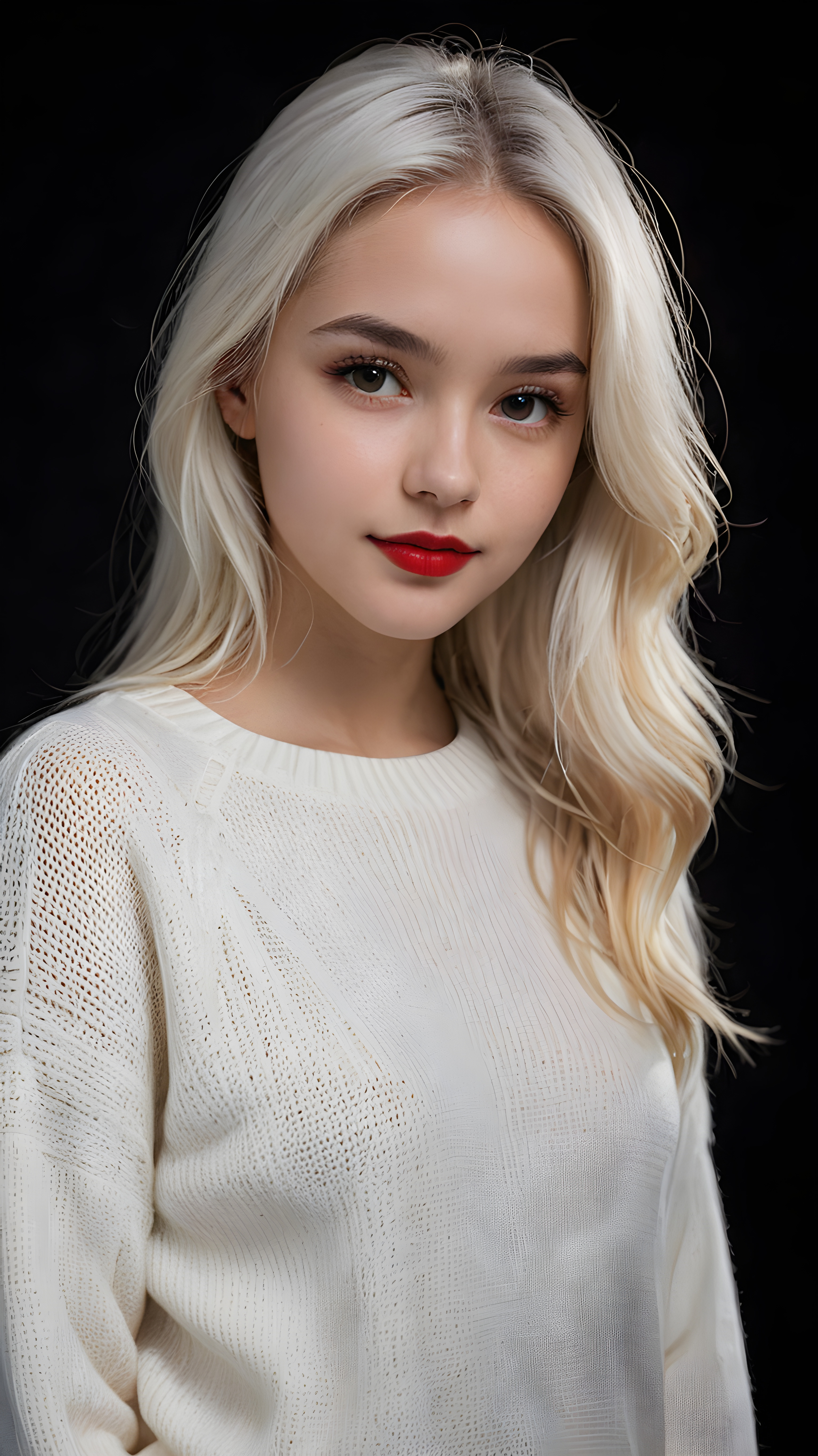 visualize a (((digital masterpiece))), ((a teen girl wears a thin light white sweater)) that supports her perfect body, long straight soft white hair, full red lips, seductive look ((black background)) ((dimmed light)), perfect shadows