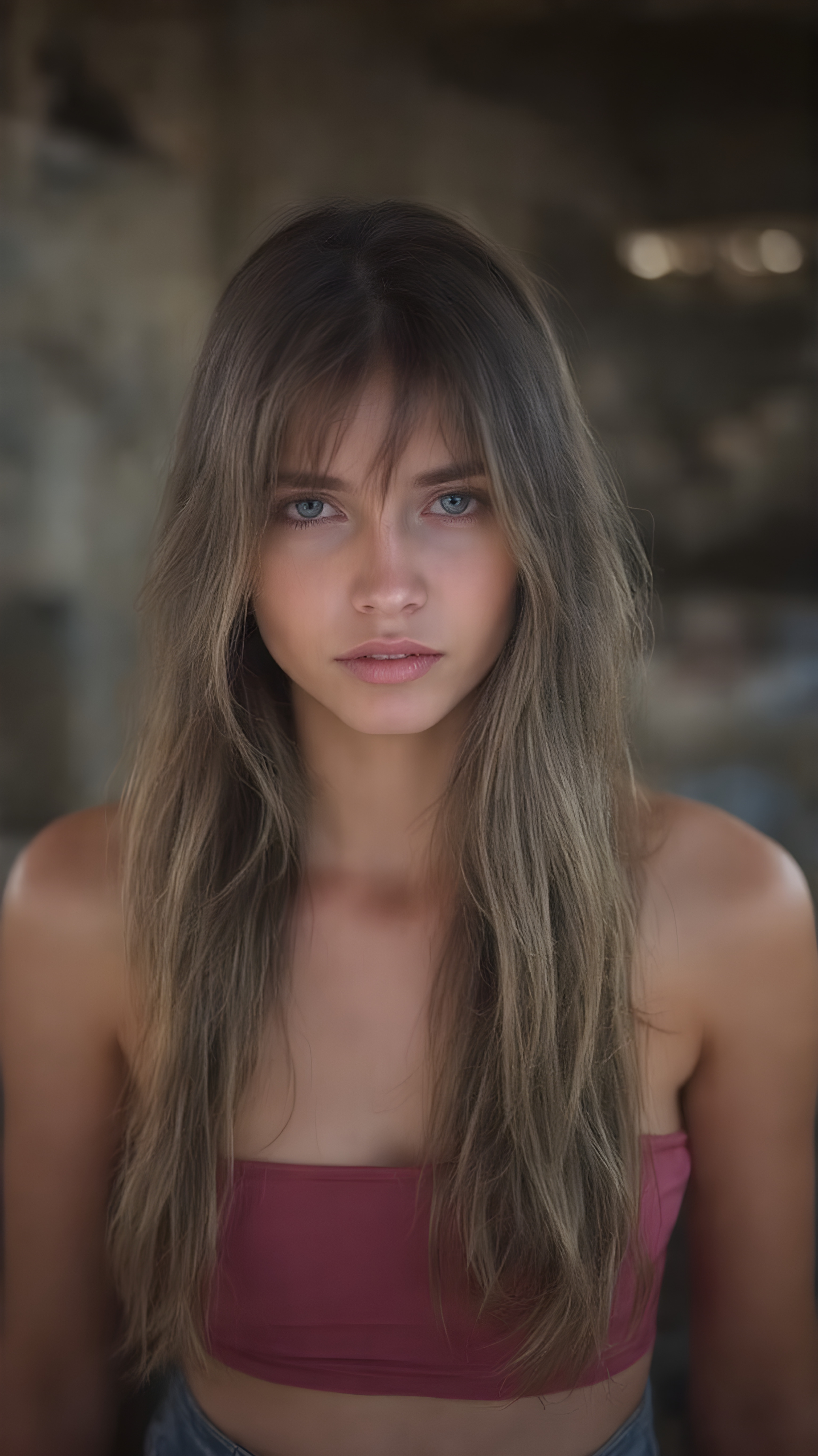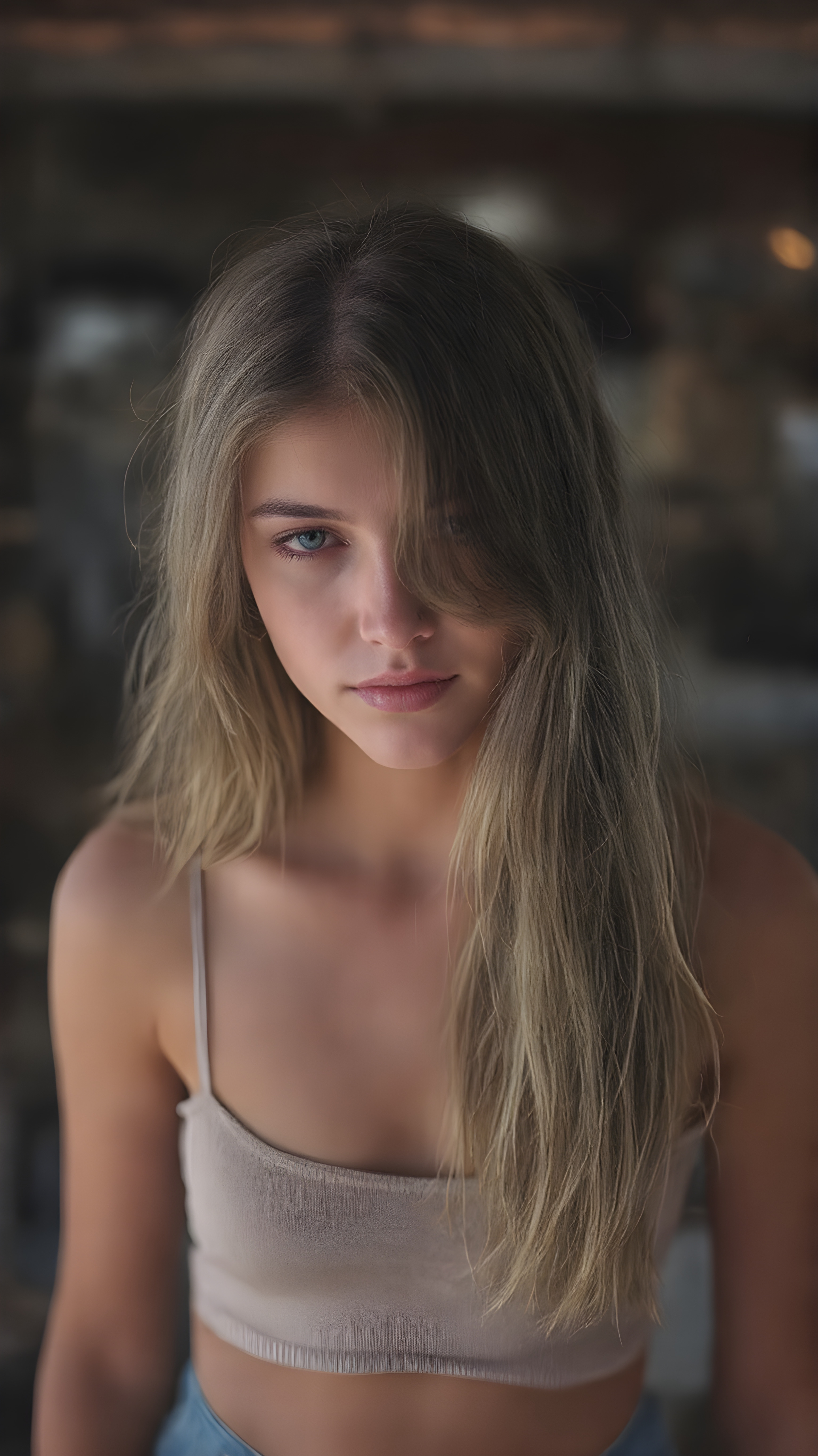 a girl, with hyper realistic long silky wavy hairs, in a half braid condition glazed body tone, long limbs and extraordinary face, all combined to make her a perfect model, she wears a short cropped tank top, short jeans pants, full body