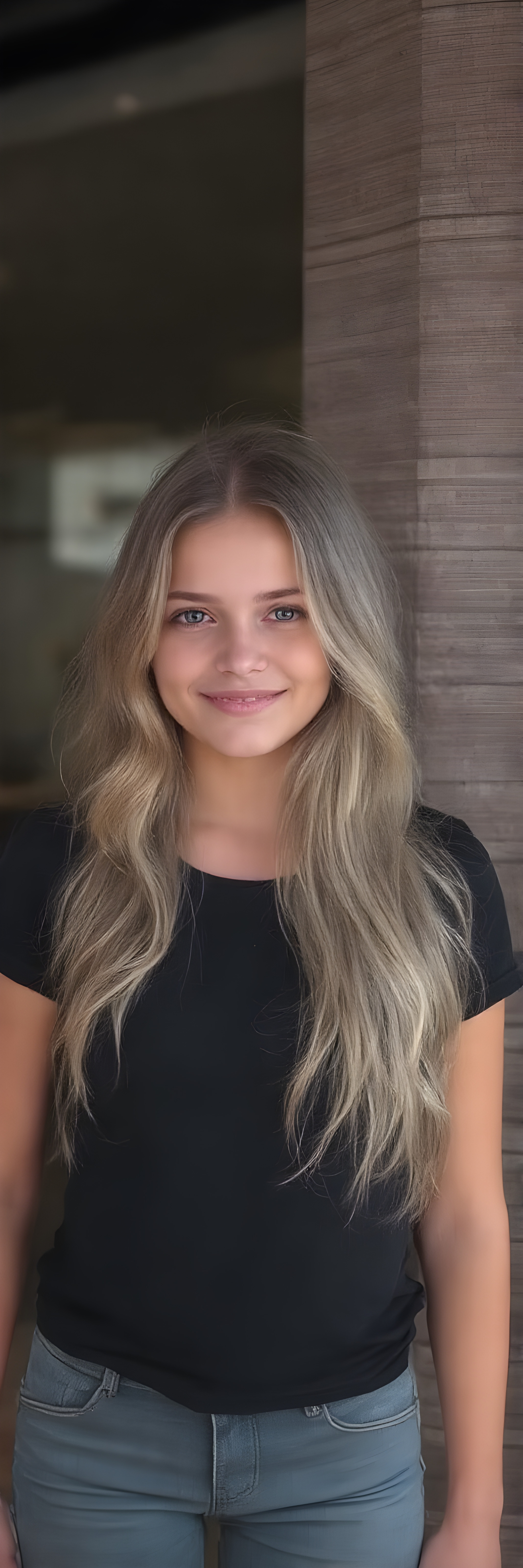 a (((teen girl))) with (((extremely long, silky wavy light blonde hair))), wearing a sleek and tight ‚Black T-Shirt with World Fashion Design‘ that seamlessly complements her stylishly faded jeans. Her face exudes a (((soft yet inviting smile))), perfectly accentuating her ((perfectly proportioned figure)), which includes a slim waist and (extraordinary long, flowing eyelashes) that add to her (alluring charm). The backdrop is a (clearly detailed and highly realistic) setting that perfectly captures the essence of modern luxury and fashion, with (interwoven textures) and (distinctive patterns) that give off a (vivid color contrast) against her (natural skin tone) makeup and (crisp pearly white teeth) as the ultimate finishing touch, full body