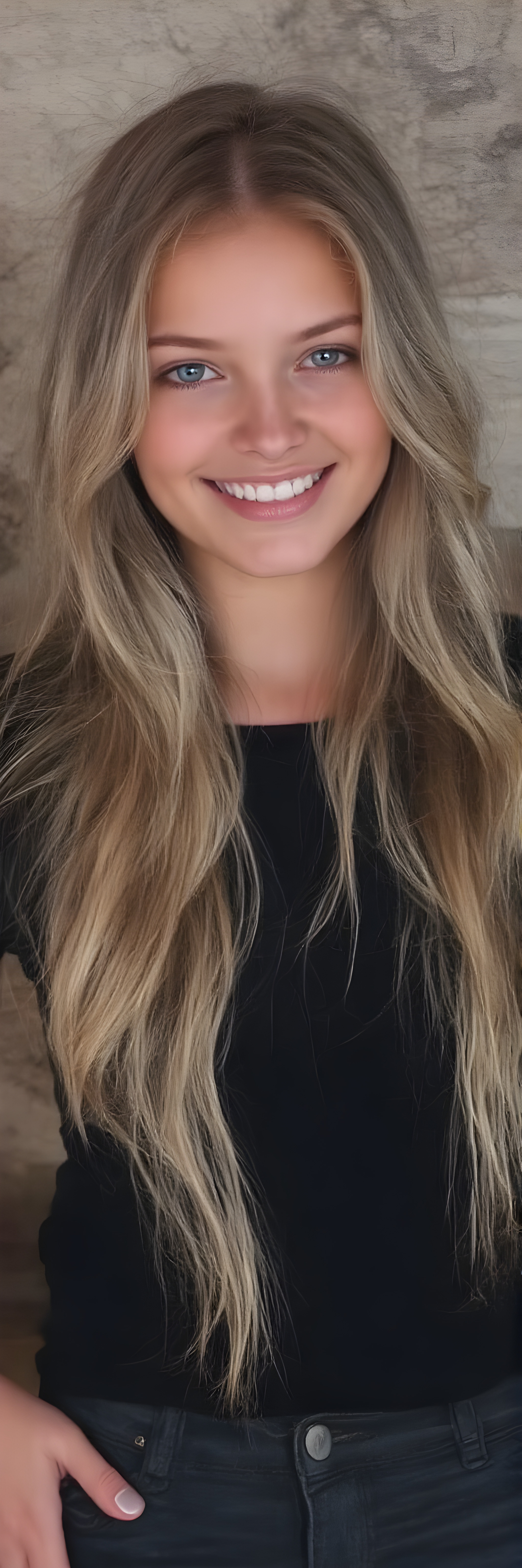 a (((teen girl))) with (((extremely long, silky wavy light blonde hair))), wearing a sleek and tight black T-Shirt that seamlessly complements her stylishly faded jeans. Her face exudes a (((soft yet inviting smile))), perfectly accentuating her ((perfectly proportioned figure)), which includes a slim waist and (extraordinary long, flowing eyelashes) that add to her (alluring charm), black backdrop that give off a (vivid color contrast) against her (natural skin tone) makeup and (crisp pearly white teeth) as the ultimate finishing touch, full body
