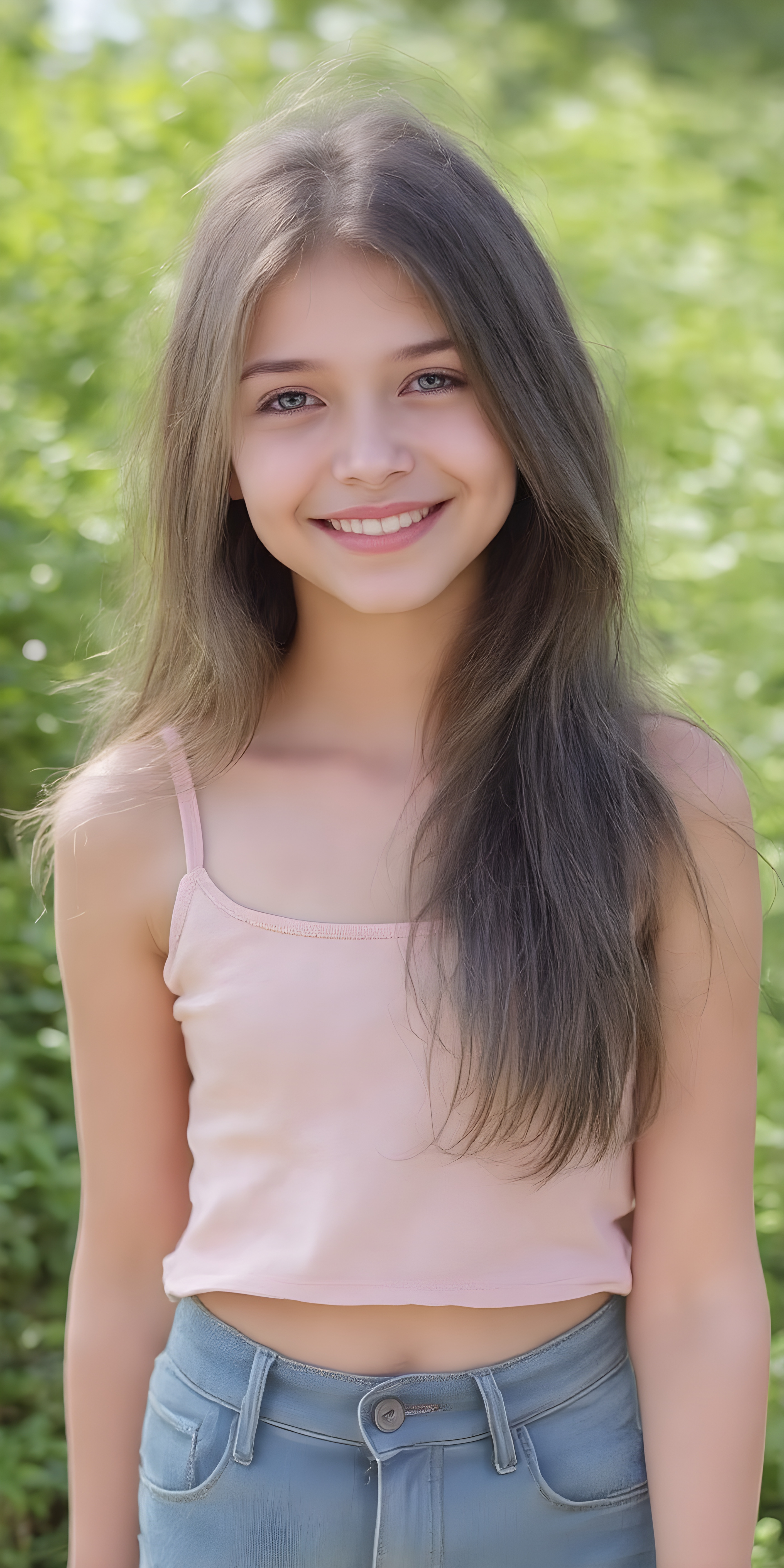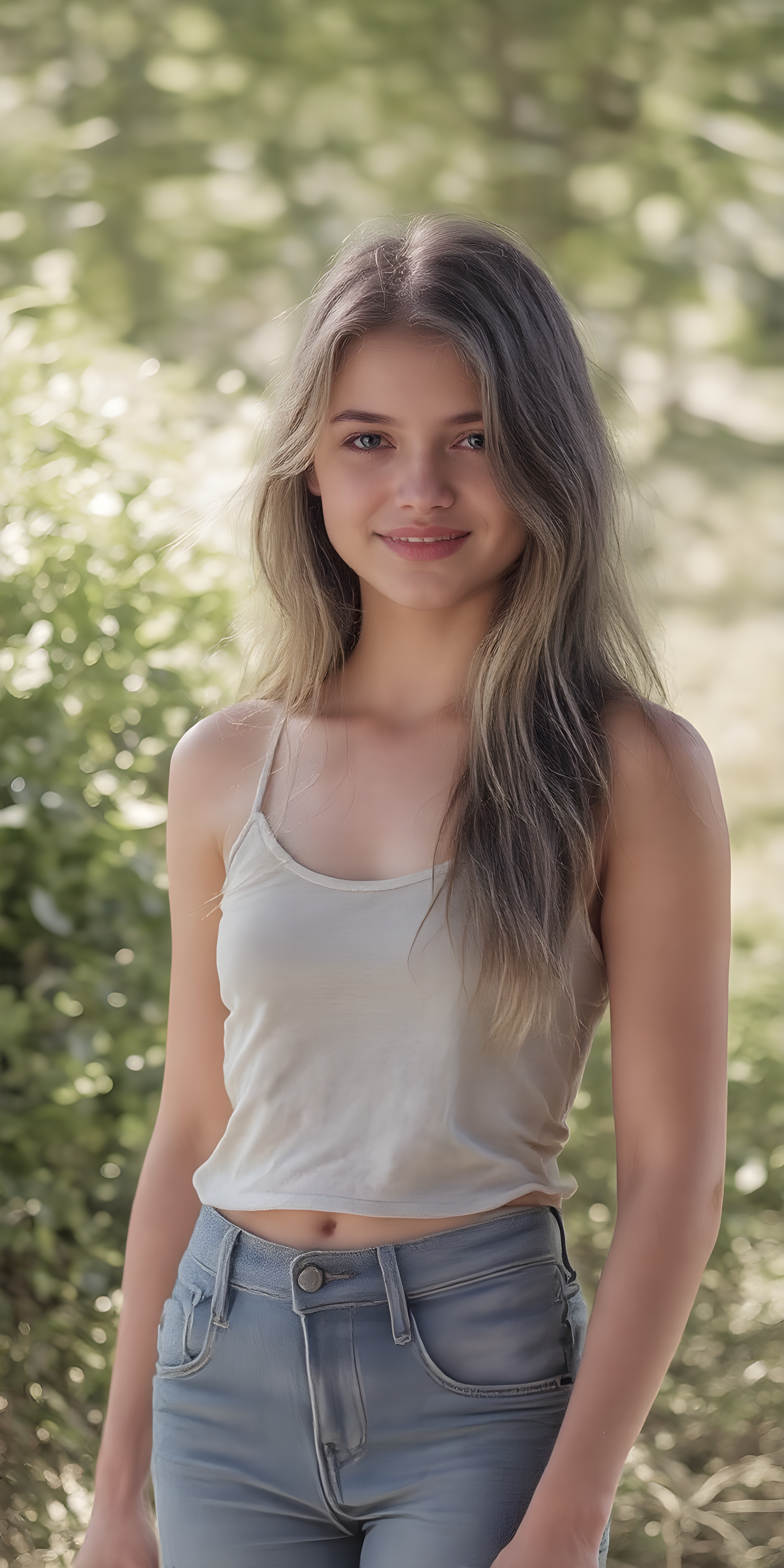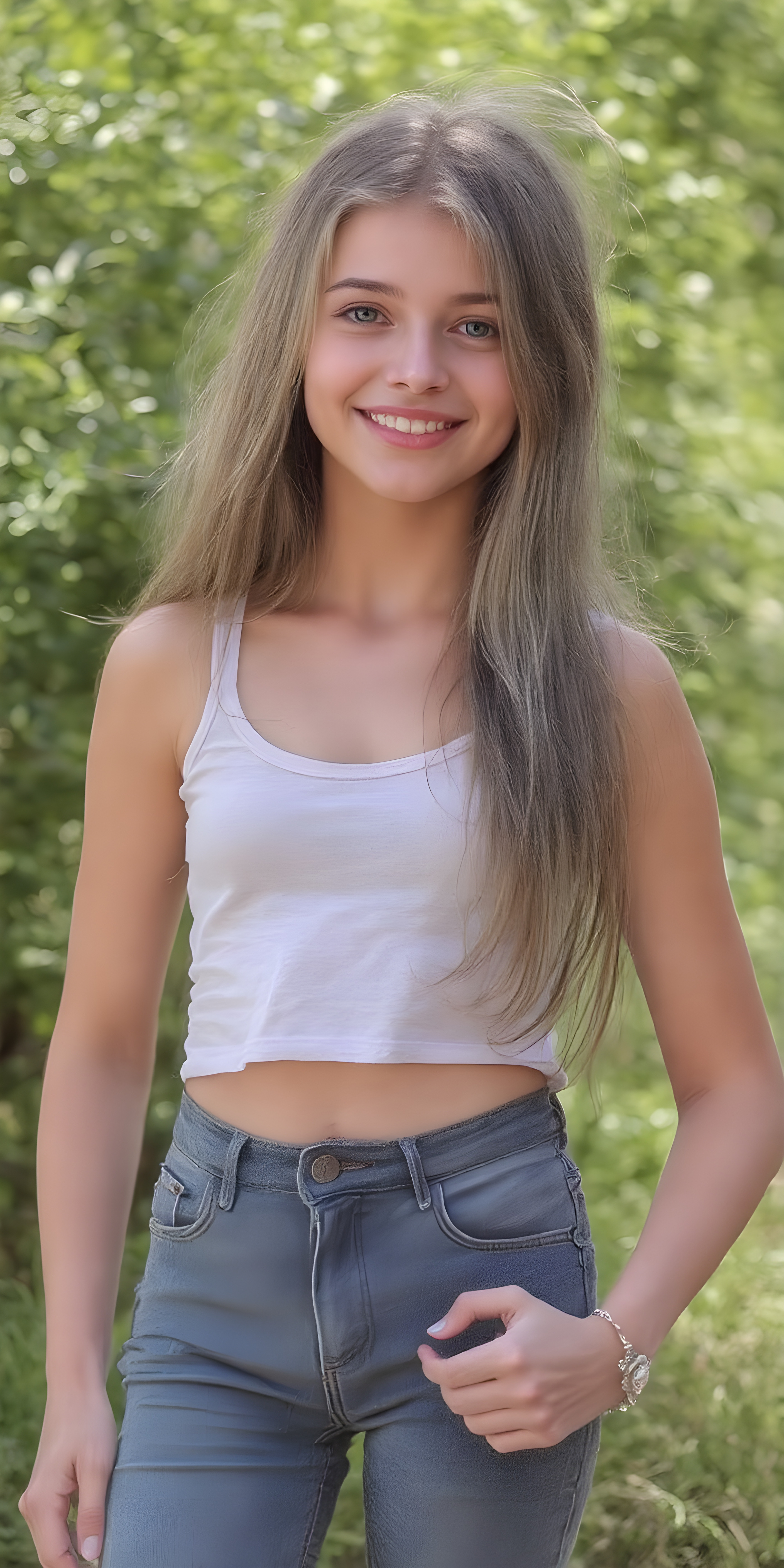 a young stunning gorgeous girl, short tank top, jeans pants, smile, long soft hair, natural green sunny backdrop