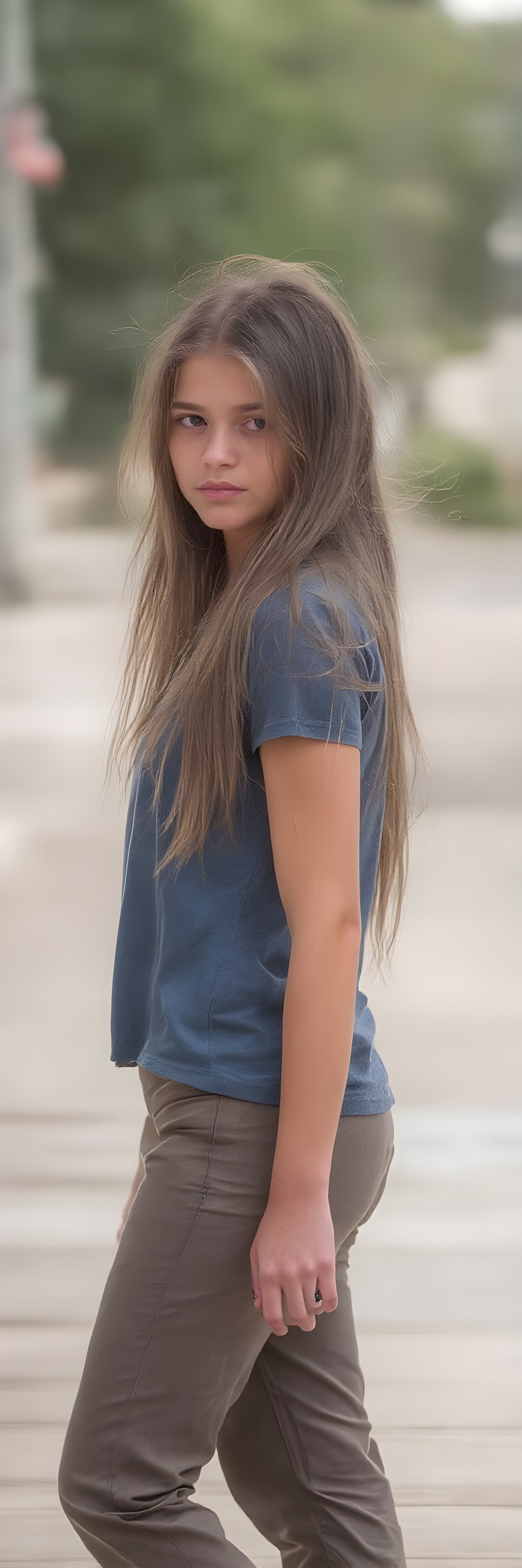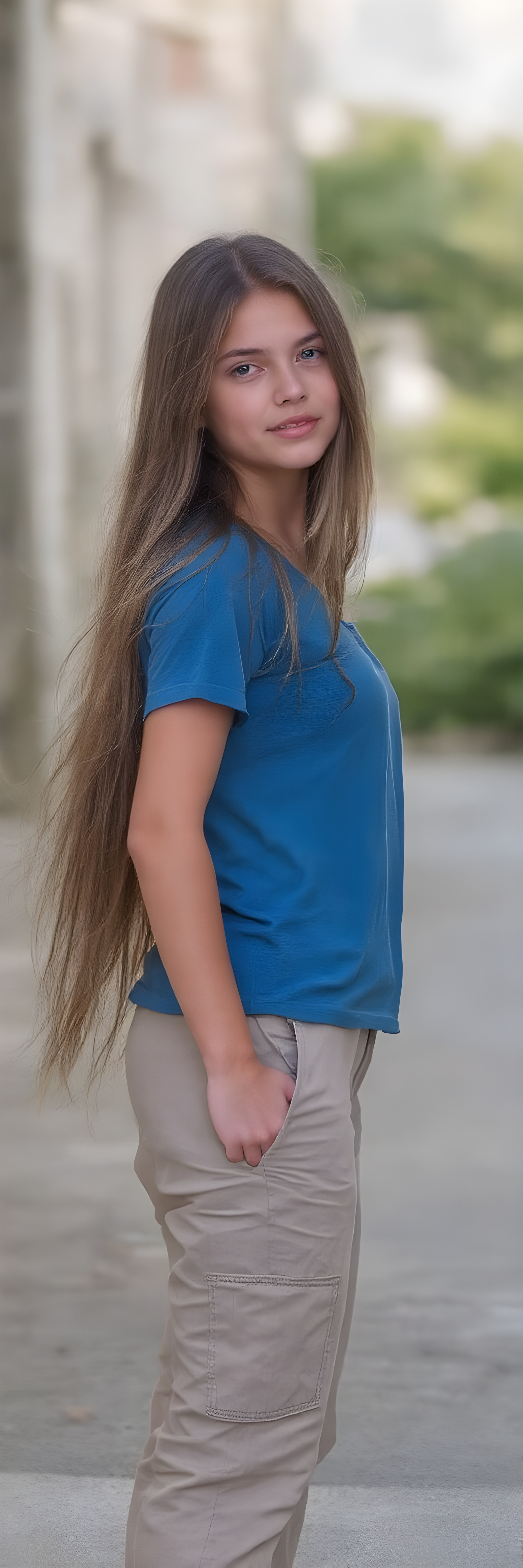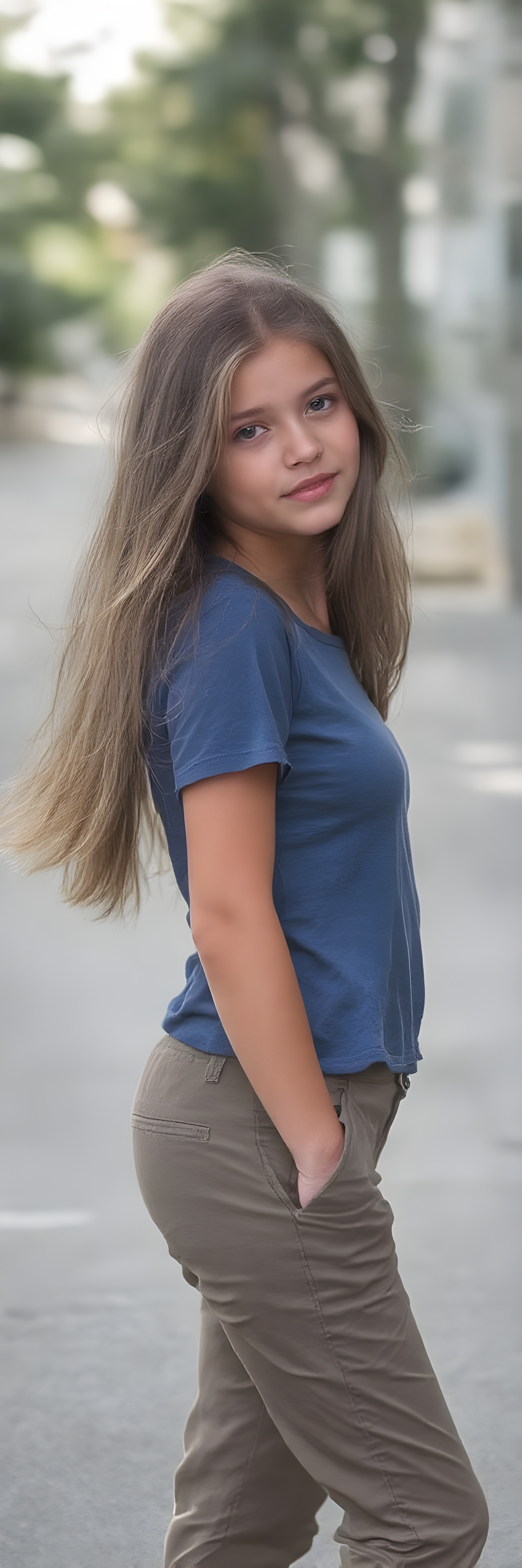 a (((beautiful young girl, perfect body, 15 years old))), with flowing, (((soft long straight brown hair))). (She is dressed in a sleek, ((blue short t-shirt)), long cargo pants), exuding just the right amount of youthful charm, photograph, full body side view, stands in the street