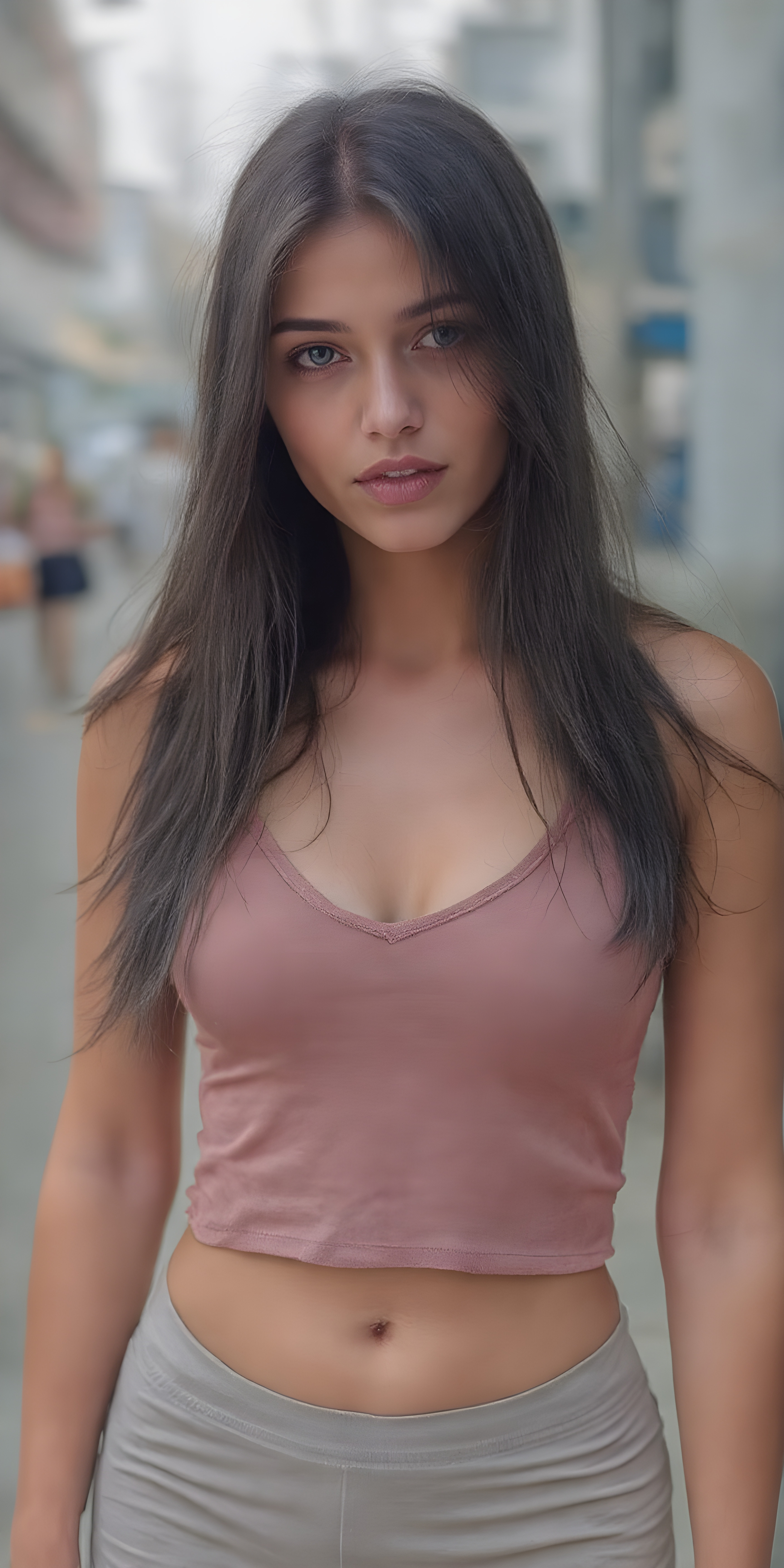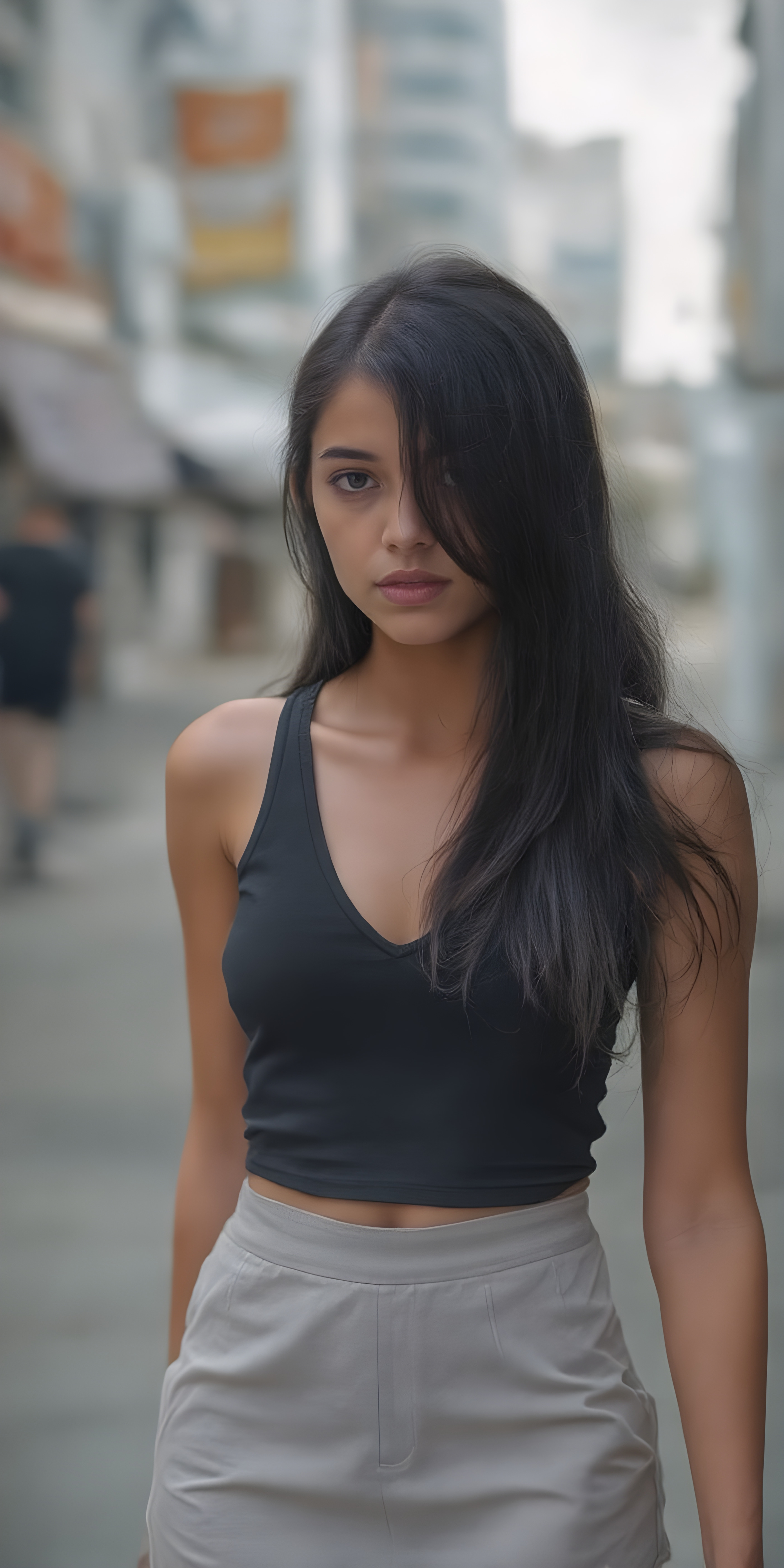 a (((beautiful young teenage girl, perfect curved body))), with flowing, (((soft long straight black hair))). She is dressed in a sleek, (tank top, deep v-neck and a short round mini skirt), photograph, stands in the street