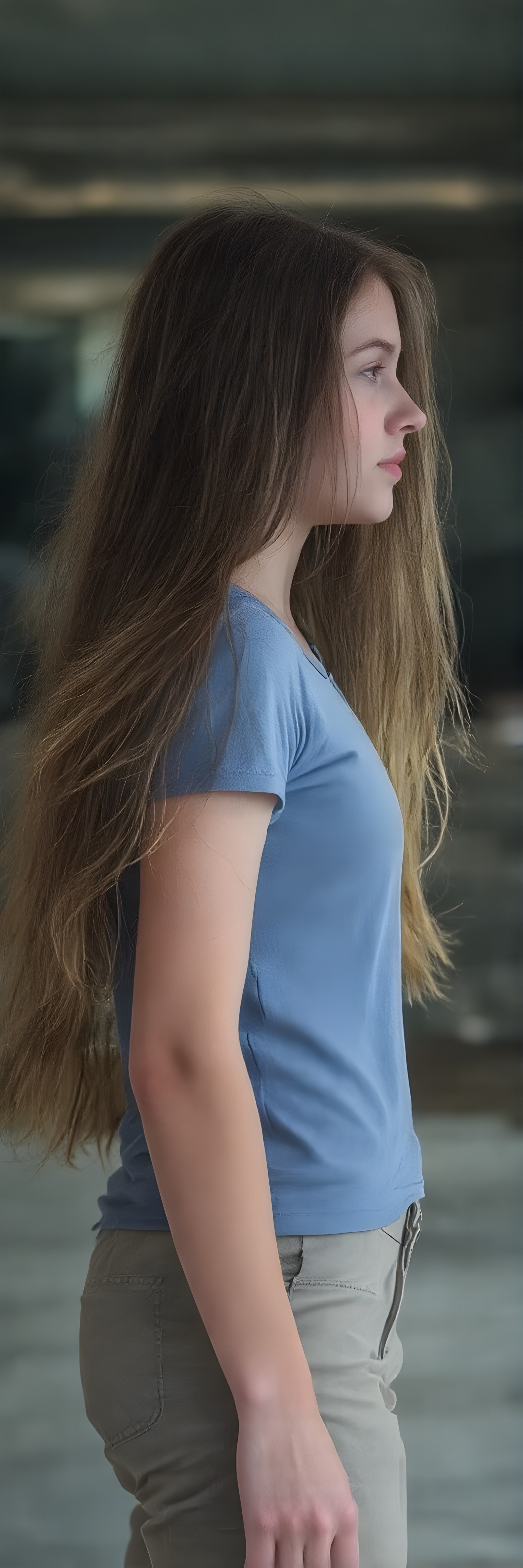 a (((beautiful young girl, perfect body, 15 years old))), with flowing, (((soft long straight brown hair))). (She is dressed in a sleek, ((blue short t-shirt)), long cargo pants), exuding just the right amount of youthful charm, photograph, full body side view
