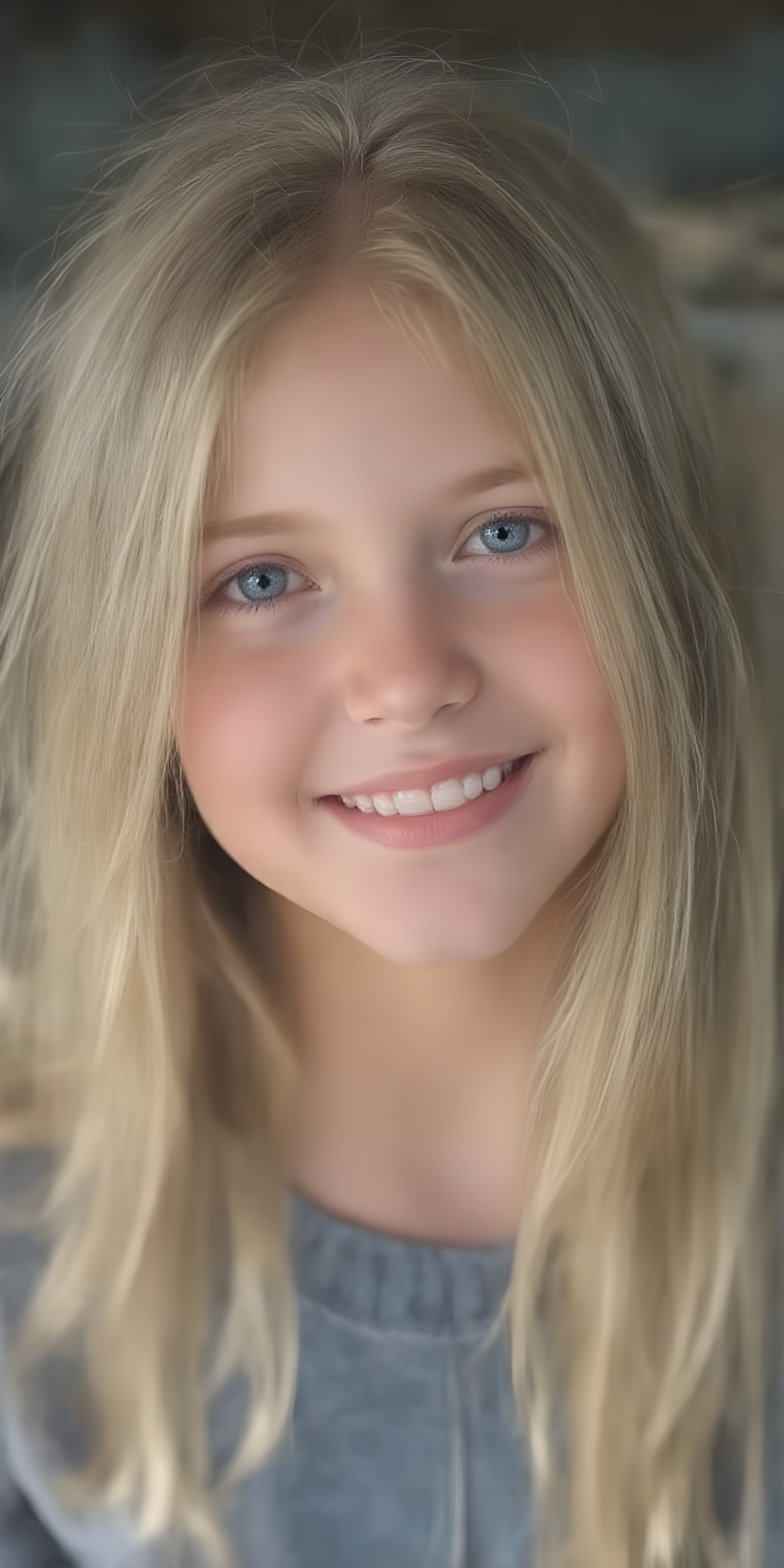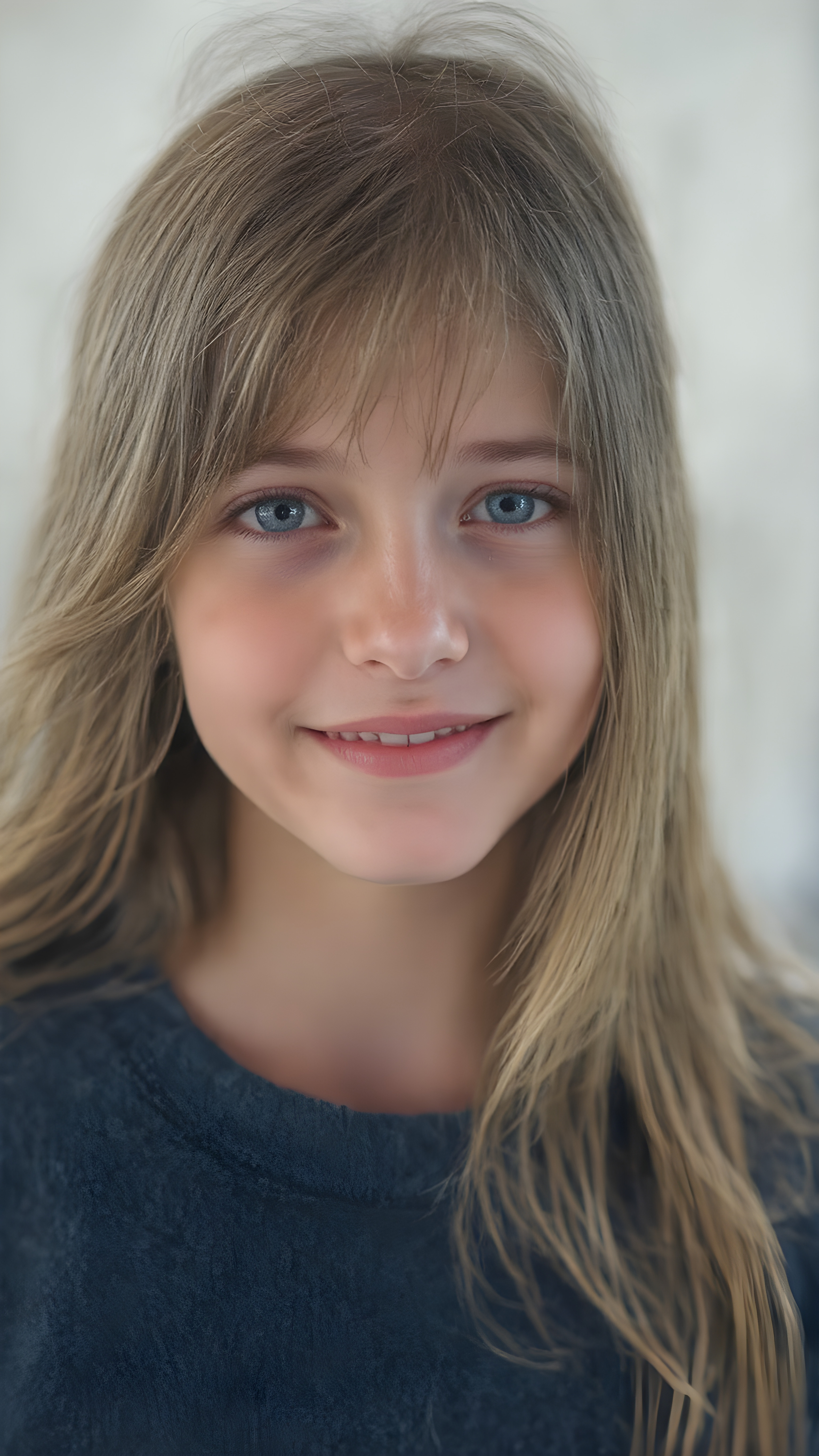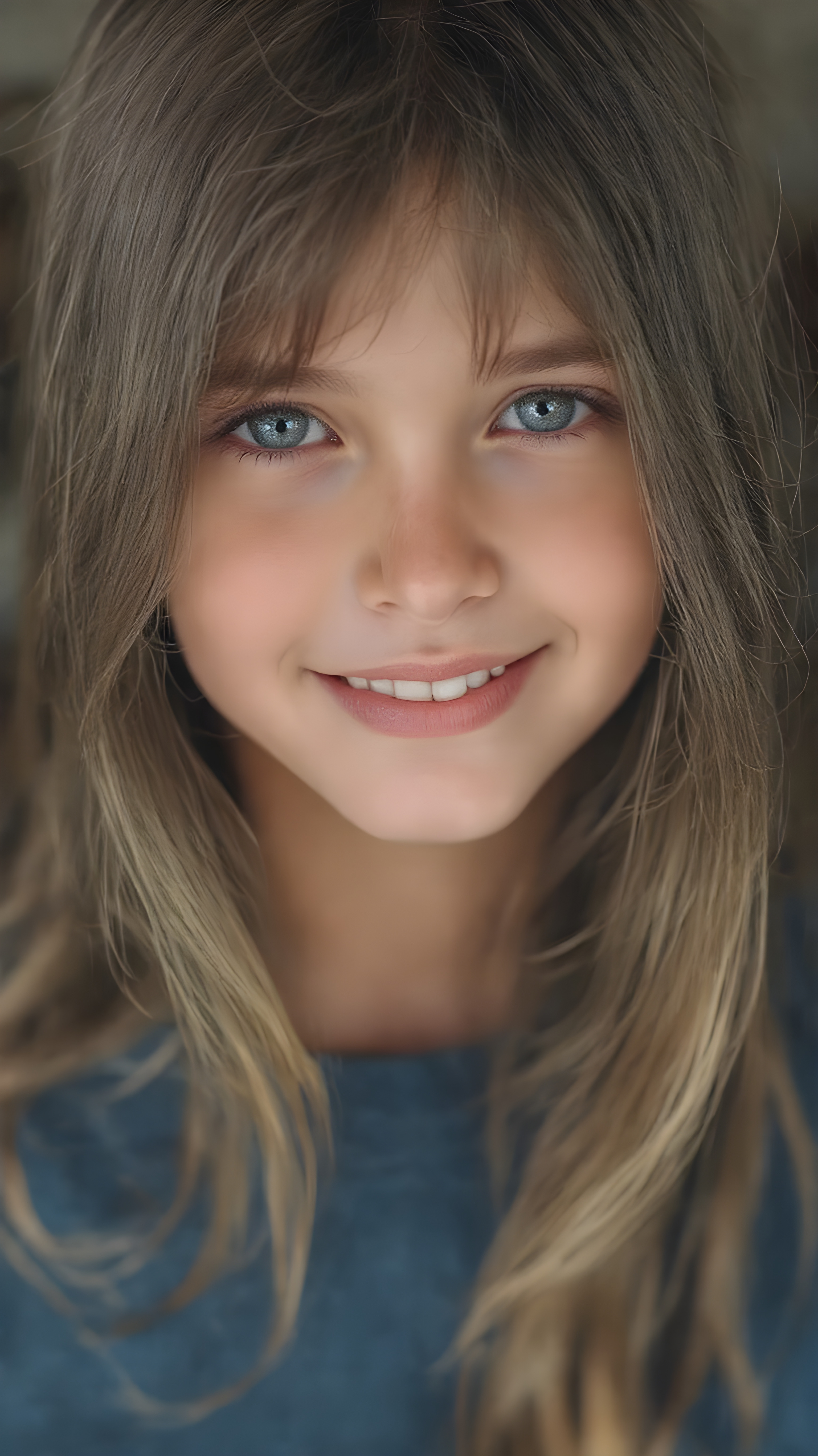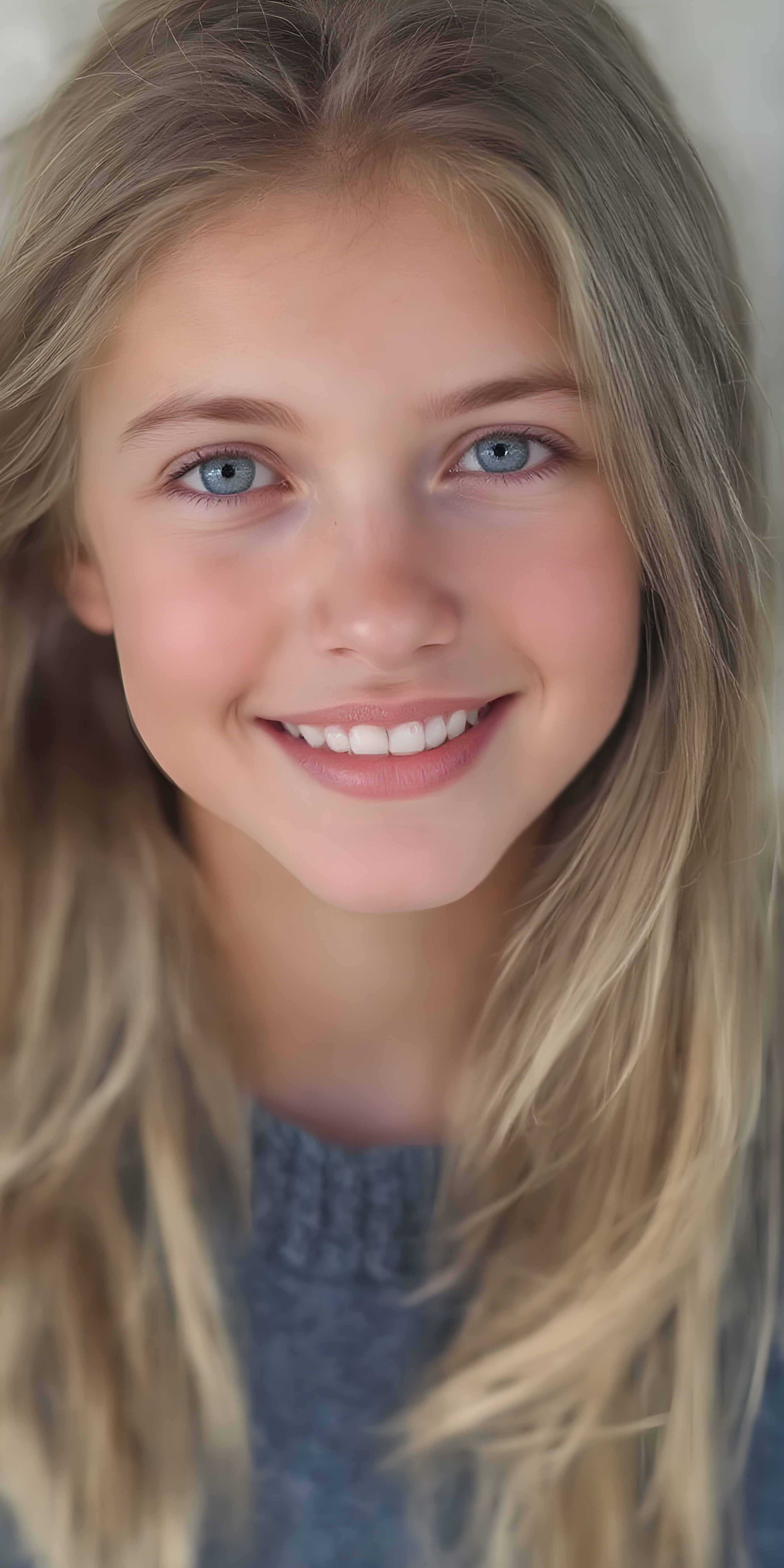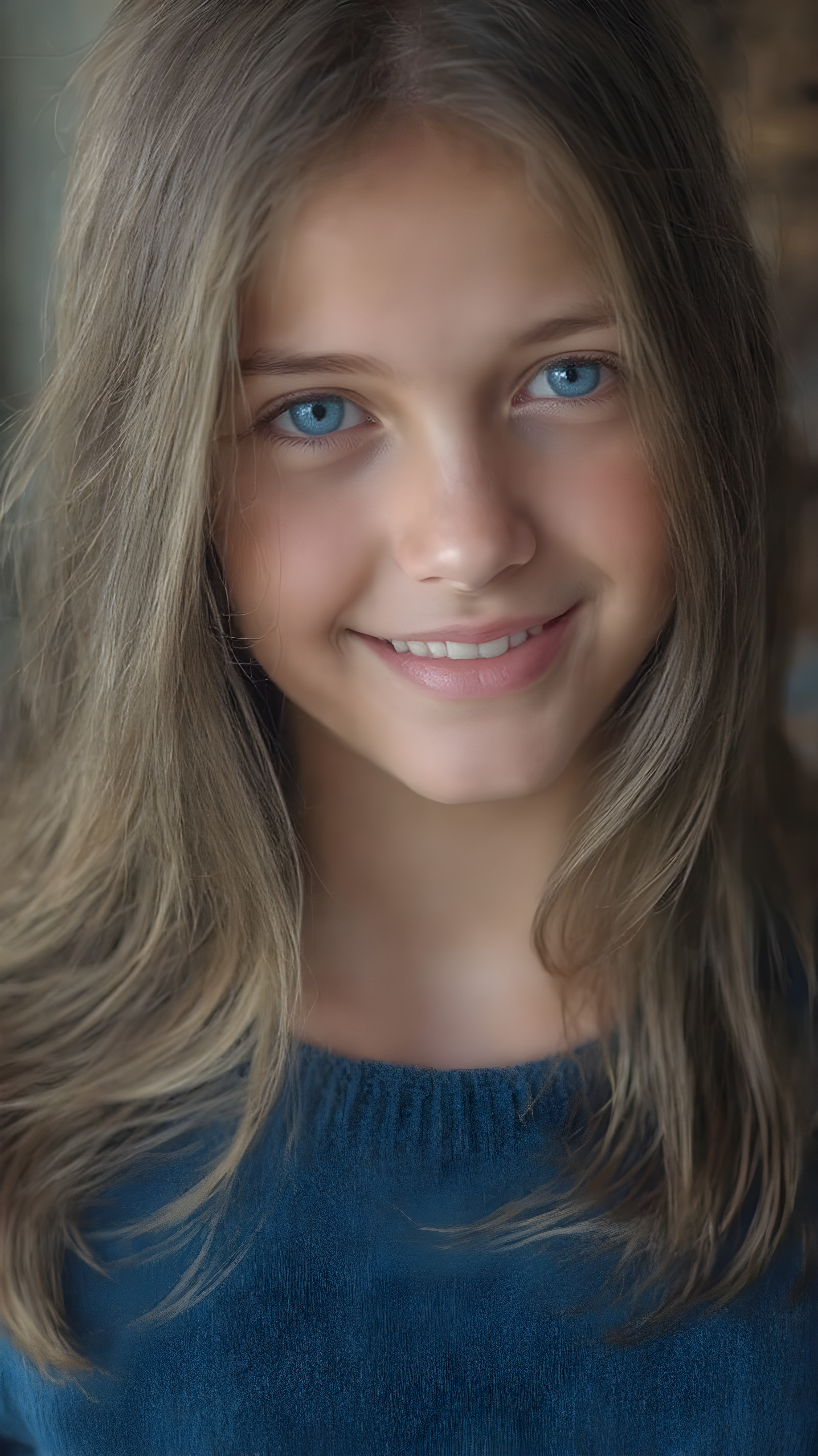 upper body portrait from a (((beautiful young girl, radiates a happiness, warm smile with white teeth))), with flowing, (((soft long straight brown hair))), gentle and inviting (((dark blue eyes))), that convey a sense of innocence and wonder, paired with delicate, ((almond skin)), which gives off a faintly pink glow, accompanied by full, softly rosy lips, that emit a warm, friendly smile. She is dressed in a sleek, ((blue sweater made of fine wool)), looks directly at the viewer in a (full body shot), exuding just the right amount of youthful charm