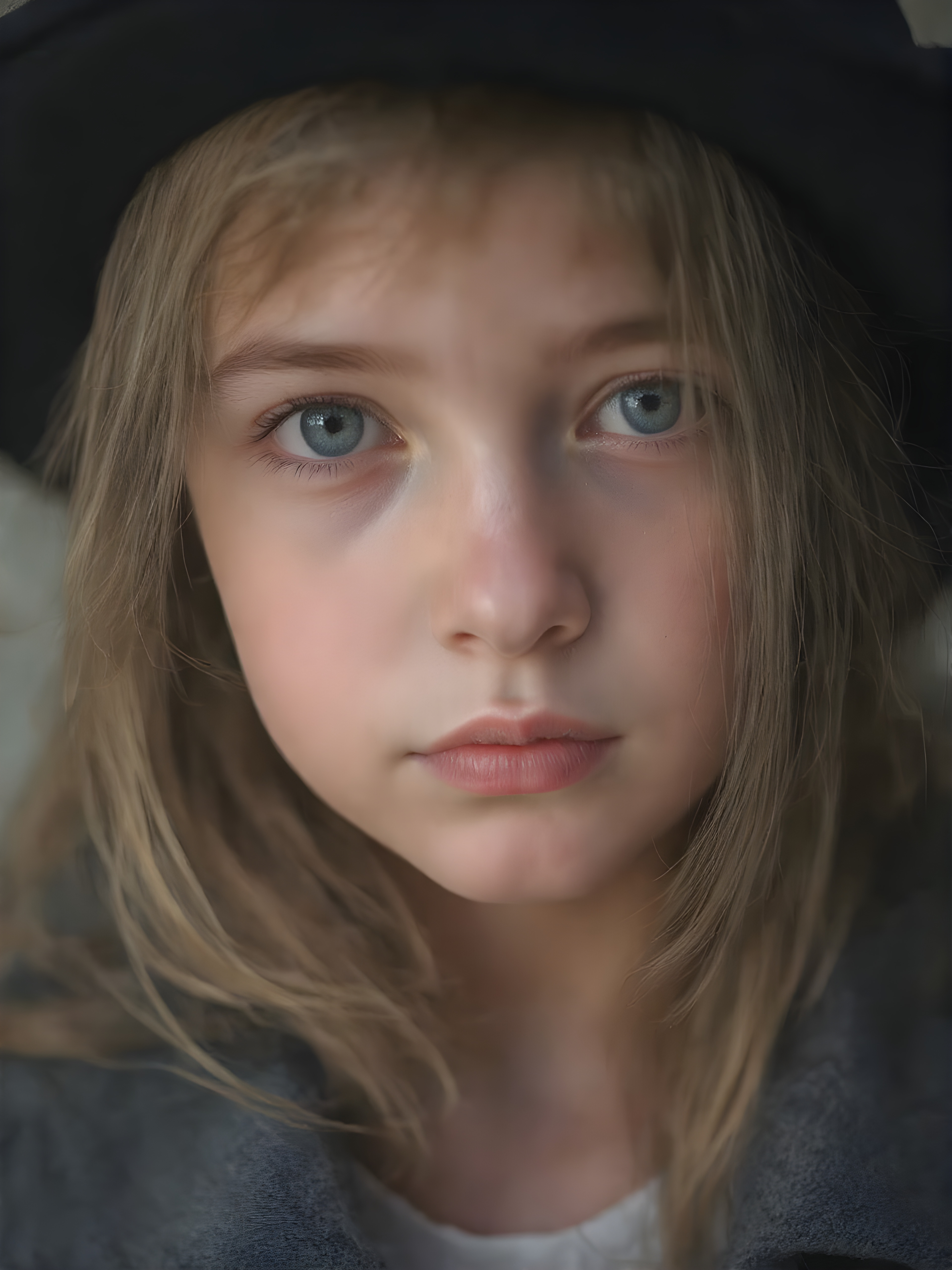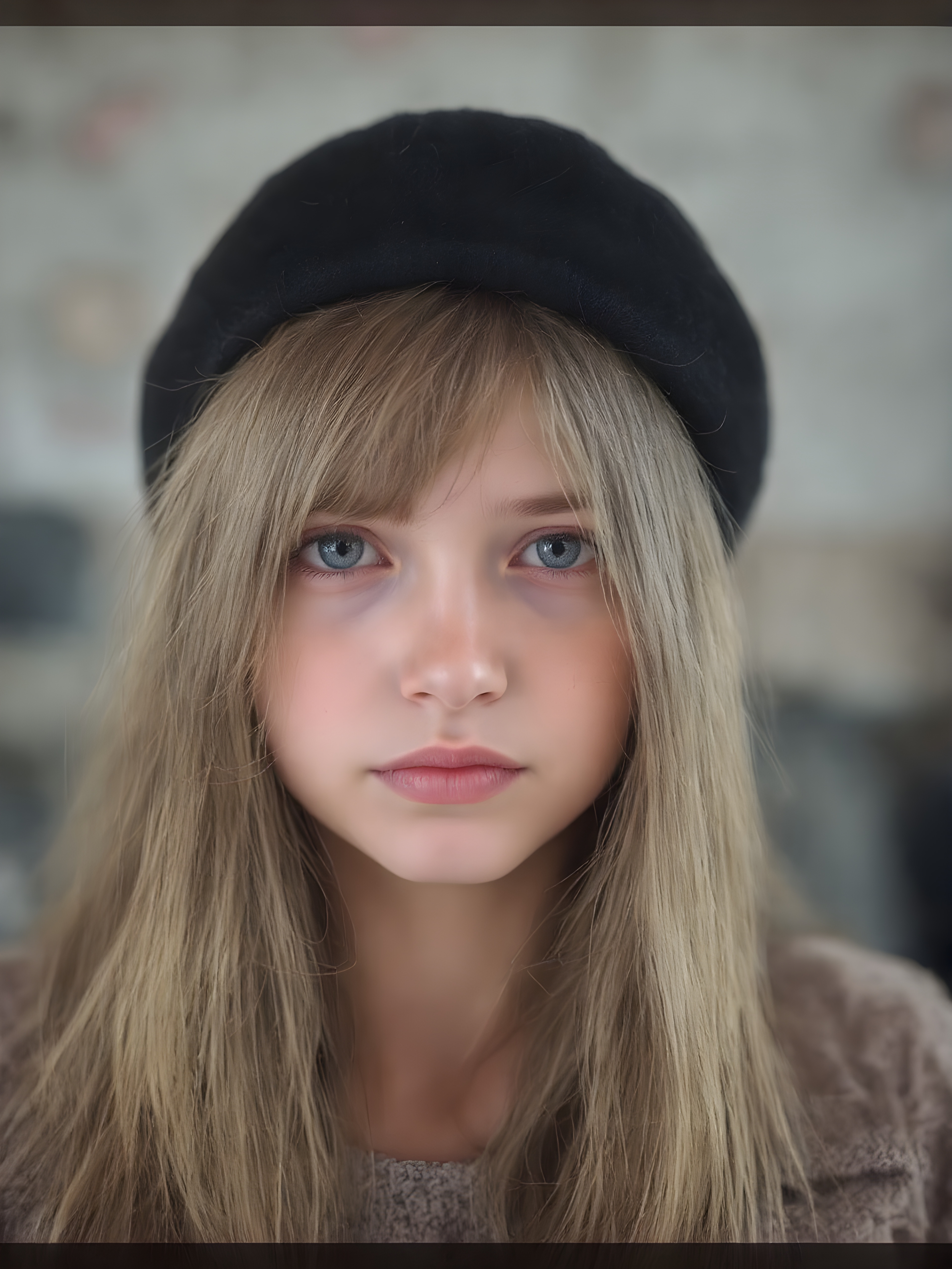a detailed perfect portrait with pastel colors, young girl, 13 years old, she wears a black round hat, a ((coat)), she look at the viewer, detailed shiny straight soft long hair, full lips, round detailed face ((cute)), ((gorgeous)), upper body view