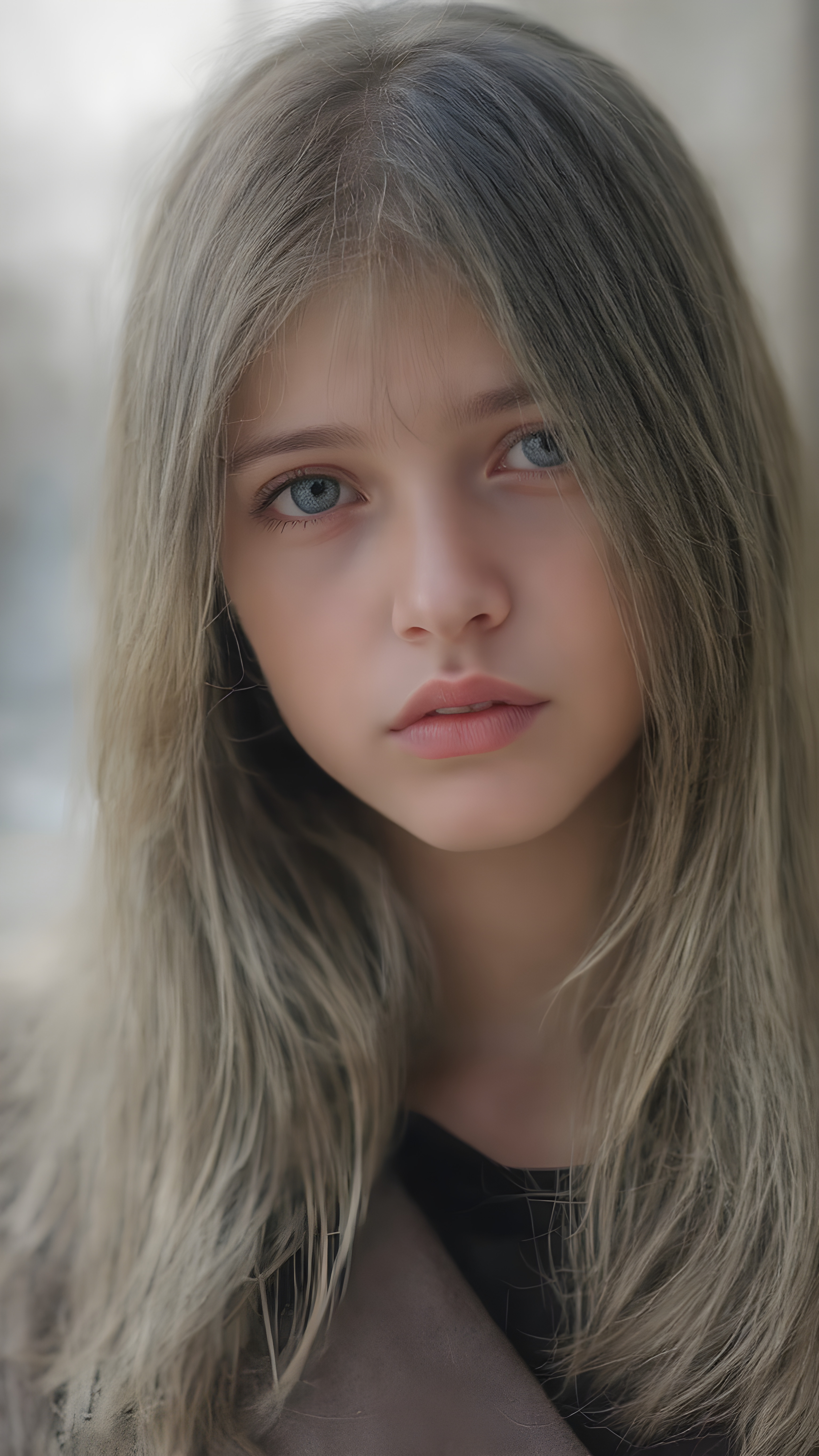 a detailed perfect portrait, young girl, 13 years old, she wears a ((coat)), she look at the viewer, detailed shiny ((straight soft long soft ash grey hair)), full lips, round detailed face ((cute)), ((gorgeous)), detailed amber eyes, cinematic