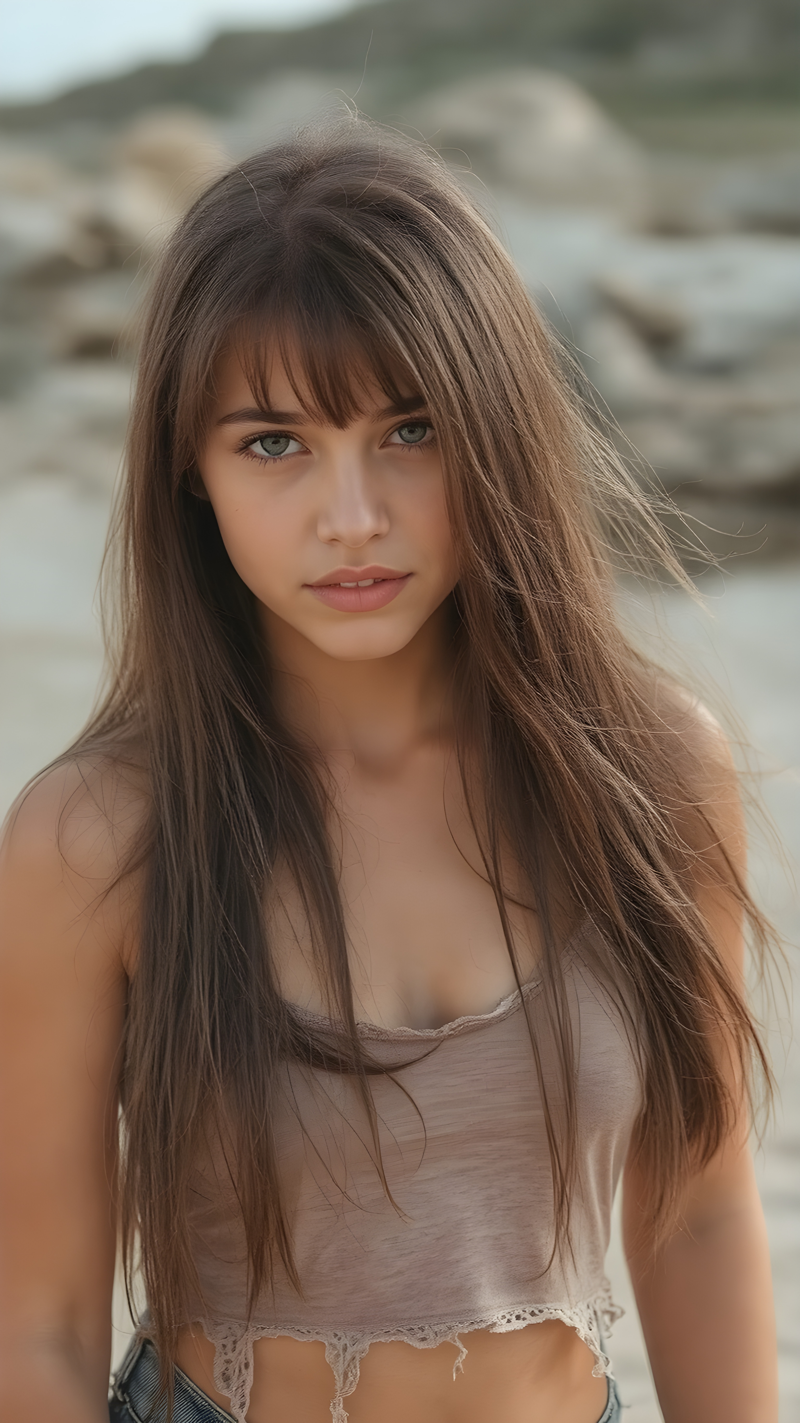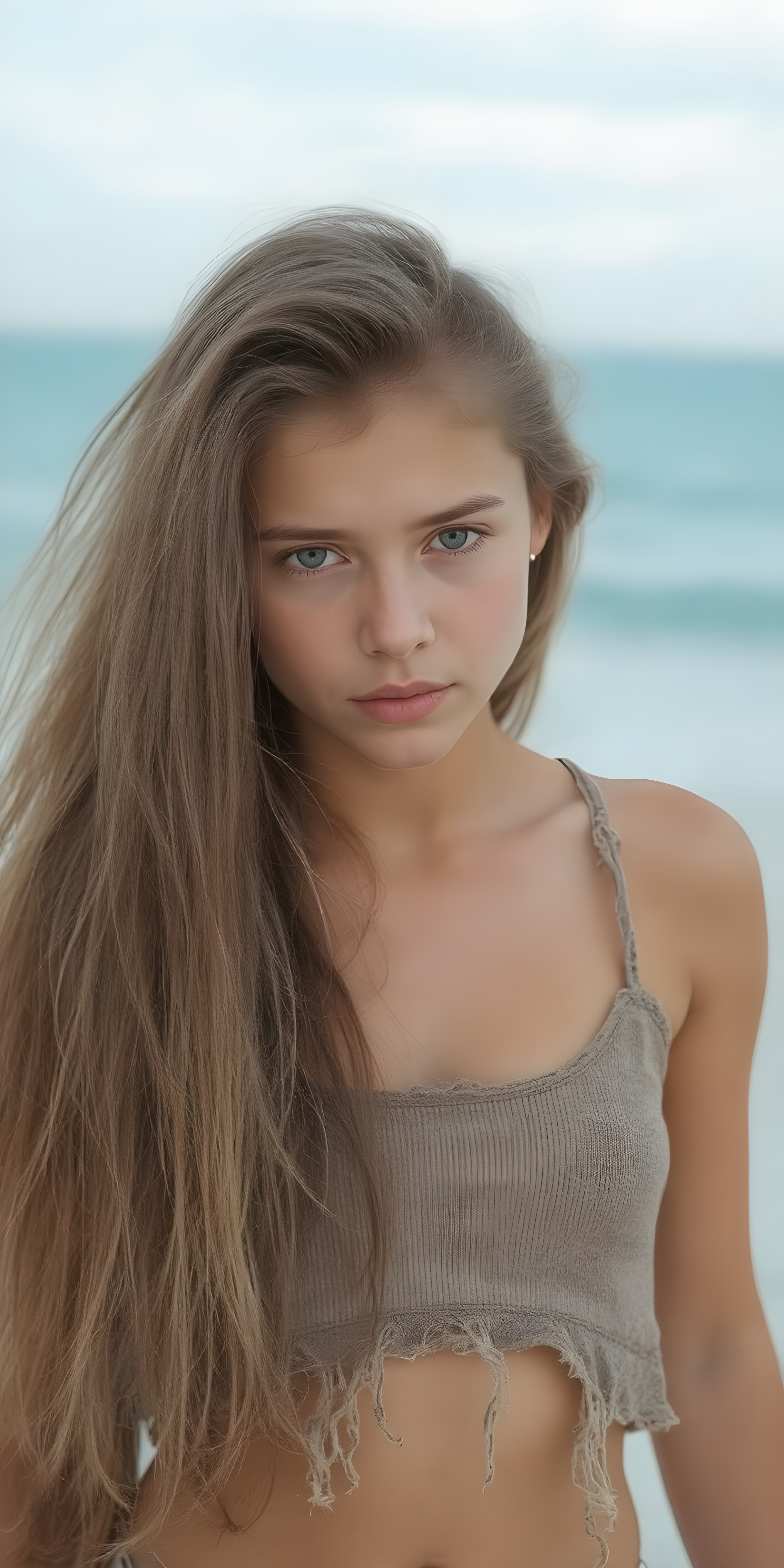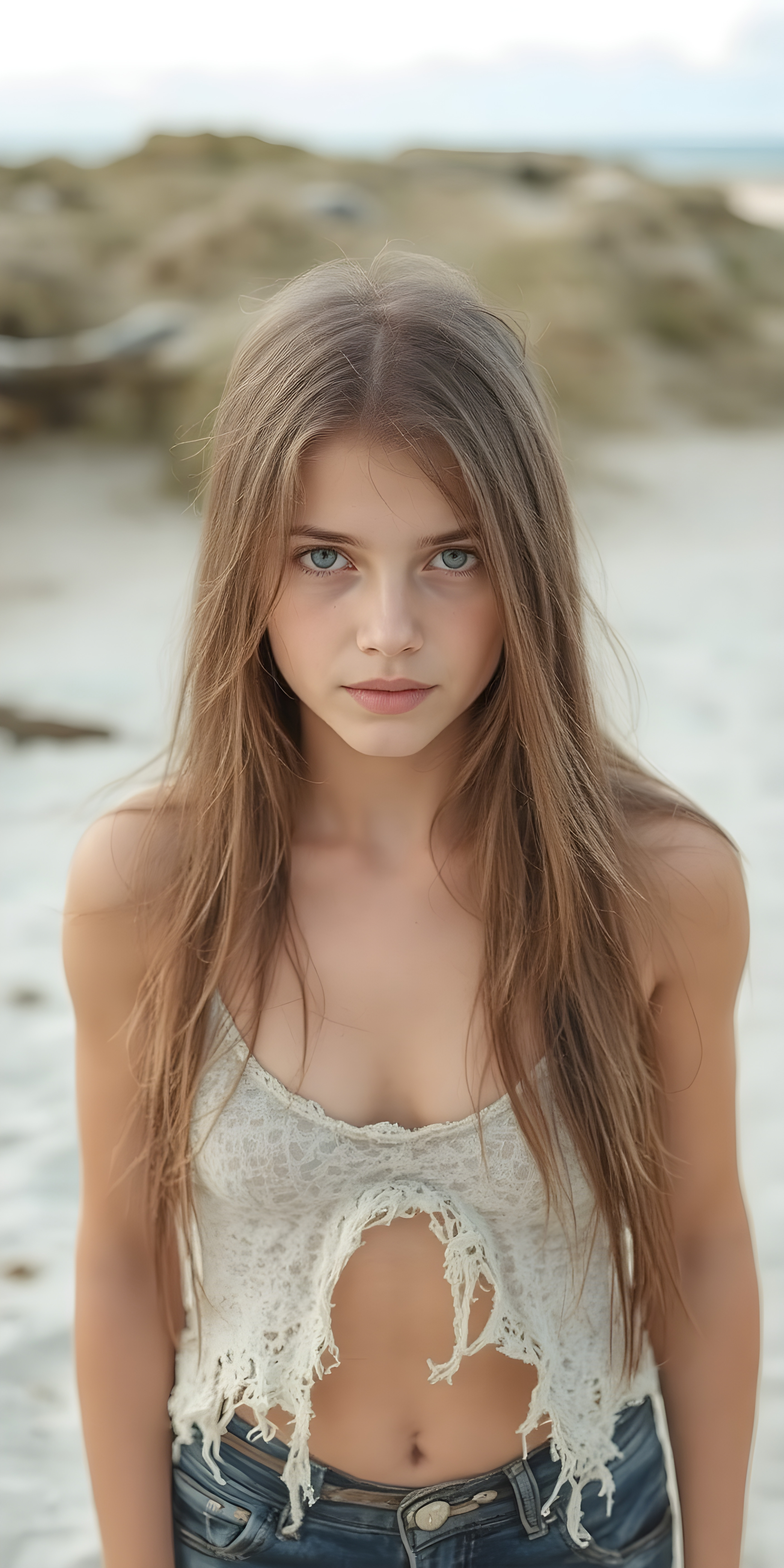 an Exotic teen girl, long straight hair, 14 years old, ((round face)), looks seductively, ((tattered crop tank top)), perfect body, (stunning) (gorgeous) (on a sandy beach) ((detailed))
