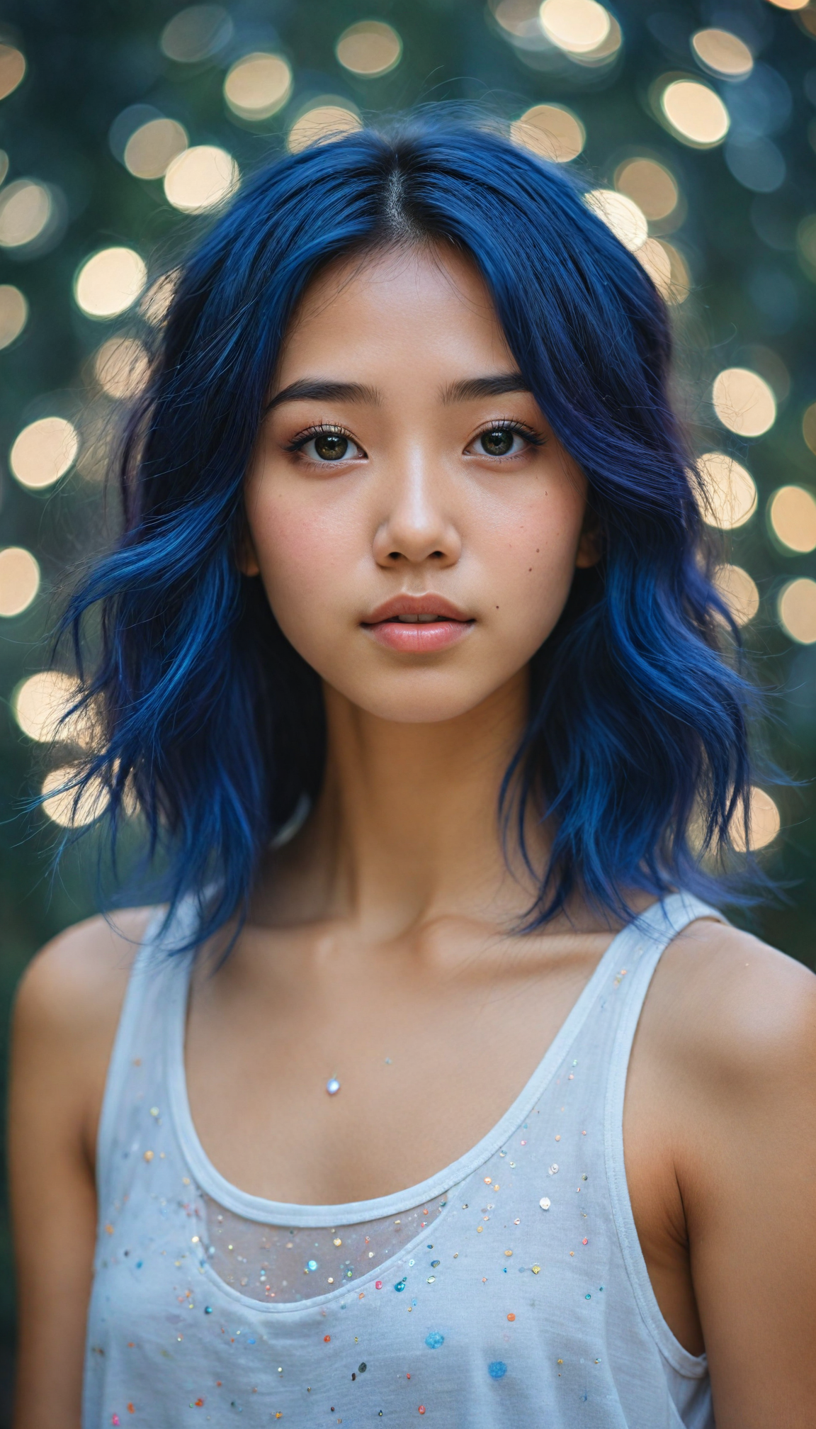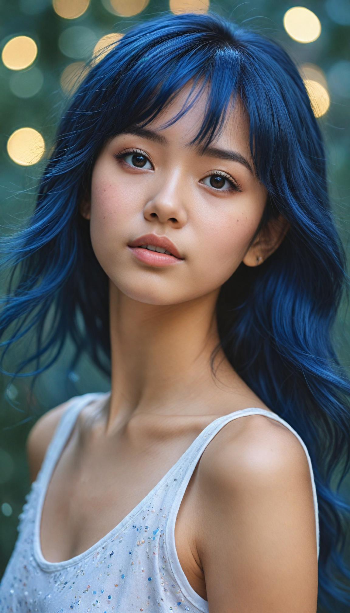 hyper-realistic, intricately detailed portrait of a captivating young Asian girl with flowing, iridescent dark blue hair that glimmers like the night sky. She gazes softly into the camera, her expression embodying a blend of innocence and curiosity. Adorned in a delicate, sheer white tank top that subtly catches the light, the background features a dreamy bokeh of soft pastel colors, creating an ethereal atmosphere. Incorporate elements of watercolor splashes and shimmering glitter for a magical touch, reminiscent of contemporary fantasy art styles.