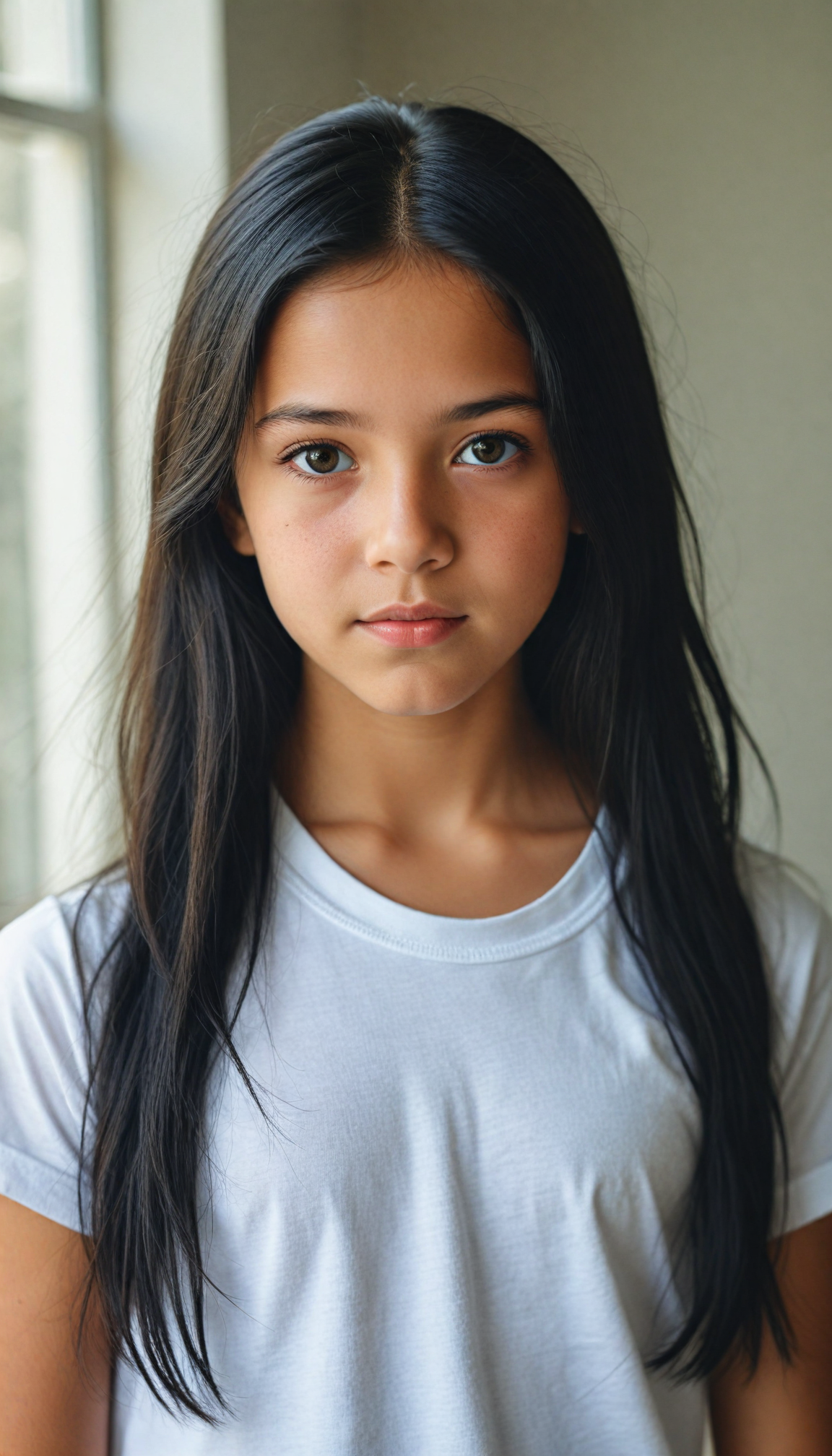 super realistic, detailed portrait, a beautiful young girl with long obsidian hair looks sweetly into the camera. She wears a white t-shirt.