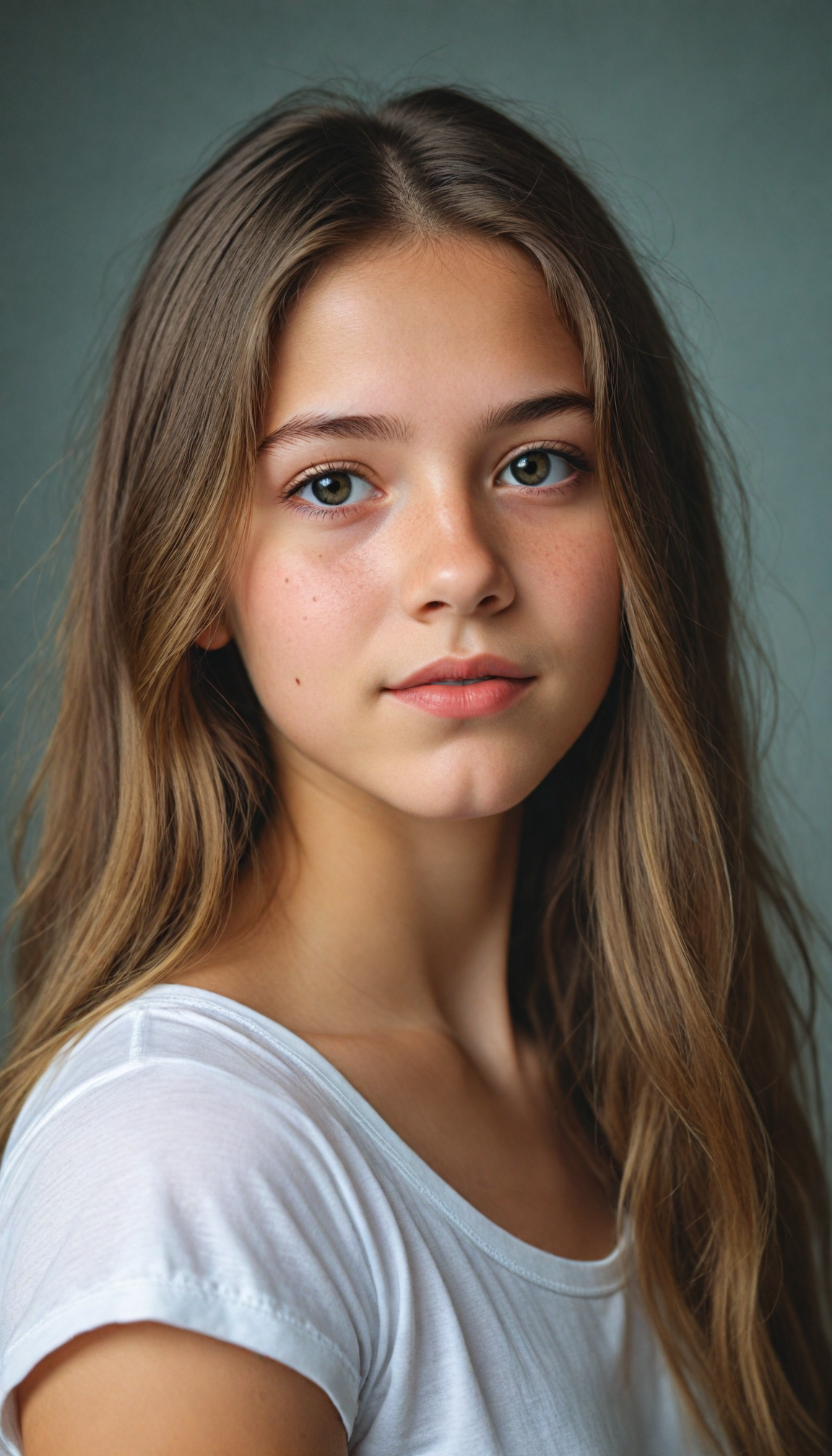 a hyper-realistic, intricately detailed portrait of a captivating young girl with cascading, silky hair that shimmers under soft, natural light. Her gentle gaze meets the viewer’s eyes, radiating warmth and innocence. She is adorned in a whimsical white crop top embellished with delicate floral patterns, set against a dreamy pastel background that evokes a sense of serenity and youthfulness. Subtle hints of bokeh add a magical touch, enhancing the overall enchanting atmosphere of the scene